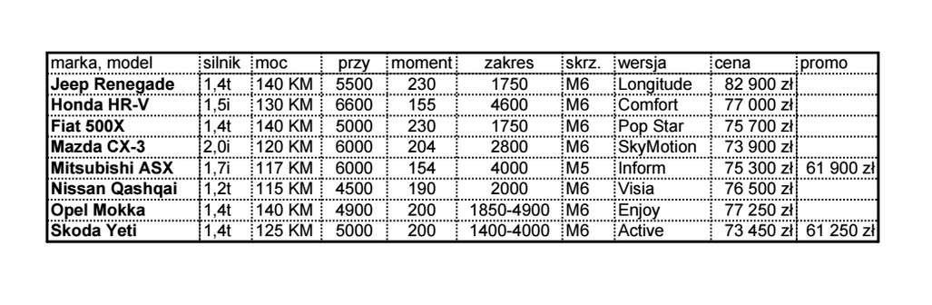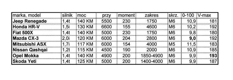 Moc silników waha się od 117 KM w Mitsubishi, do 140 KM w Jeepie, Fiacie i Oplu. Trzy samochody, Honda HR-V, Mazda CX-3 i Mitsubishi ASX napędzane są przez silniki wolnossące. Ciekawostką jest, że najlepsze osiągi odnotowała Mazda CX-3, swój sukces zawdzięcza w dużej mierze najniższej masie własnej.