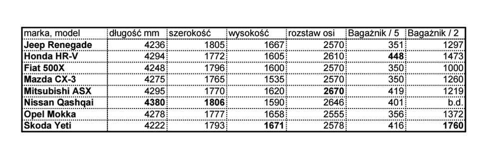 Długość nadwozia wszystkich modeli mieści się w przedziale 4,22-4,30 m. Spośród nich tylko Nissan jest nieco dłuższy mierząc wzdłuż 4,38 m. Rekordowo wysokie są w tym zestawieniu Jeep i Skoda. Mimo, że Honda HR-V nie jest rekordzistką w żadnej z tych dziedzin, to i tak odznacza się rekordowo wielkim bagażnikiem mieszczącym w podstawowej wersji 448 litrów. W dwóch bogatszych specyfikacjach kufer jest jeszcze większy mieszcząc 470 litrów bagażu (wg normy VDA). Po złożeniu oparcia tylnej kanapy Honda ustępuje objętością przestrzeni ładunkowej (1473 l) jedynie Skodzie Yeti (1760 l). Honda ma jednak asa w rękawie. Jest nim system foteli Magic Seats. Pozwala on podnieść siedzisko tylnej kanapy dając możliwość wykorzystania pełnej wysokości wnętrza do przewozu wyższych przedmiotów, np. drzewek w doniczkach. Podobnego rozwiązania nie oferuje żaden z konkurentów.