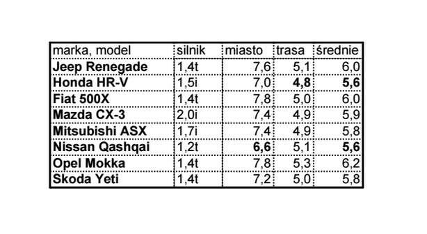 Mazda mimo lekkiej konstrukcji nie odnotowuje najniższych wyników spalania. W tej dziedzinie najlepsze okazują się dwa samochody, Honda i Nissan. W warunkach miejskich najniższą wartość (wg danych producenta) notuje Nissan Qashqai – 6,6 l/100 km. Za nim plasuje się Honda z wynikiem 7,0 l/100 km. W trasie różnice pomiędzy wszystkimi konkurentami okazały się niewielkie, pomiędzy skrajnymi wynikami jest zaledwie 0,5 litra różnicy. Najbardziej oszczędna okazuje się Honda HR-V zużywając średnio 4,8 l/100 km. W dziedzinie średniego spalania ponownie Honda ściera się z Nissanem. Obydwa crossovery są oszczędniejsze od konkurencji zajmując ex aequo pierwsze miejsce z wynikiem 5,6 l/100 km.
