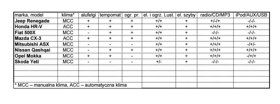 Zadanie jest dość proste. Zbieramy kilka aut zbliżonych do HR-V ceną, wymiarami oraz wersją silnikową i sprawdzamy które z nich wypadają najlepiej. Pod lupę znalazły się wymiary nadwozia, osiągi, a także wyposażenie, które postaraliśmy się odnieść do proponowanej przez importera ceny zakupu.