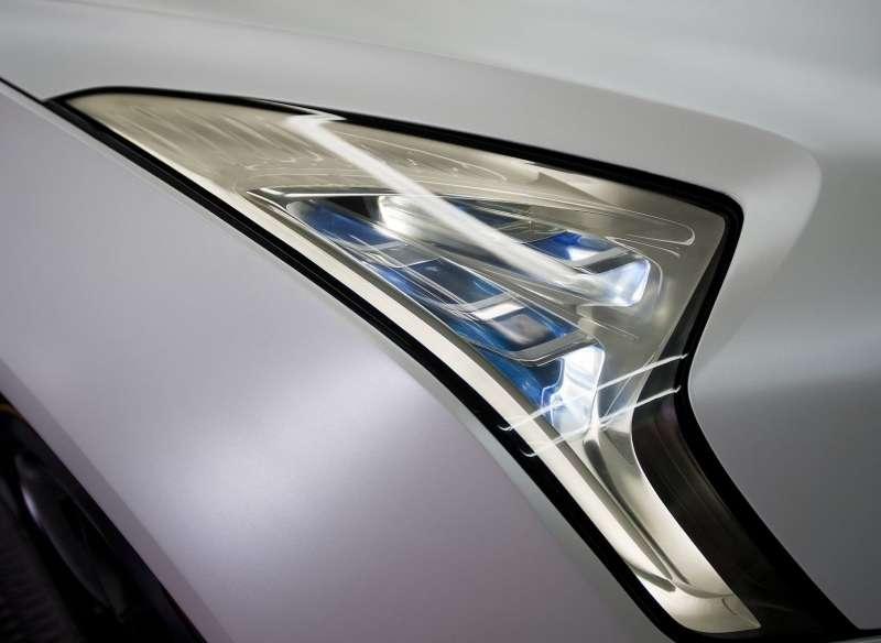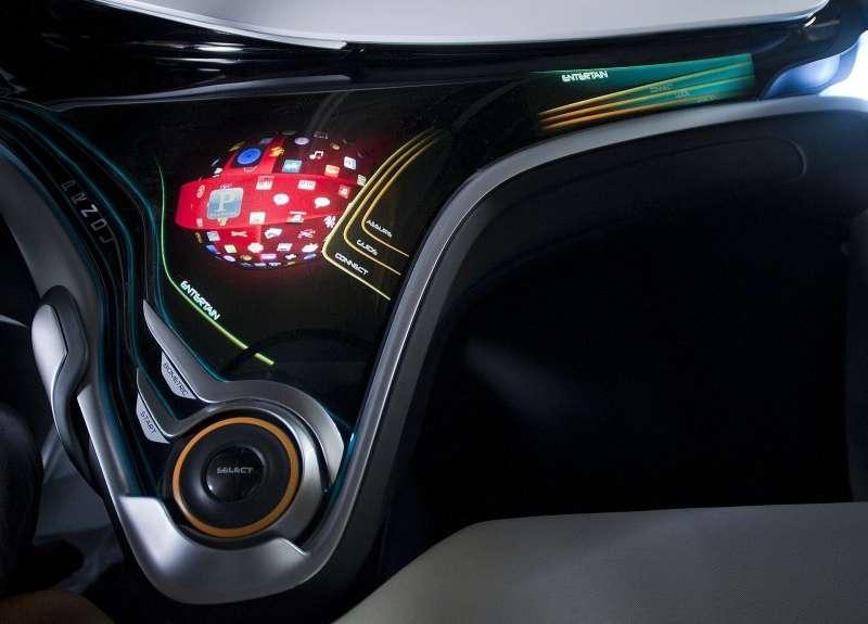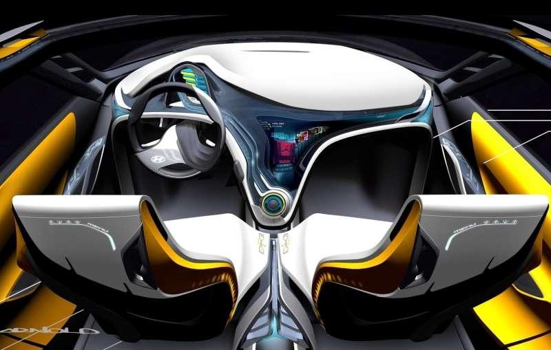 Samochód jest pięciodrzwiowy. Tylne drzwi są niewielkie, otwierane do tyłu kiedy przednie są już otwarte, aby ułatwić wsiadanie na tylną kanapę. W samochodzie nie ma słupka B, więc otwierane na dwie strony drzwi tworzą duże wejście. Drzwi nie mają klamek, otwiera się je dotykając touchpada, podobnie jak klapa bagażnika. Wnętrze samochodu także ma wiele dotykowych obszarów. Cała deska rozdzielcza to w zasadzie wielki, pokryty akrylem dotykowy ekran z ciekawymi ikonami aplikacji. Touchpady zastępują również elementy otwierania okien na tapicerce drzwi. Znalazły się nawet na tylnej ściance przednich foteli. Dzięki czemu pasażerowie mogą sterować elementami systemu teleinformatycznego, mając także do dyspozycji indywidualne ekrany w zagłówkach przednich foteli. Mogą np. słuchać stacji radiowych dostępnych w ramach internetowej aplikacji Pandora, którą wykorzystuje w USA około 65 milionów słuchaczy. Dostępna jest także aplikacja Hyundai Blue Link. Tablica rozdzielcza, będąca częścią dotykowego panelu deski rozdzielczej jest dość nietypowa i nie wydaje siłę zbyt czytelna. Na szczęście auto ma także HUD, czyli Head Up Display, wyświetlający najważniejsze informacji na szybie przed oczyma kierowcy. Zwykle HUD pokazuje tylko najważniejsze dla jazdy informacje, w tym samochodzie pełni rolę najważniejszego ekranu. Pokazuje także obraz z umieszczonych w górnej części drzwi kamer, które zastępują boczne lusterka, a także wskazania nawigacji satelitarnej, internetowe aplikacje oraz obraz połączeń wideotelefonicznych.