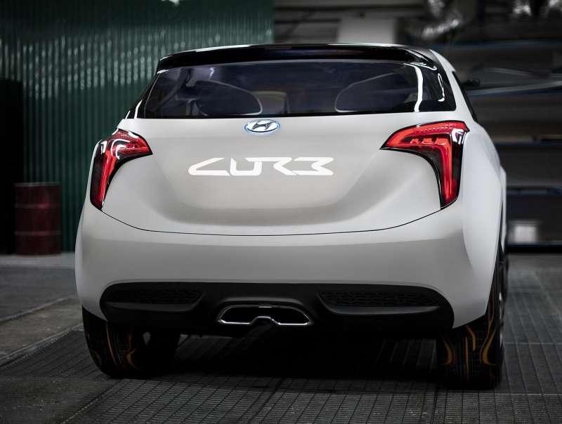 Samochód ma zwartą bryłę o masywnych błotnikach, mocnej atrapie chłodnicy i stosunkowo niskim dachu. Styliści Hyundaia po raz kolejny sięgnęli do motocyklowych inspiracji wyraźnie upodobniając układ okien auta do szybki kasku motocyklisty. Bardzo ciekawe formy przyjęły światła. Przednie i tylne lampy są oparte o diody LED, co pozwoliło nadać im wyjątkowy, wąski kształt. Najciekawszy jest jednak świecący blady błękitem napis Curb na klapie bagażnika. Kiedy jest wyłączony w tym miejscu nic nie widać – diody są ukryte pod lakierem. Podświetlane diodami są także znaki Hyundaia na atrapie chłodnicy i klapie bagażnika oraz poziome światła do jazdy dziennej w przednim zderzaku. Ciekawym akcentem jest szeroka, dwudzielna końcówka układu wydechowego, umieszczona w centrum dyfuzora w dolnej części masywnego tylnego zderzaka. To jednak nie tylko zabieg stylistyczny. Końcówkę wydechu przystosowano do montowania bagażnika na miejski rower. Jeżeli trzeba zaparkować gdzieś dalej od punktu docelowego, co w warunkach zatłoczonych miast jest coraz częstsze, kierowca może ostatni etap podróży odbyć na rowerze. Wysuwane miejsca mocowania bagażnika na rower zostały także zamontowane w dachu samochodu. Z przodu zrezygnowano z wydzielonego zderzaka – stanowi on jedną całość z przednimi błotnikami.