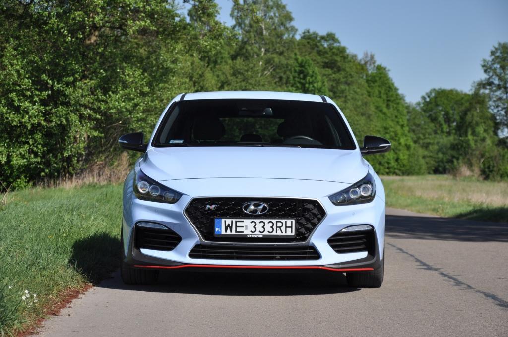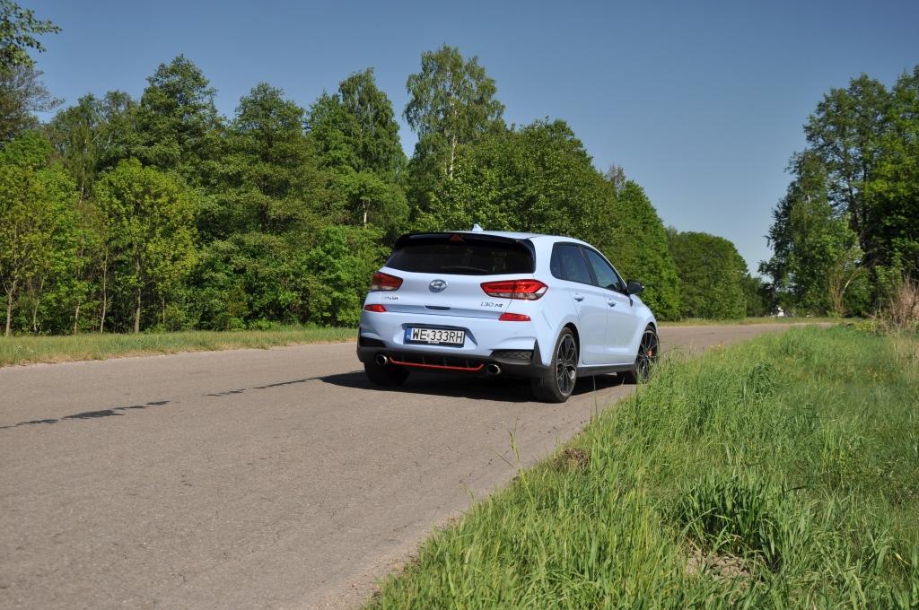 Odpowiedź na pytanie: jak jeździ i30N, nie jest więc łatwa, bo każde ustawienie ma swoją charakterystykę. W „normalu” to zwarty samochód o doskonałych osiągach. Moc 275 KM i moment 353 Nm gwarantują doskonałe osiągi. Dwulitrowy silnik doładowany jest turbosprężarką typu twin-scroll i ciągnie od niskich obrotów. Zjawisko turbodziury praktycznie nie występuje. Kierowca wie, że zawsze w zanadrzu czeka odpowiedni zapas mocy, by nie stresować się np. podczas manewrów wyprzedzania. Zawieszenie jest na tyle „odprężone”, by jazda po polskich prowincjonalnych połatanych drogach nie była męcząca. Układ kierowniczy, choć ma cudownie krótkie przełożenie, w najbardziej lajtowym ustawieniu tak dozuje siłę wspomagania, by długa podróż nie męczyła kierowcy. Układ wydechowy jest mocno przytłumiony, można wręcz powiedzieć że zbyt cichy.