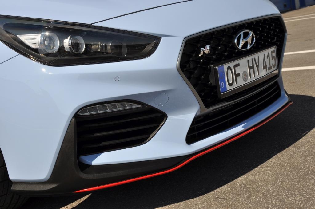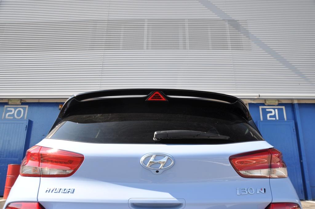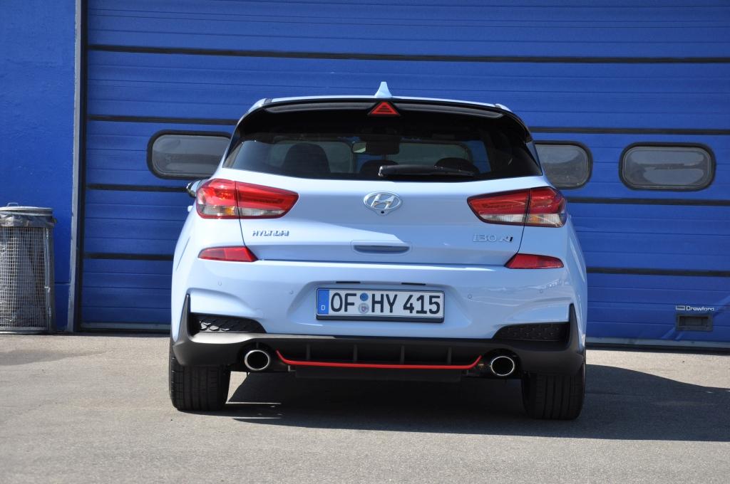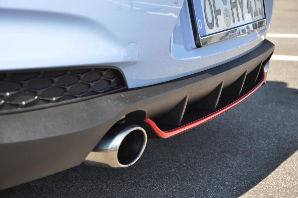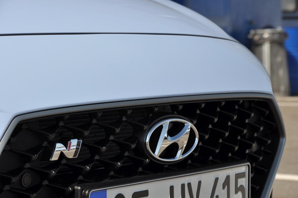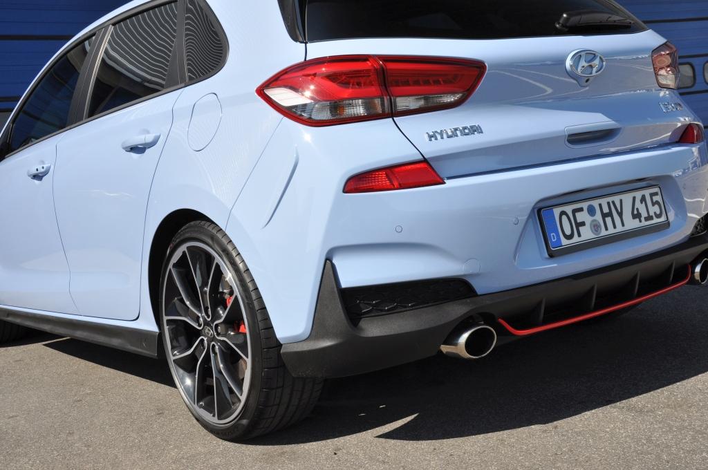 W stosunku do takich (choć nie bezpośrednich) konkurentów jak Civic Type-R, nowy Hyundai wydaje się grzecznym chłopcem z elegancko przystrzyżoną fryzurą, zaczesaną na bok. Nadwozie posiada poszerzone błotniki, ale najłatwiej zauważyć to, porównując N-kę z bazową wersją i stawiając je obok siebie. Przednie lampy są przydymione, zderzaki są inne (przedni posiada większe wloty powietrza, tylnego nie ozdobiono atrapą dyfuzora), za to spod niego wyzierają dwie końcówki sportowego wydechu, oddzielone czerwoną listwą w dolnej partii. Całe nadwozie posiada czarne elementy wykończeniowe. Największe wrażenie robi trójkątne trzecie światło stopu zamontowane na tylnym spojlerze, przywodzące na myśl bolidy F1.