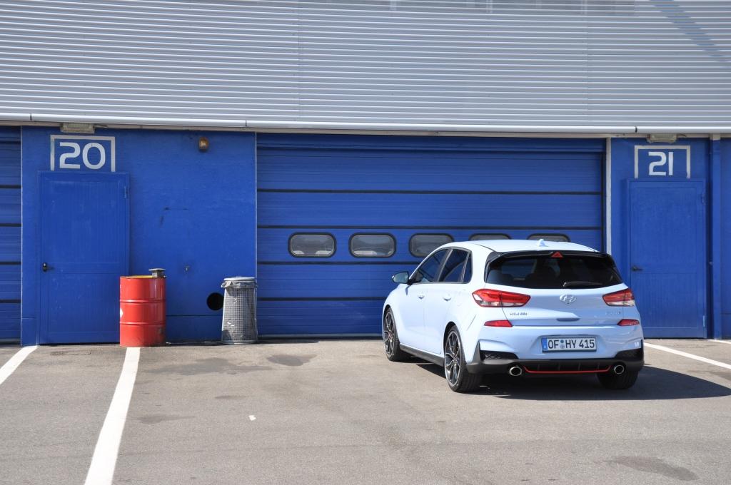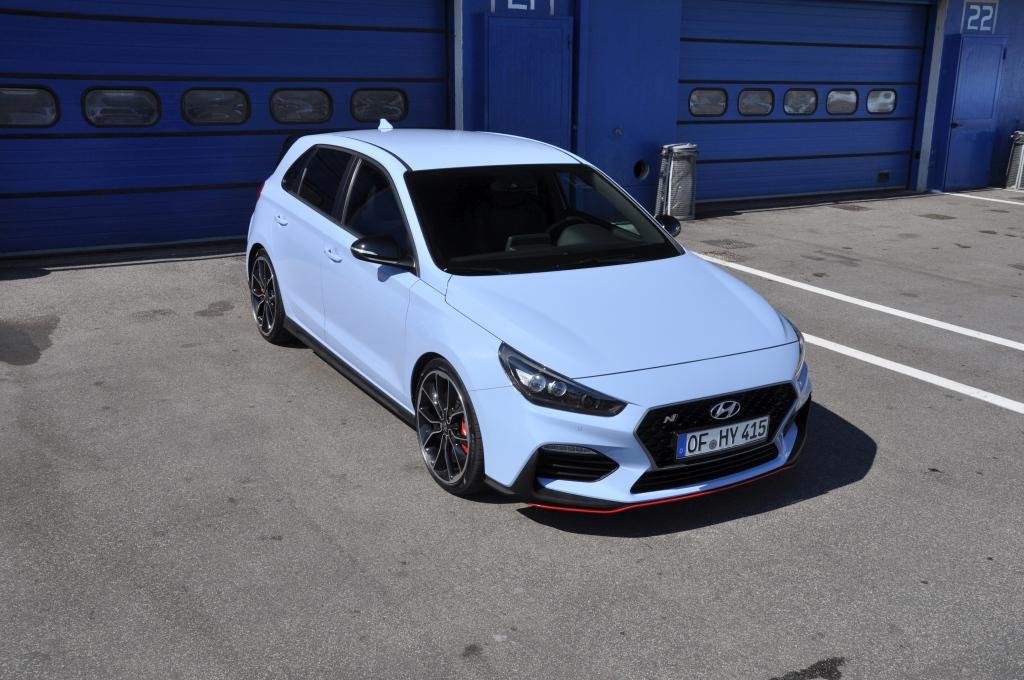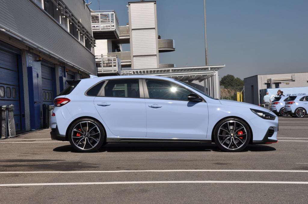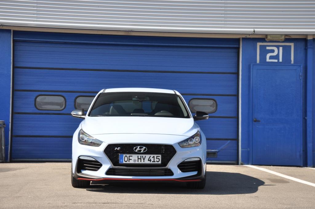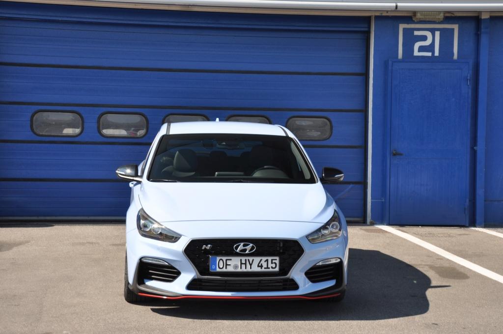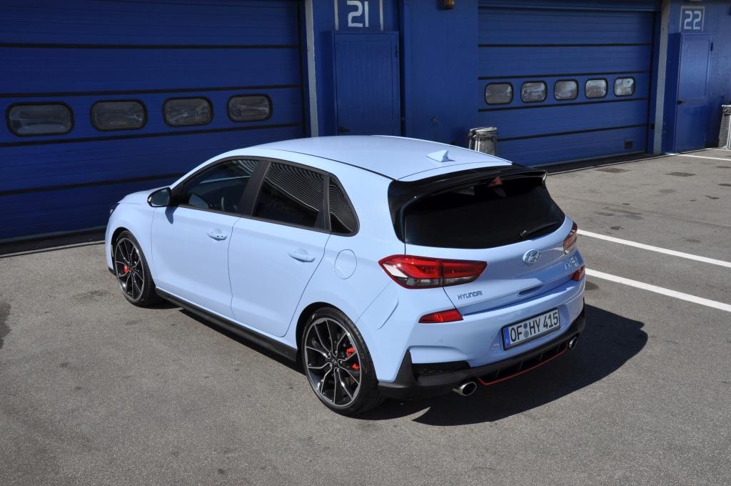 W stosunku do takich (choć nie bezpośrednich) konkurentów jak Civic Type-R, nowy Hyundai wydaje się grzecznym chłopcem z elegancko przystrzyżoną fryzurą, zaczesaną na bok. Nadwozie posiada poszerzone błotniki, ale najłatwiej zauważyć to, porównując N-kę z bazową wersją i stawiając je obok siebie. Przednie lampy są przydymione, zderzaki są inne (przedni posiada większe wloty powietrza, tylnego nie ozdobiono atrapą dyfuzora), za to spod niego wyzierają dwie końcówki sportowego wydechu, oddzielone czerwoną listwą w dolnej partii. Całe nadwozie posiada czarne elementy wykończeniowe. Największe wrażenie robi trójkątne trzecie światło stopu zamontowane na tylnym spojlerze, przywodzące na myśl bolidy F1.