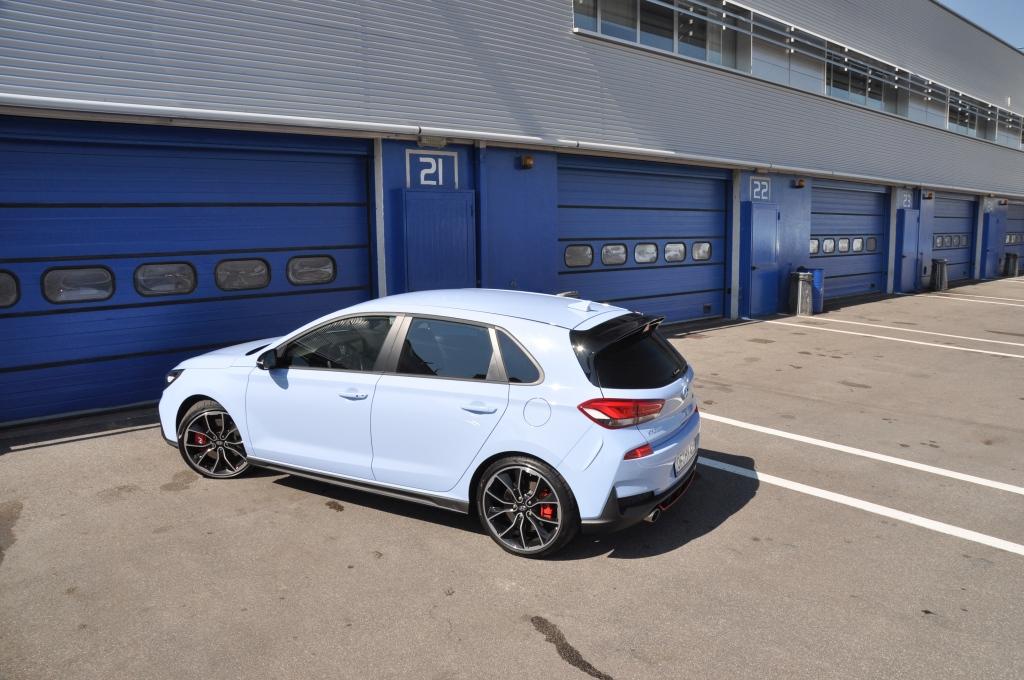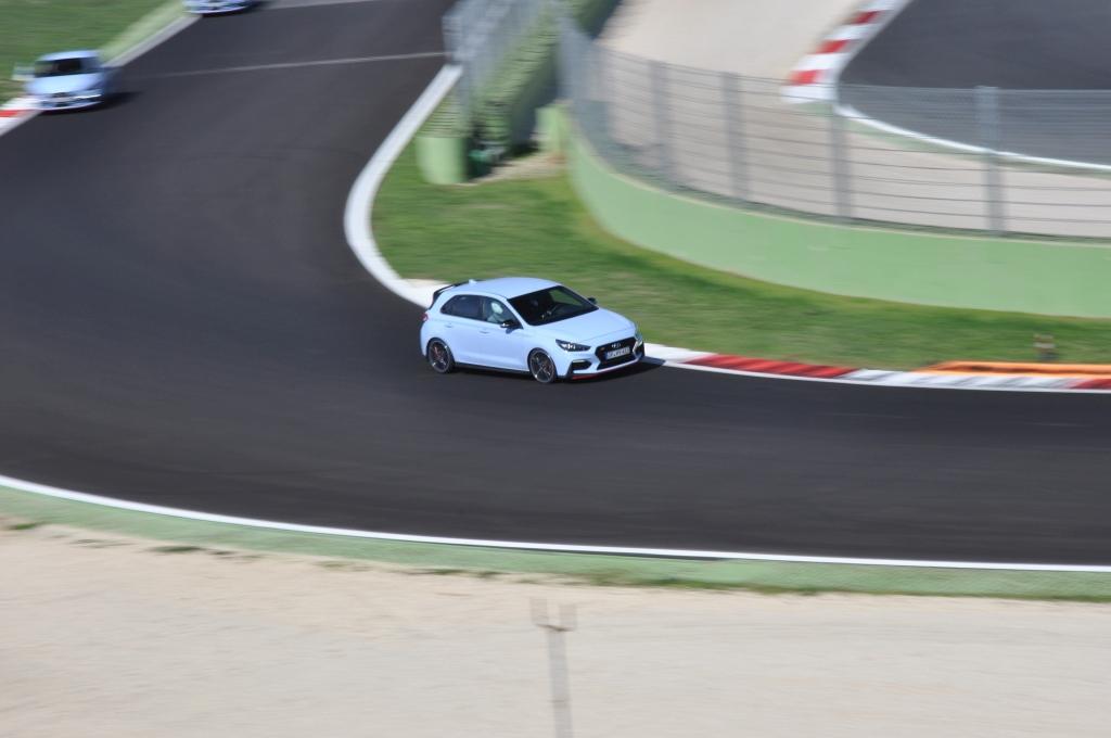 Jazda po torze pokazała jeszcze coś ciekawego. Samochód na szybkich łukach zachowuje się bardzo stabilnie, a podsterowność jest minimalna i występuje bardzo późno. To oczywiście zasługa elektronicznie sterowanej szpery, ale też zestrojenia podwozia. Inżynierowie otrzymali zadanie dopracowania go do tego stopnia, by elektroniczne systemy czuwające włączały się do gry jedynie w ostateczności. I to się udało. Jazda po torze na 100% możliwości… kierowcy pokazała, że i30N potrafi dawać z siebie wszystko przy wciąż działającym układzie kontroli stabilności ESC. Żółta kontrolka rzeczywiście włącza się tylko, gdy mocno przesadzimy i komputer uzna, że pora nam pomóc. Cała reszta też zdała egzamin, hamulce wytrzymują po kilka okrążeń naraz, układ kierowniczy ma krótkie przełożenie (2,14 obrotu pomiędzy skrajnymi położeniami) i specjalne wspomaganie R-MDPS o szybkim czasie reakcji, auto świetnie się prowadzi, a na tablicy przyrządów umieszczono diodowy wskaźnik pomagający wyczuć moment, kiedy trzeba zmienić bieg. Wszystko przez podstawową wadę tego samochodu: układ wydechowy jest za cichy i szczególnie w warunkach torowych nie słychać wyraźnie, kiedy obroty dochodzą do czerwonego pola. Na drodze publicznej też wszystko gra, a zawieszenie nie jest za twarde. To dobra wiadomość, bo niektórzy konkurenci są za bardzo usztywnieni, przez co nieprzyjemni w prowadzeniu. W i30N mamy trzy poziomy tłumienia amortyzatorów (Comfort, Sport i Sport+), z których środkowy jest niezłym kompromisem do szybszej jazdy na co dzień.