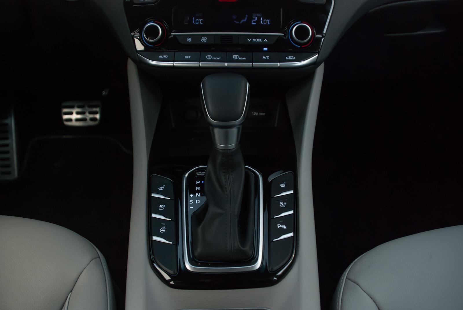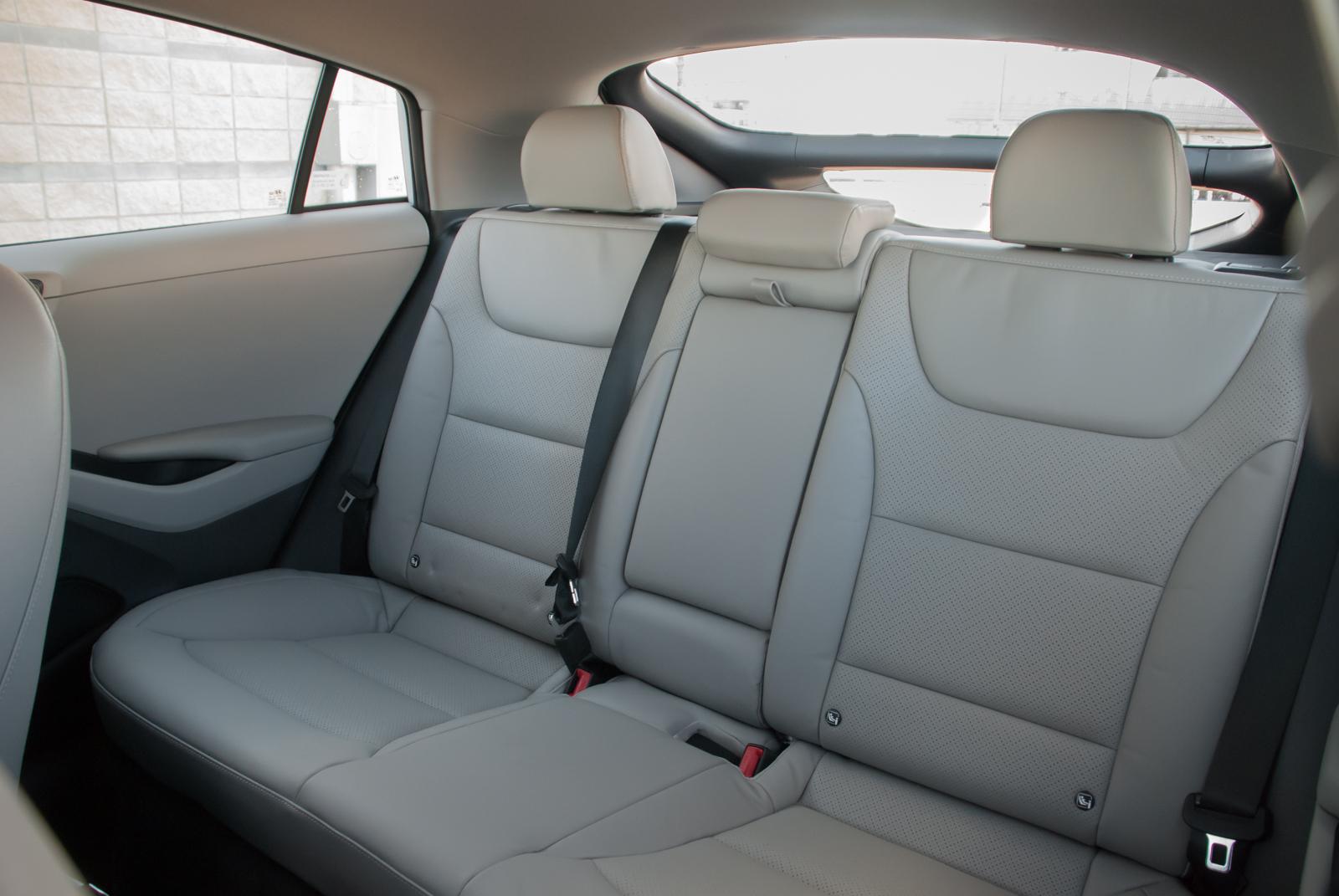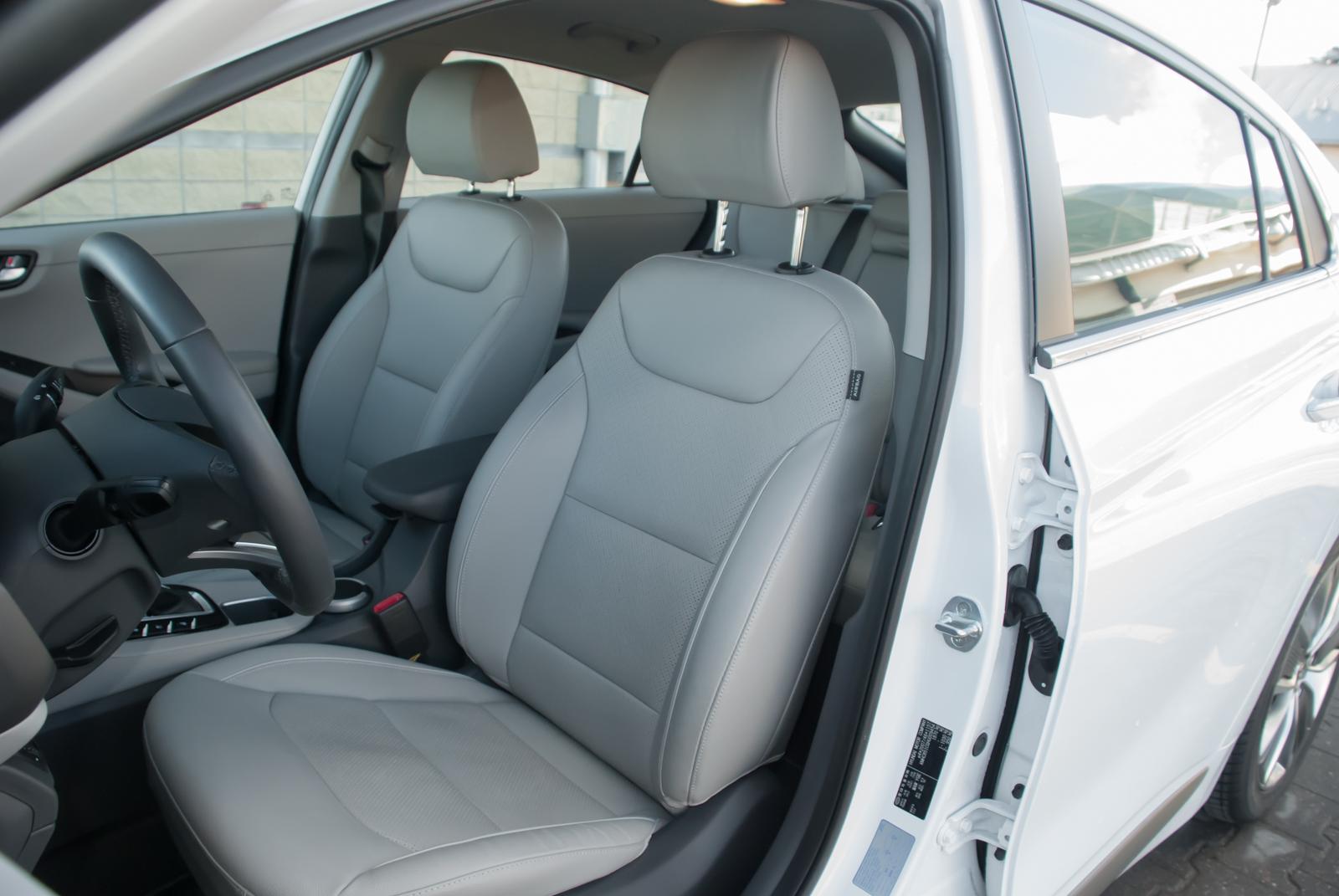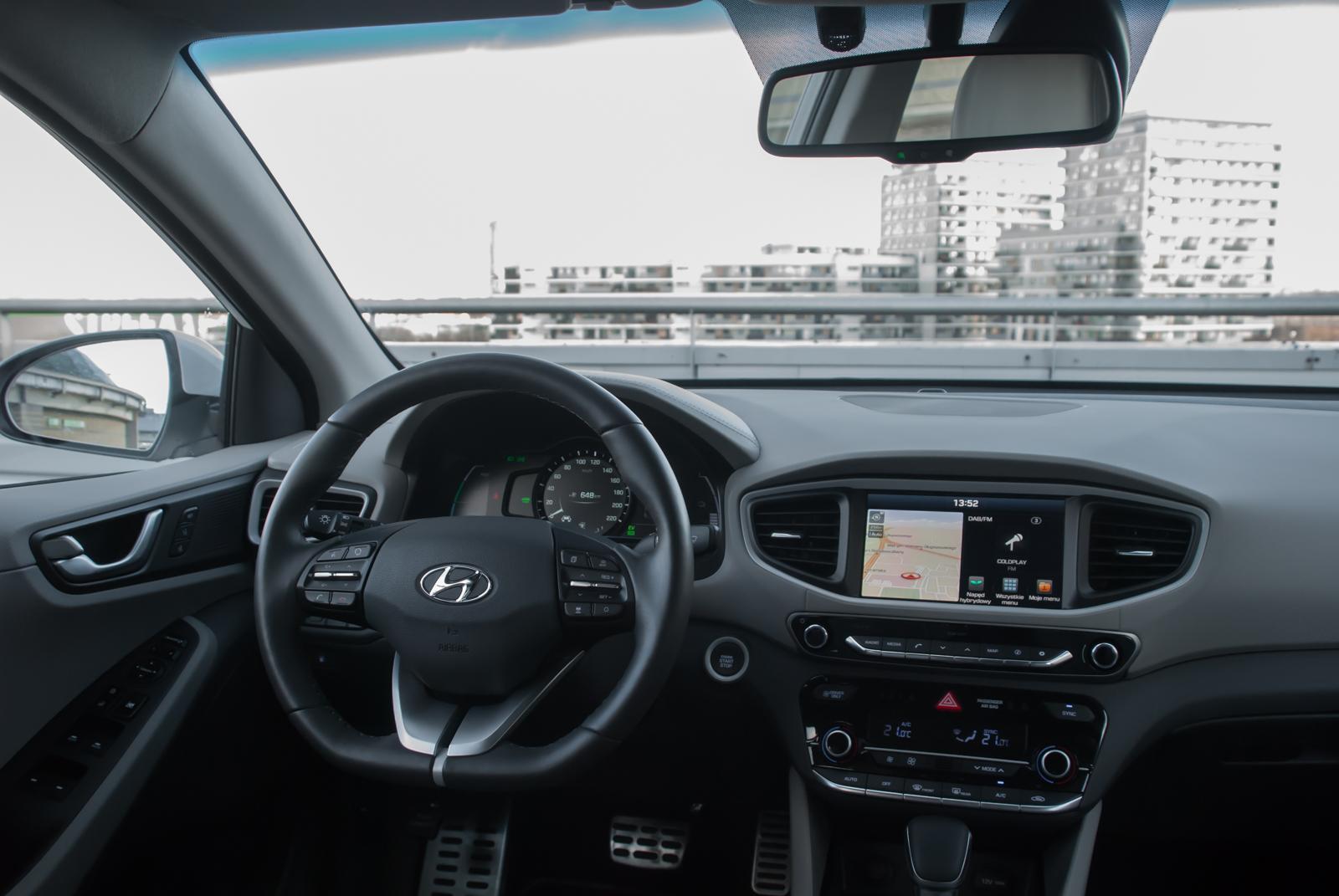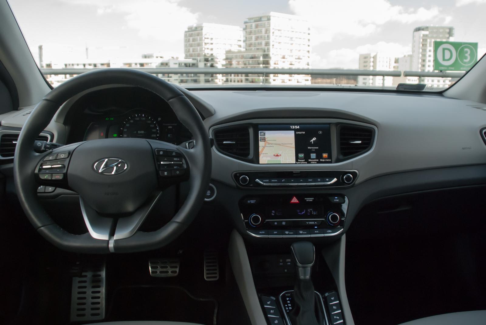 Wnętrze jest jasne i przejrzyste, choć niektóre materiały użyte do jego wykończenia pozostawiają nieco do życzenia. Beżowa skórzana tapicerka dobrze kontrastuje z ciemnoszarą deską rozdzielczą i czarnymi elementami wykończenia. Ioniq może zaprosić na pokład pięć osób, choć trójce dorosłych może nie być z tyłu zbyt wygodnie. Sadzając tam jedynie parę, zapewnimy im wygodną i komfortową podróż. Miejsca na nogi jest wystarczająco, a składany podłokietnik wyposażony jest w uchwyty na napoje.