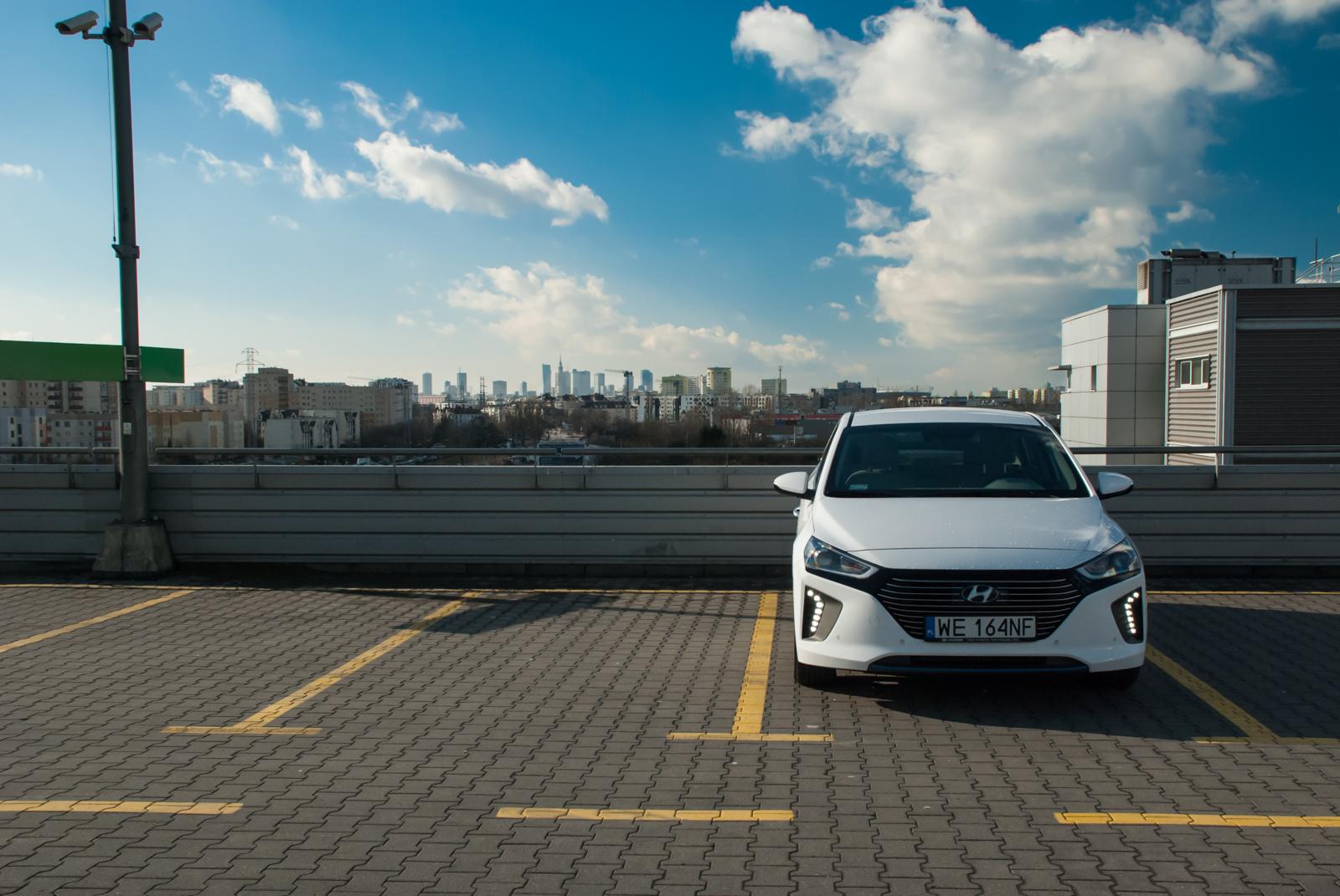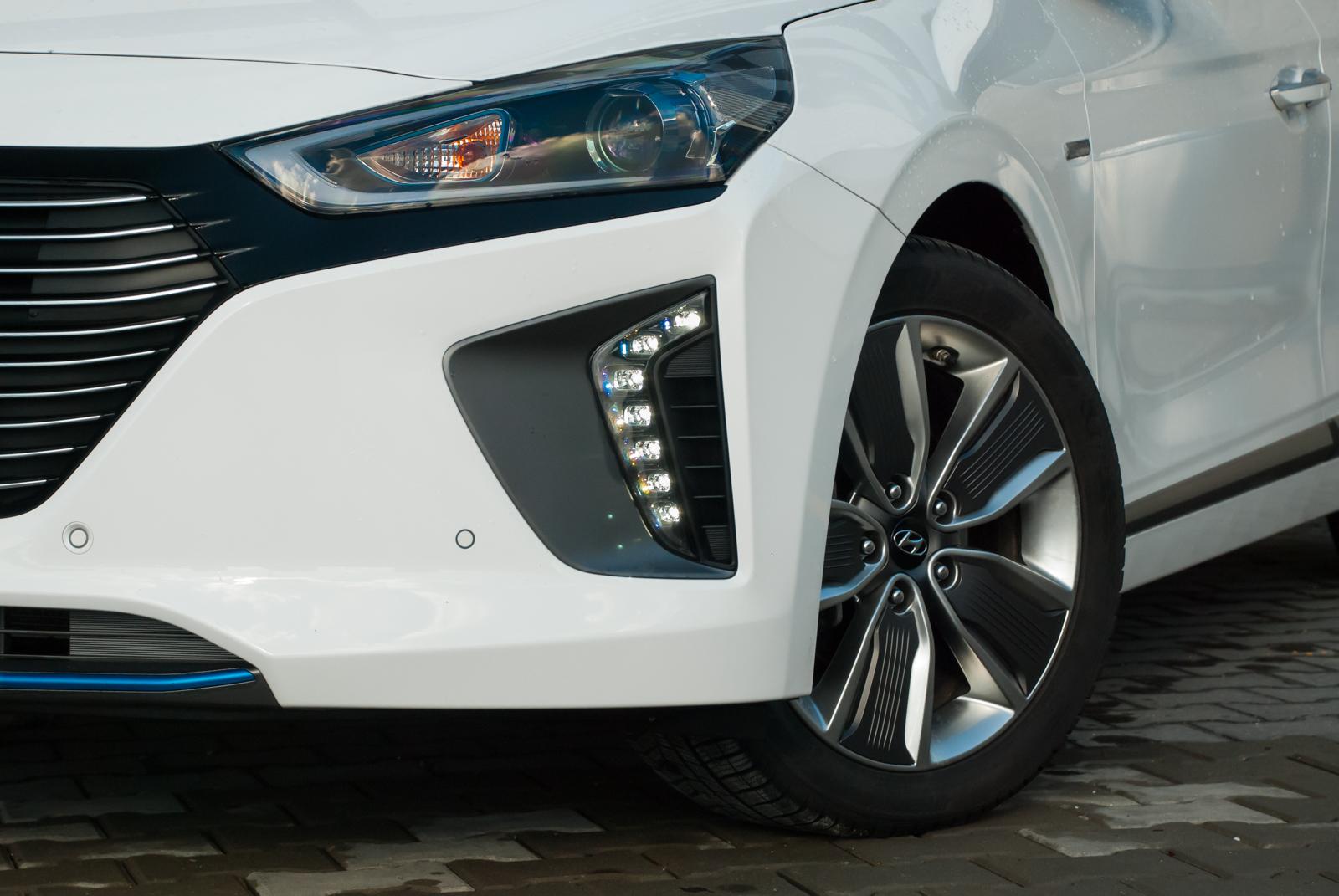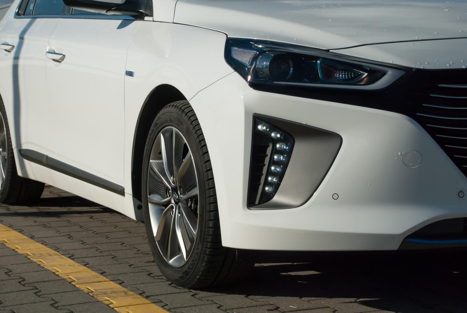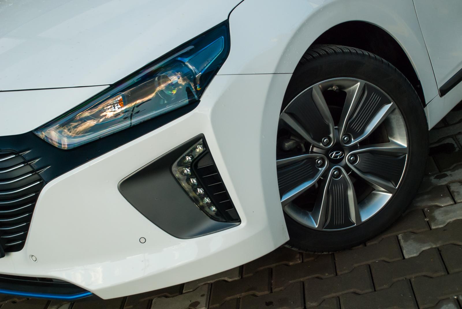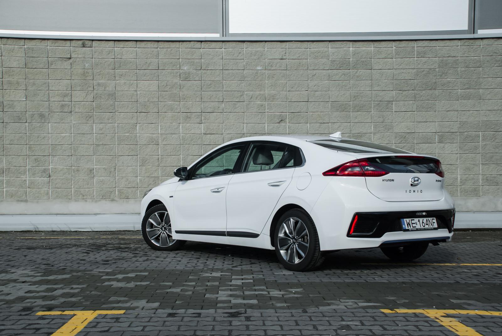 Trzeba przyznać, że przód Hyundai'a Ioniq jest miły dla oka. Dość wąskie reflektory w połączeniu z pionowymi światłami LED do jazdy dziennej sprawiają, że front wygląda nowocześnie, jak na auto XXI wieku przystało. Nieco gorzej jest z tyłu, który, delikatnie mówiąc, jest wzorowany na Toyocie Prius. Różnica tkwi w położeniu tylnych świateł – w japońskim konkurencie są niemal pionowe, a w Ioniqu przyjęto układ horyzontalny. Poza masywnym zderzakiem i dość pokaźną powierzchnią dolnej części tylnej klapy, podobieństwo tkwi także w dzielonej szybie. Swoją drogą trudno znaleźć logiczne uzasadnienie takiego rozwiązania. Część szyby jest skośna, jak na liftbacka przystało. Poniżej umieszczono poprzeczkę i jeszcze jedno małe „okienko”. Rozwiązanie to jest o tyle bez sensu, że przy deszczowej pogodzie wystarczy przejechać kilkanaście kilometrów, by dolna szyba zaczęła przypominać tekturę. A tylnej wycieraczki w Ioniqu nie znajdziemy. Problem brudu dotyka także kamery cofania. Wystarczy przejechać krótki odcinek podczas brzydkiej pogody i możemy polegać jedynie na czujnikach parkowania.