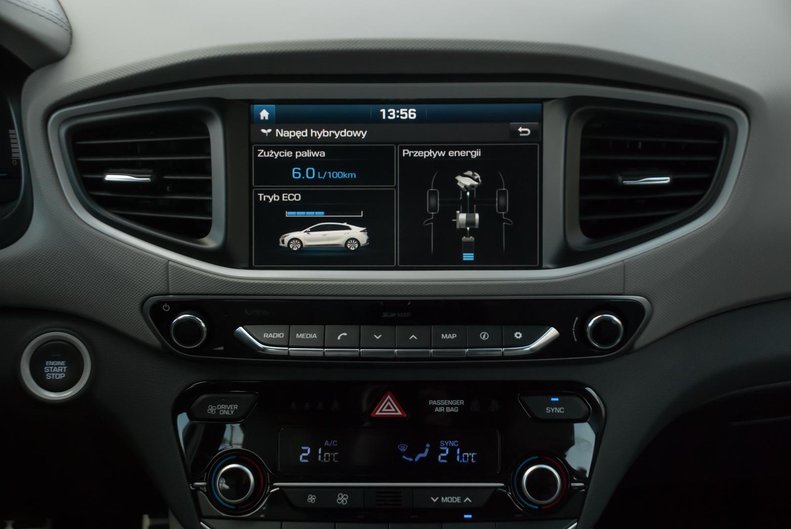 Jak na hybrydę przystało, Ioniq nie grzeszy paliwożernością. Przy dynamicznej jeździe po mieście, średnie zużycie paliwa wyniosło 5,2 litra na 100 kilometrów. Dzięki temu na pełnym zbiorniku, którego objętość wynosi niepozorne 45 litrów, przejedziemy nawet 900 kilometrów. A producent deklaruje zużycie miejskie paliwa, wynoszące nawet 3,5 litra. Realnie może to być około 4,5 l/100 km.