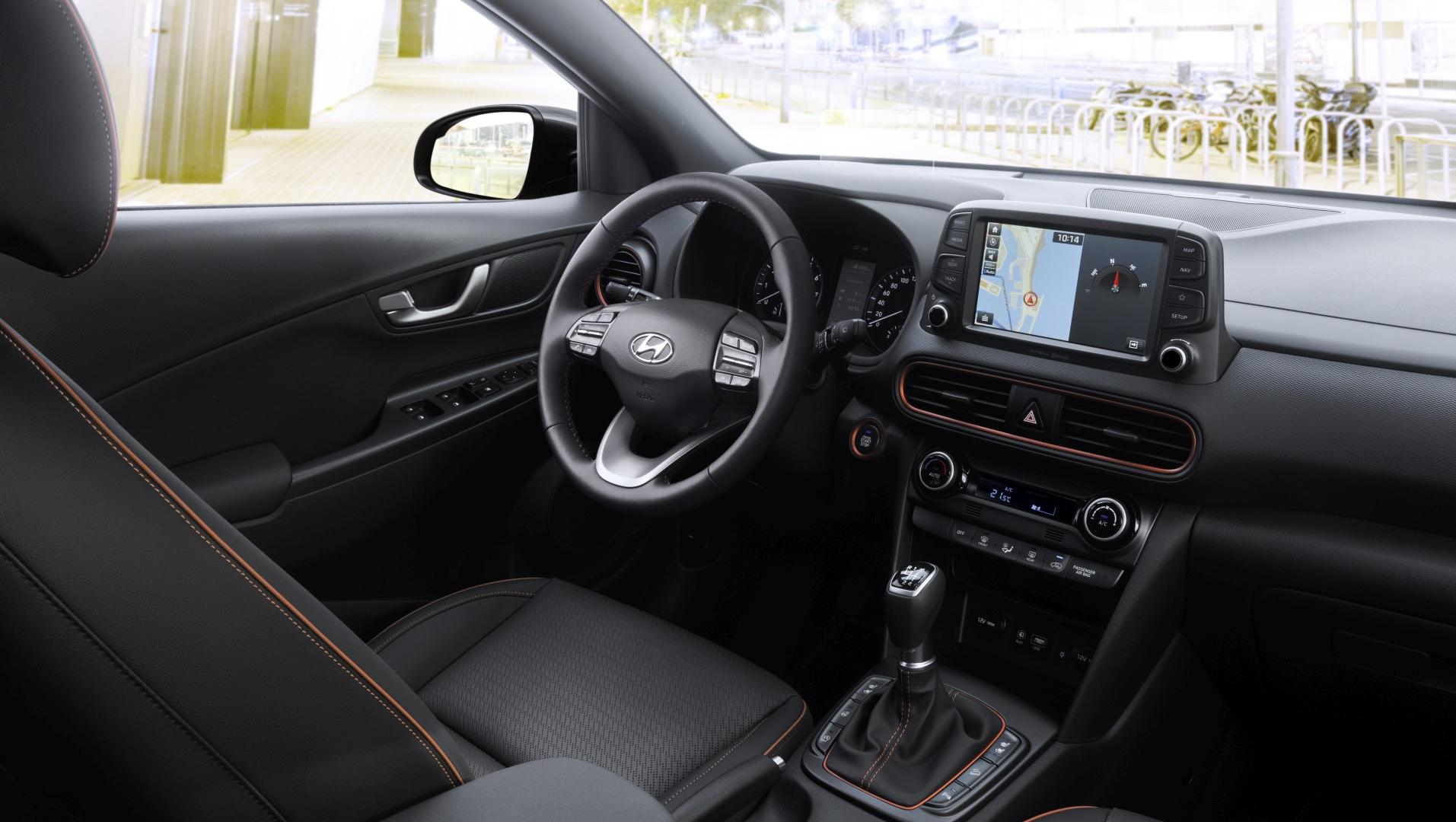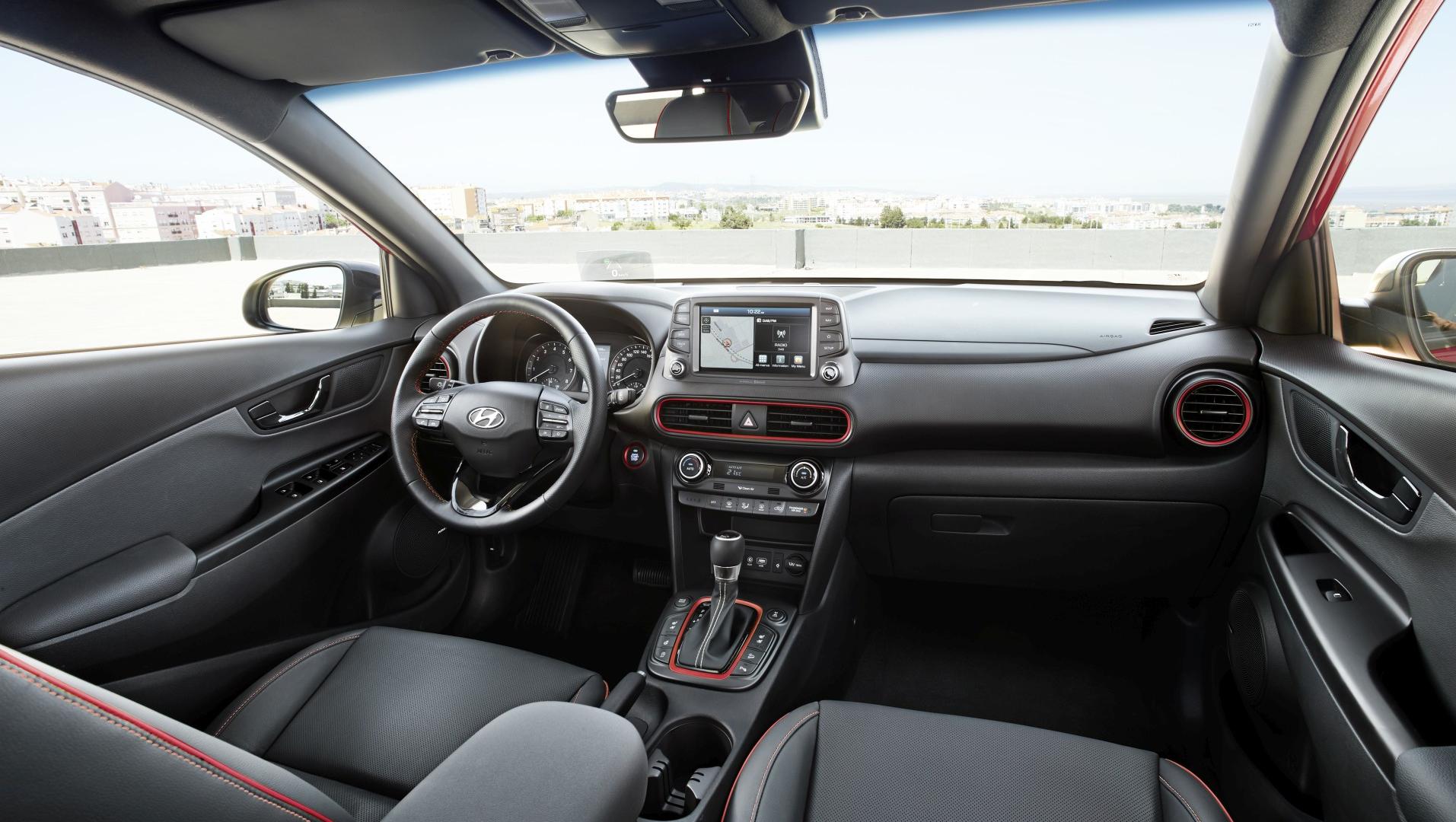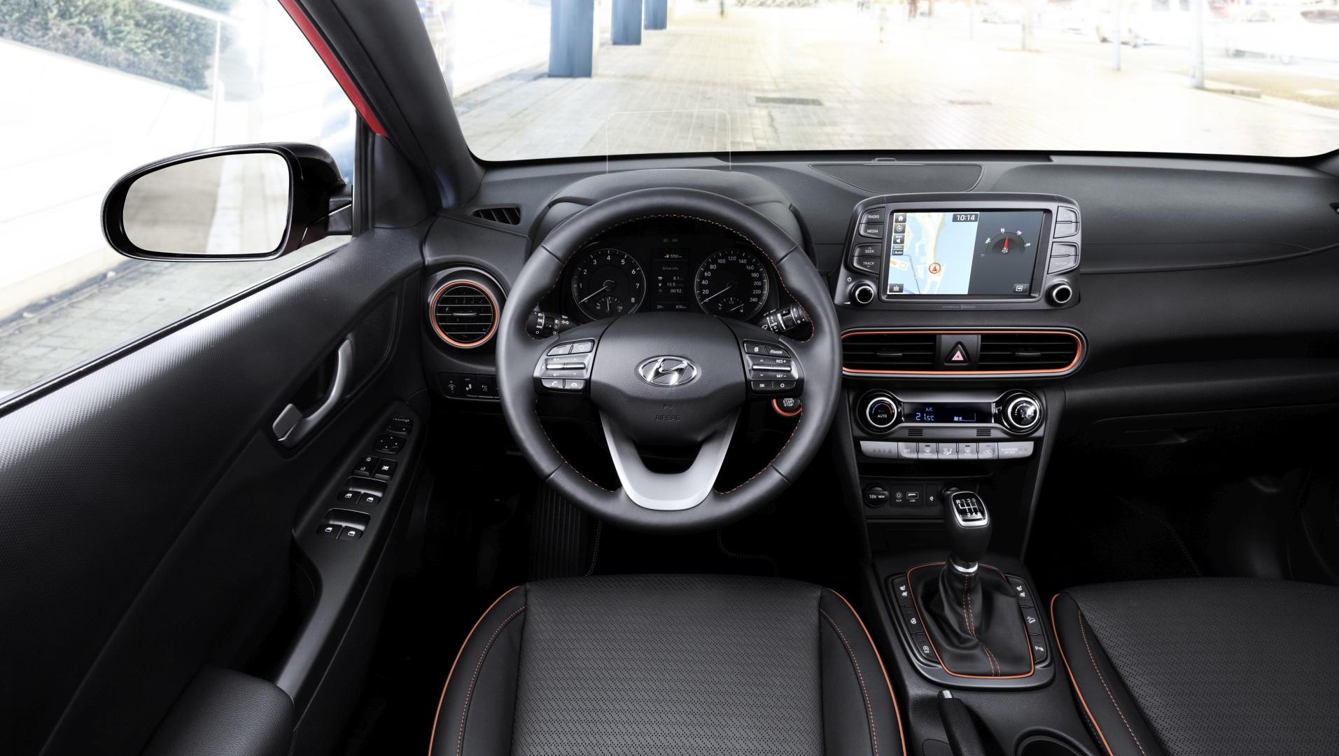 Otwierając drzwi nowego Hyundaia, zszokowani pierwszym wrażeniem, moglibyśmy spodziewać się kontynuacji stylistycznych fajerwerków. Ale to, co na zewnątrz szokowało niemal niewidoczne jest we wnętrzu. Deska rozdzielcza, kierownica, zegary – to wszystko wygląda bardzo prosto i klasycznie, i gdyby nie kilka elementów „ożywiających”, można byłoby powiedzieć: nudno. W tej kwestii postawiono przede wszystkim na funkcjonalność i ergonomię. Ekran multimedialny został umieszczony wysoko, niemal ponad deską rozdzielczą, przez co jest doskonale widoczny w trakcie jazdy i nie wymusza szukania wzrokiem wyświetlanych na nim informacji. Ekran ma przekątną ośmiu cali i za jego pomocą obsługiwać można np. połączony z samochodem telefon przez system Bluetooth lub za pośrednictwem Apple CarPlay czy Android Auto. Fabryczna nawigacja posiada system informowania o korkach w trakcie jazdy oraz bezpłatną aktualizację map przez 7 lat. Pod ekranem można zauważyć pierwszy kolorowy akcent – wokół nawiewów umieszczono dekor lakierowany pod kolor nadwozia. Akcenty w tym samym kolorze znajdują się wokół skrzyni biegów, przycisku uruchamiającego silnik, a także na kierownicy i fotelach (kontrastowe przeszycia).