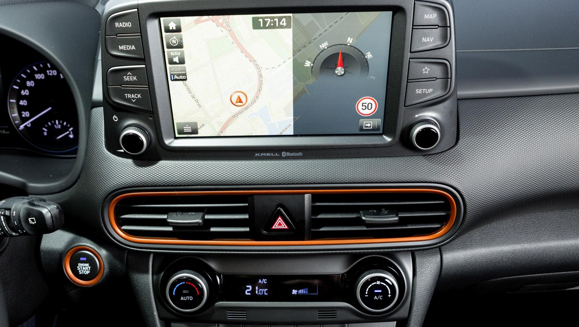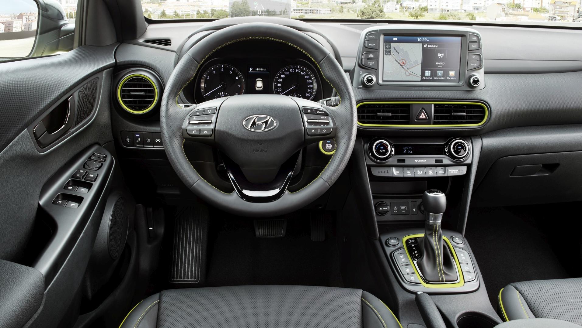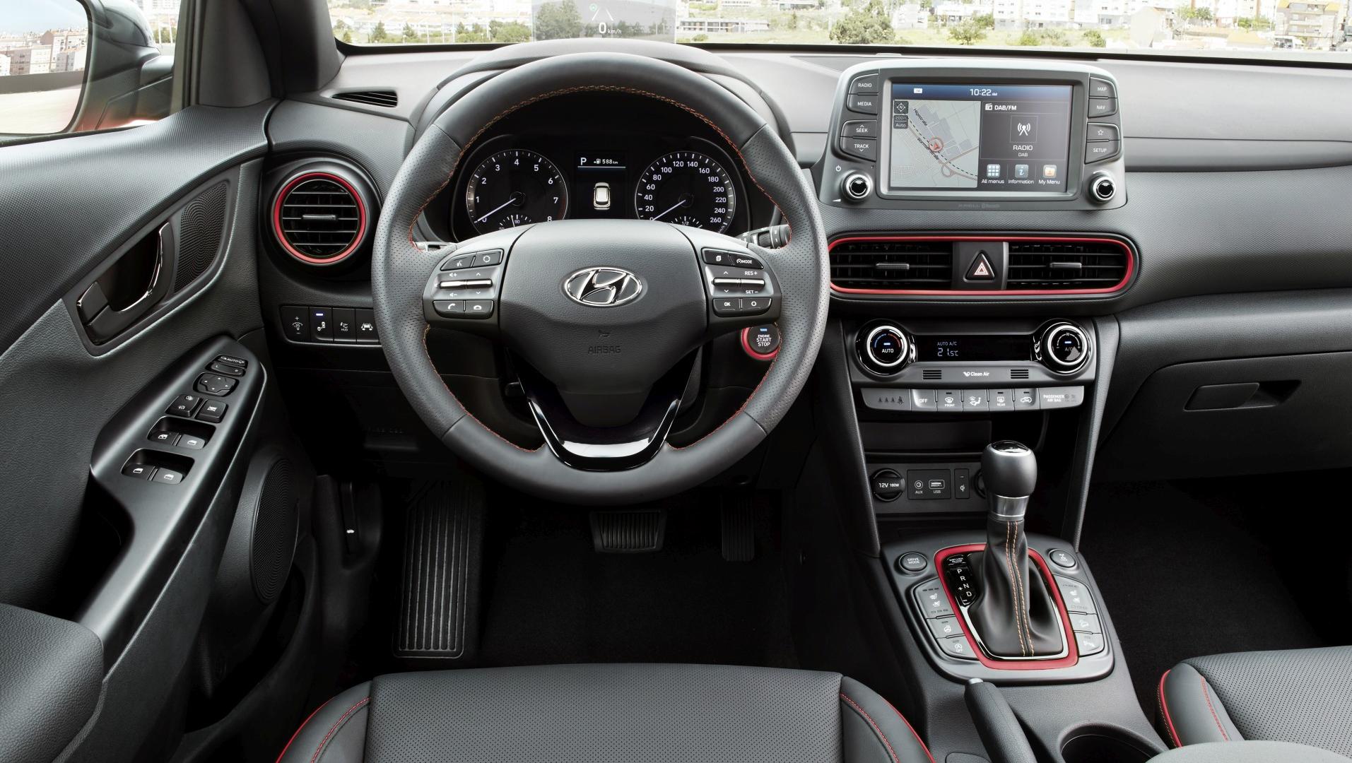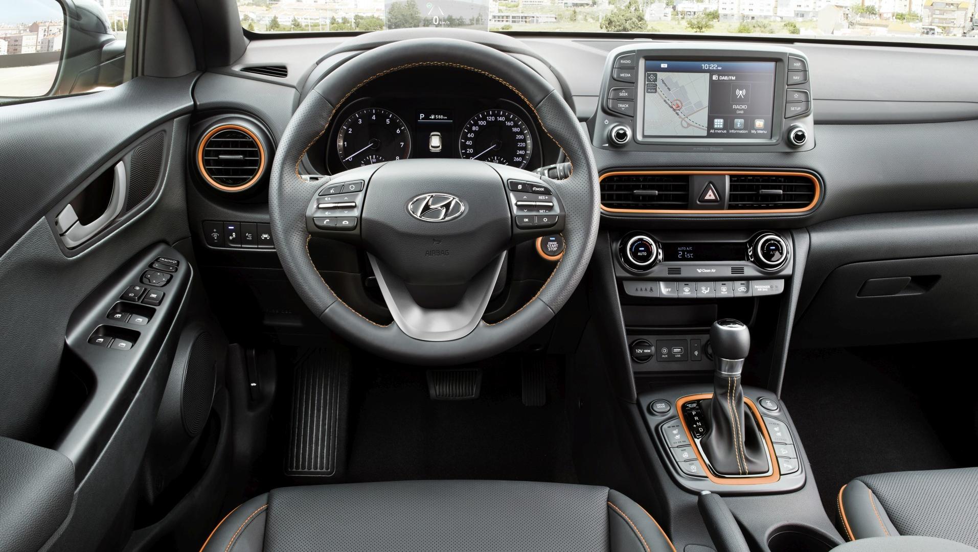 Otwierając drzwi nowego Hyundaia, zszokowani pierwszym wrażeniem, moglibyśmy spodziewać się kontynuacji stylistycznych fajerwerków. Ale to, co na zewnątrz szokowało niemal niewidoczne jest we wnętrzu. Deska rozdzielcza, kierownica, zegary – to wszystko wygląda bardzo prosto i klasycznie, i gdyby nie kilka elementów „ożywiających”, można byłoby powiedzieć: nudno. W tej kwestii postawiono przede wszystkim na funkcjonalność i ergonomię. Ekran multimedialny został umieszczony wysoko, niemal ponad deską rozdzielczą, przez co jest doskonale widoczny w trakcie jazdy i nie wymusza szukania wzrokiem wyświetlanych na nim informacji. Ekran ma przekątną ośmiu cali i za jego pomocą obsługiwać można np. połączony z samochodem telefon przez system Bluetooth lub za pośrednictwem Apple CarPlay czy Android Auto. Fabryczna nawigacja posiada system informowania o korkach w trakcie jazdy oraz bezpłatną aktualizację map przez 7 lat. Pod ekranem można zauważyć pierwszy kolorowy akcent – wokół nawiewów umieszczono dekor lakierowany pod kolor nadwozia. Akcenty w tym samym kolorze znajdują się wokół skrzyni biegów, przycisku uruchamiającego silnik, a także na kierownicy i fotelach (kontrastowe przeszycia).