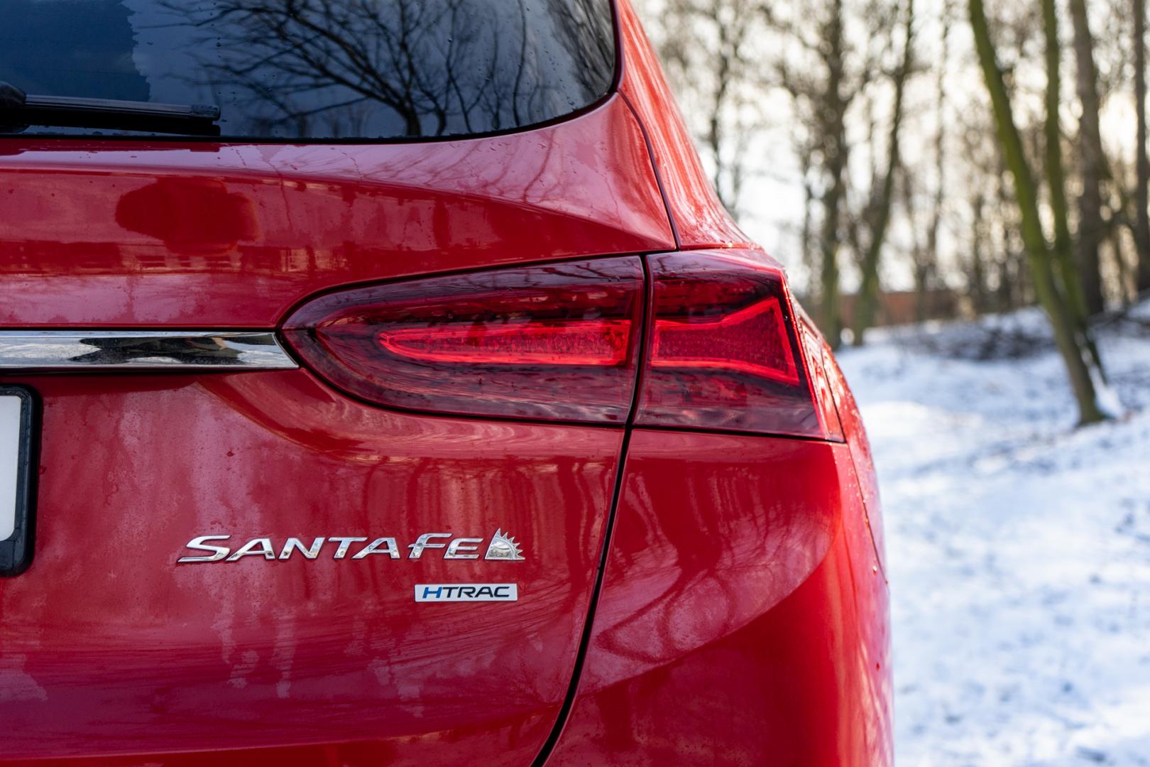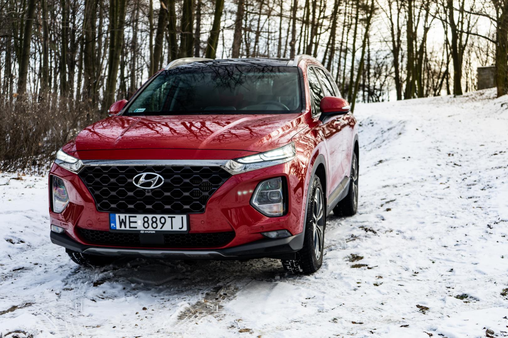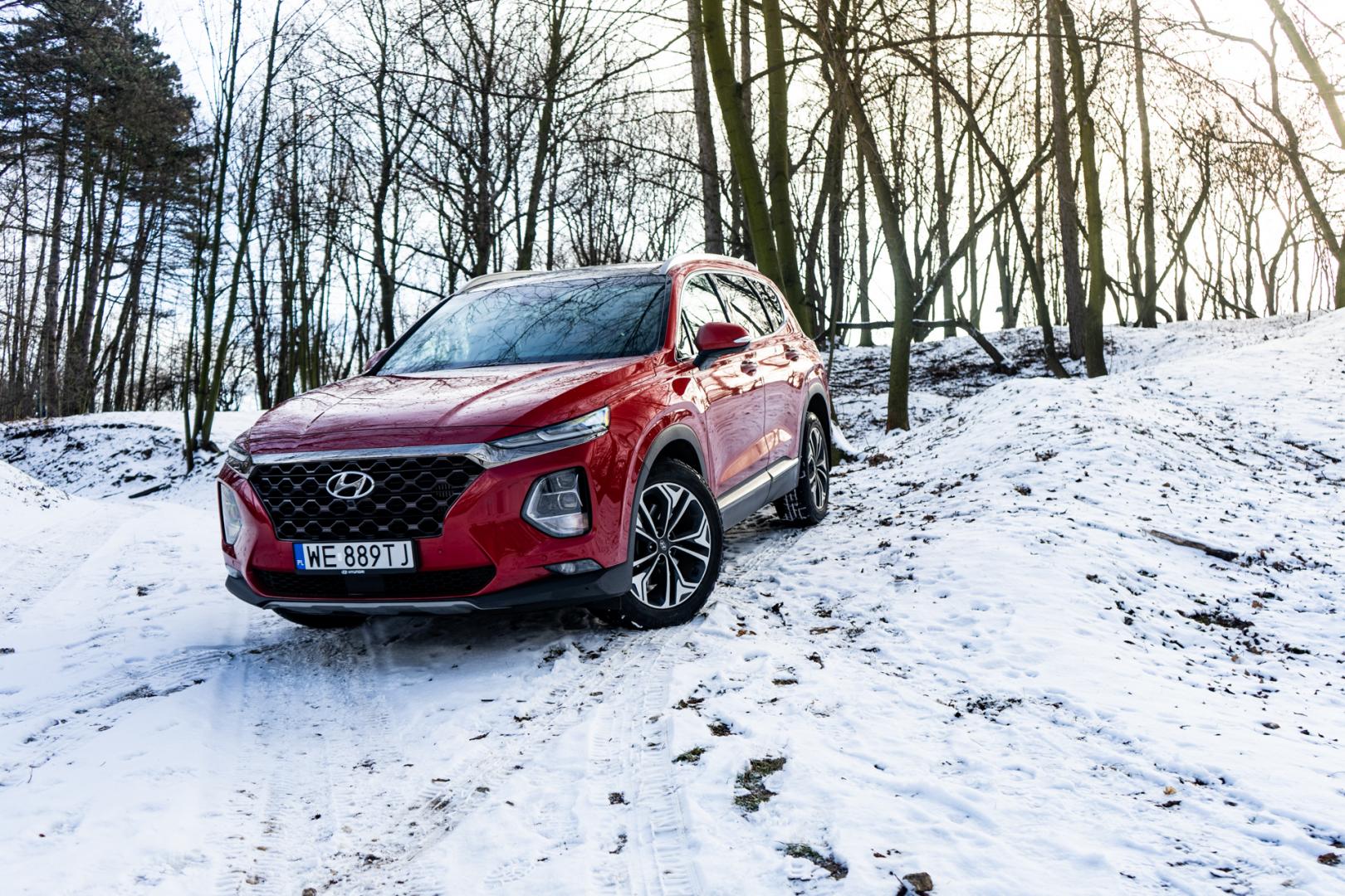 To także zasługa obecności napędu na cztery koła HTRAC, który stale rozdziela moment obrotowy pomiędzy osie. Sprawdziliśmy go nawet w lekkim terenie – na paru błotnisto-śniegowych podjazdach. Santa Fe radzi sobie całkiem dobrze. Kiedy jest bardzo ślisko, napęd nie zawsze jest w stanie ruszyć z miejsca i chyba nie całkiem optymalnie rozdziela moment. Wystarczy jednak dodać więcej gazu, żeby odpowiednio duża siła powędrowała na oś, która ma więcej przyczepności, a dzięki temu my pojedziemy dalej.