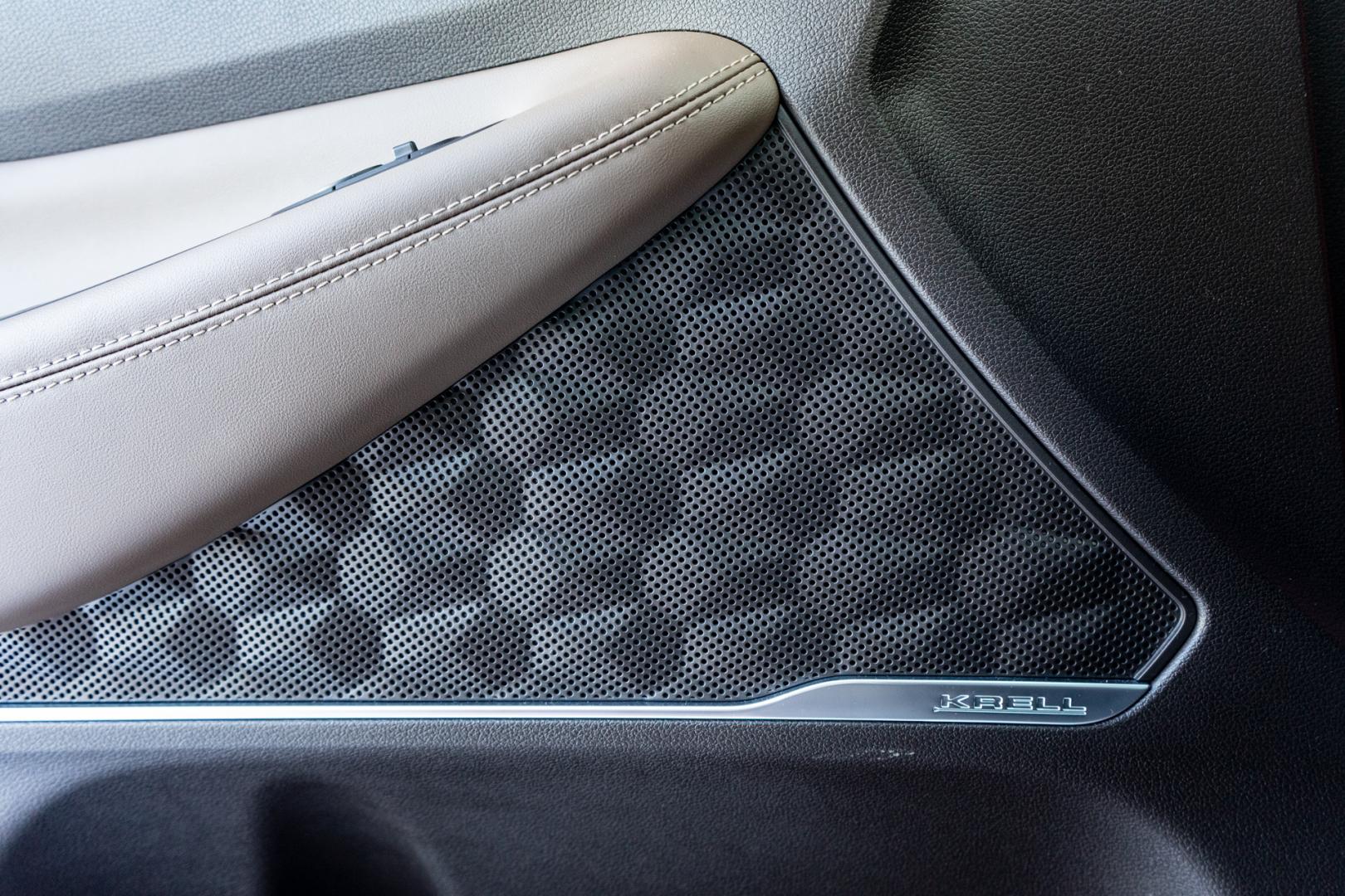 Wnętrze nowego Hyundaia Santa Fe wygląda całkiem ciekawie. Projekt tworzy coś na kształt dwóch stref – kierowcy i pasażera, rysując linie na desce rozdzielczej i drzwiach. Są tu też ładne detale, jak obudowy głośników w drzwiach z wypukłym wzorem, przeszycia, ciekawe wzory.