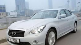 Limuzynę M wprowadzono na rynek przed rokiem. Masywny samochód o linii mającej zbliżać go do sportowych aut i wnętrzu wykończonym z niemal zegarmistrzowską precyzją był dotąd dostępny w dwóch dynamicznych wersjach. Teraz wprowadzono trzecią, która łączy benzynowy silnik 3,4 V6 o mocy 306 KM i silnik elektryczny dysponujący mocą 68 KM w hybrydowy układ, który ma w sumie moc 364 KM. Samochód ma także do dyspozycji spory moment obrotowy, bo dla silnika benzynowego maksimum to 350 Nm, a dla jednostki elektrycznej 270 Nm. Dzięki temu hybryda jest najmocniejszą wersją M. Nic więc dziwnego, że jest także najbardziej dynamiczna – podczas gdy turbodiesel o mocy 238 KM rozpędza Infiniti M do 100 km/h w 6,9 sekundy, a trzystudwudziestokonne benzynowe V6 w 6,2 sekundy hybrydzie wystarcza 5,5 sekundy!