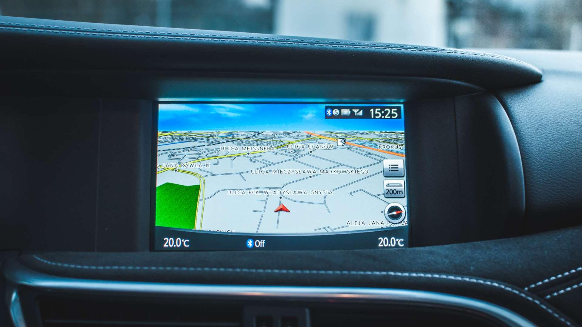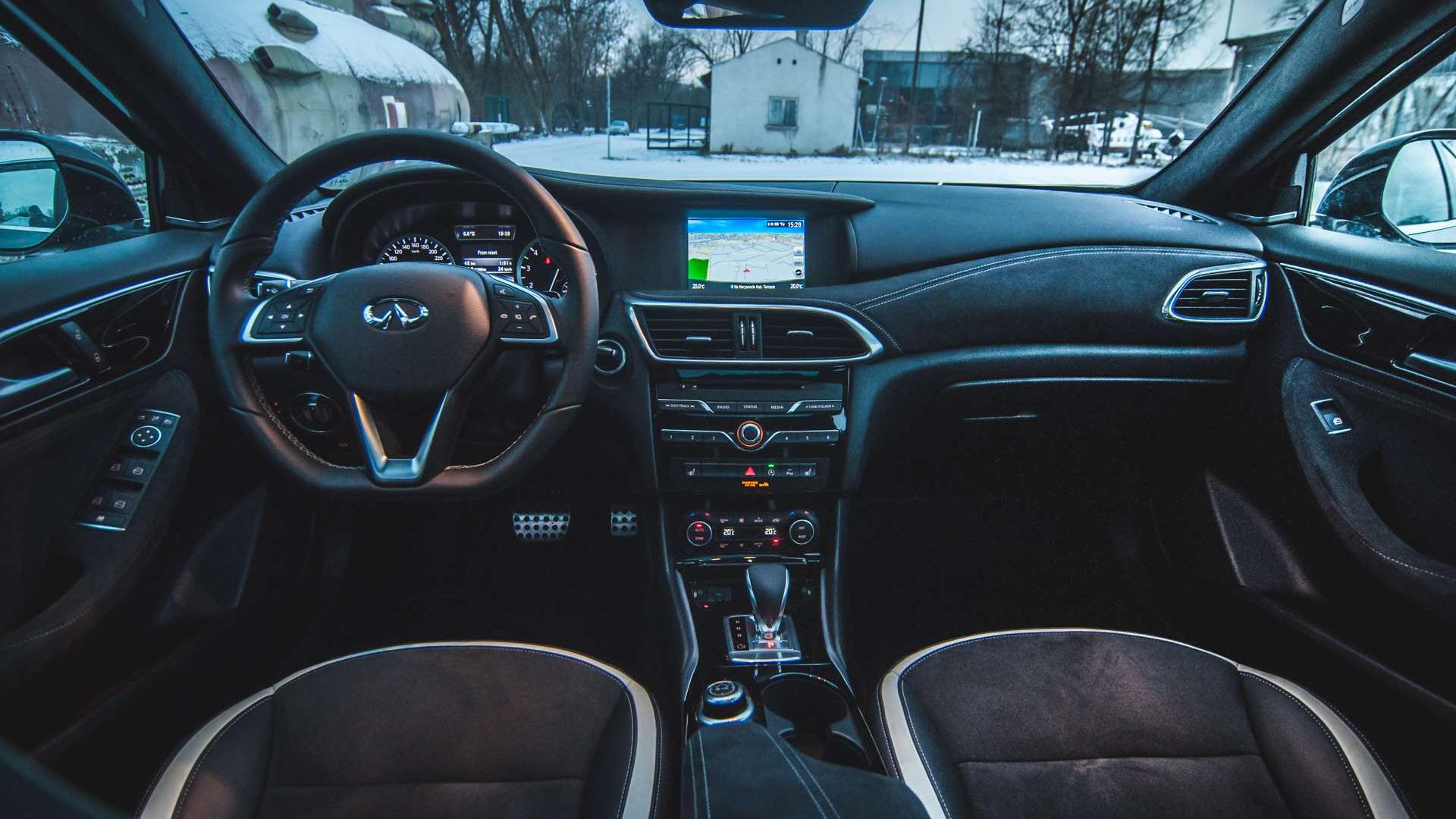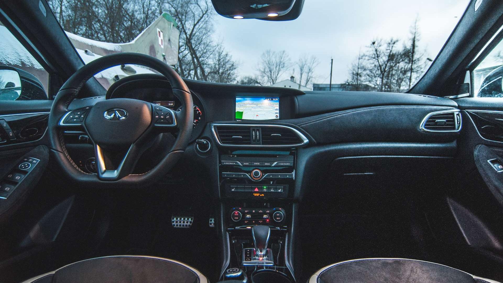 Materiały we wnętrzu to naprawdę wysoka półka. Cały kokpit ścieli skóra i alcantara z kontrastowymi przeszyciami. Konsola centralna nijak nie przypomina tej z niemieckiego kuzyna, podobnie zresztą jak ekran systemu multimedialnego - to nie Command Online, a autorski interfejs Infiniti InTouch, który znamy choćby z Q50. Swoją drogą, nawigacja bardzo ochoczo informuje nas o wszystkich fotoradarach w okolicy, ale ma nieaktualną bazę. W Krakowie widzi radary, o których słuch już dawno zaginął - większość z nich nie działa od dobrych paru lat. Miejscami przeszkadza też niedokładna lokalizacja językowa - zdarzają się opcje o angielskich nazwach.