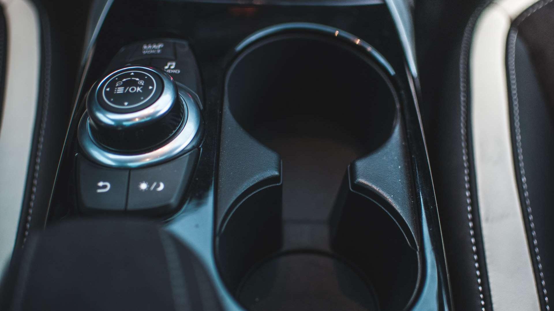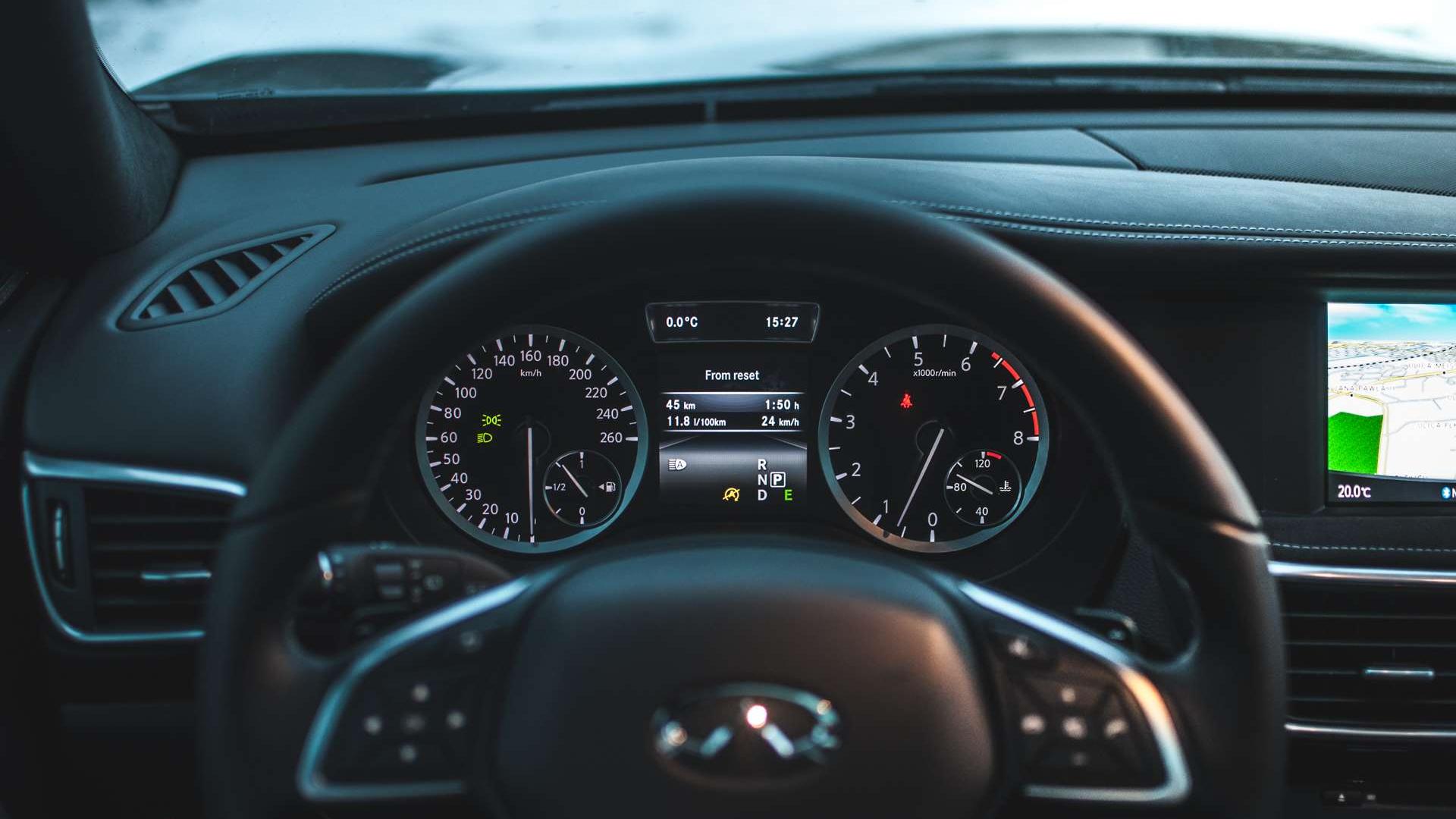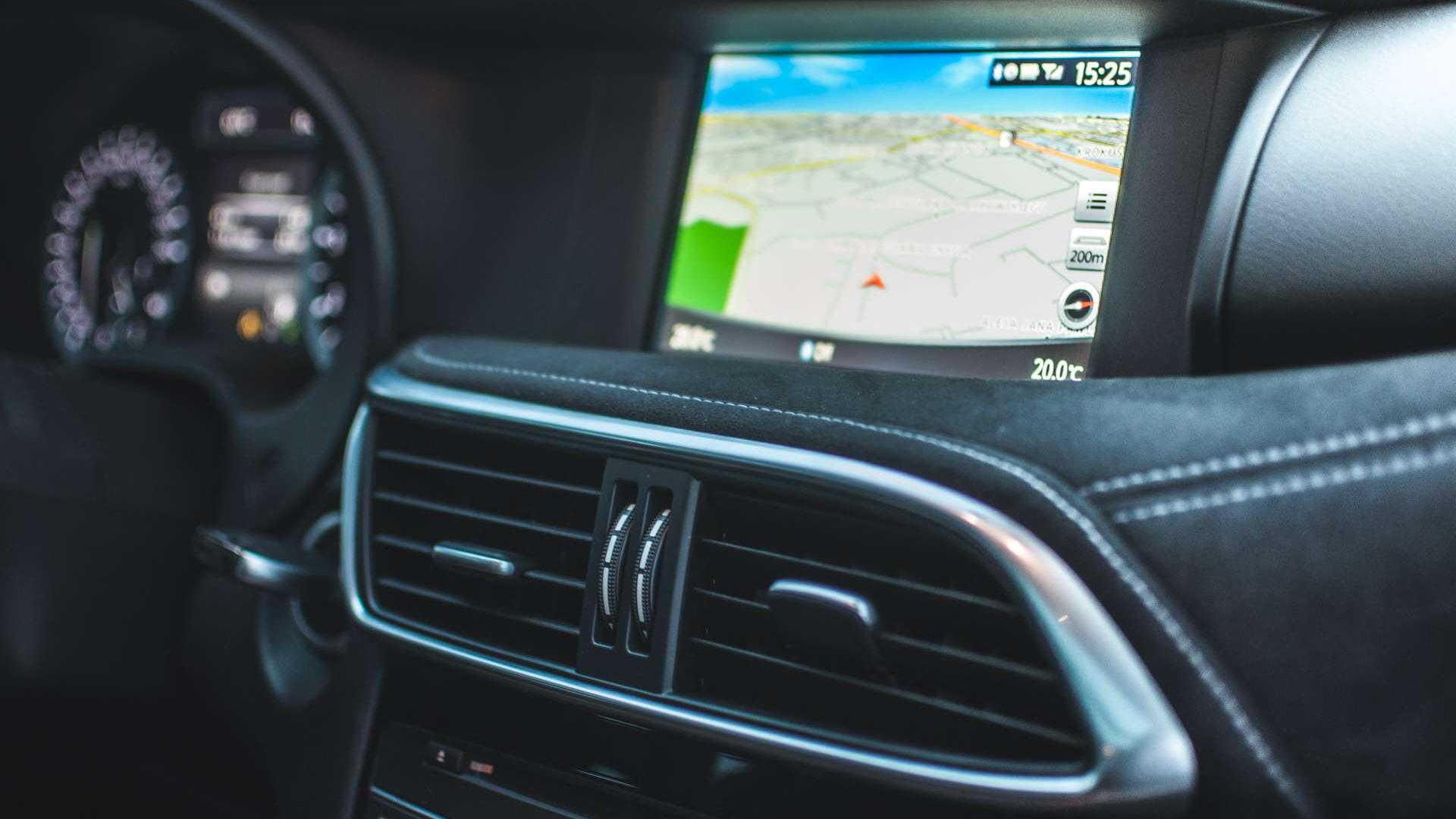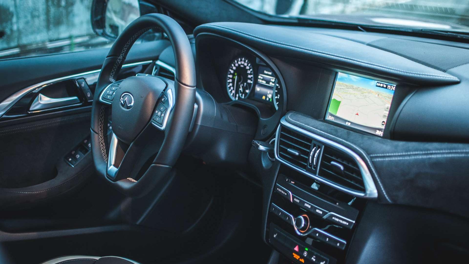 Materiały we wnętrzu to naprawdę wysoka półka. Cały kokpit ścieli skóra i alcantara z kontrastowymi przeszyciami. Konsola centralna nijak nie przypomina tej z niemieckiego kuzyna, podobnie zresztą jak ekran systemu multimedialnego - to nie Command Online, a autorski interfejs Infiniti InTouch, który znamy choćby z Q50. Swoją drogą, nawigacja bardzo ochoczo informuje nas o wszystkich fotoradarach w okolicy, ale ma nieaktualną bazę. W Krakowie widzi radary, o których słuch już dawno zaginął - większość z nich nie działa od dobrych paru lat. Miejscami przeszkadza też niedokładna lokalizacja językowa - zdarzają się opcje o angielskich nazwach.