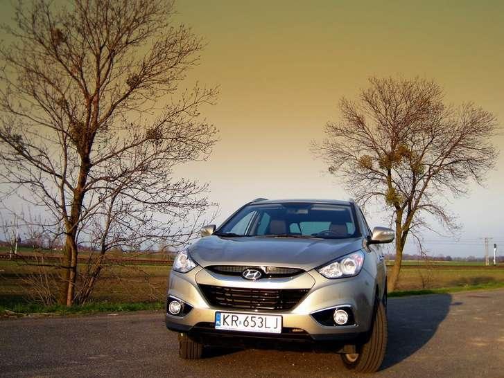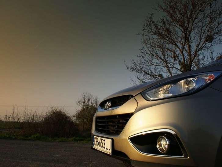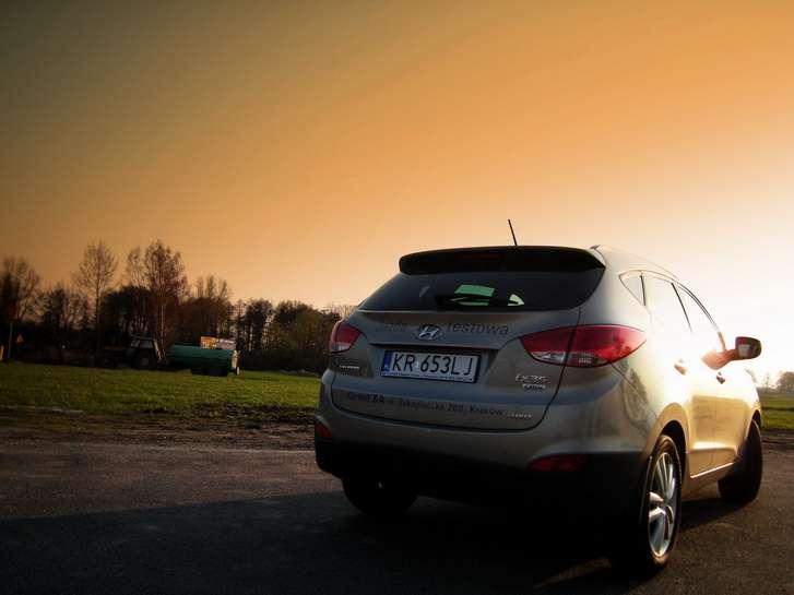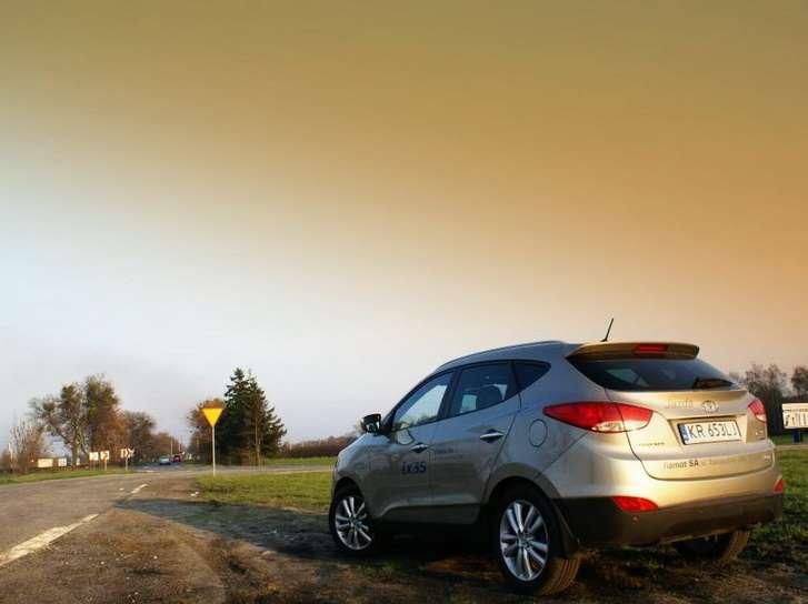 Tyle o wyposażeniu, czas na jazdę. Widoczność do przodu jest dobra, a boczne lusterka są wielkie jak świąteczne półmiski, dlatego ułatwiają jazdę po mieście. Z cofaniem jest już gorzej, bo tylna szyba jest poprowadzona dość wysoko, a te małe, trójkątne szkiełka w słupkach C w niczym nie pomagają. W bogatszych wersjach są za to dostępne czujniki parkowania dyskretnie ukryte w zderzaku, a za 5 tys. zł można nawet mieć nawigację z kamerą cofania. Prześwit wynosi 17cm, a zawieszenie bardziej skłania się ku komfortowi, ale to nie znaczy, że jest miękkie. Poprzeczne nierówności na drodze czuć, a tył trochę się „tłucze". Zgodnie z panującą modą tylne zawieszenie jest wielowahaczowe, dlatego auto prowadzi się pewnie, ale trochę wychyla się na boki, dlatego na zakrętach nie można przesadzać, bo wysokiego środka ciężkości wozu nie da się oszukać. Przynajmniej nie na naszej planecie. Układ kierowniczy jest precyzyjny i wspomagany elektrycznie, pracuje bardzo lekko i czasem można odnieść wrażenie, że przednie koła unoszą się w powietrzu i nie wiadomo co się z nimi dzieje. Z kolei trakcję auta można poprawić gotówką - dopłata do napędu na wszystkie koła wynosi 7 tys. zł., ale jak to w SUVie bywa – nie jest stały. W normalnych warunkach moc przekazywana jest na przednią oś. Gdy któreś z kół wpadnie w poślizg, to elektrycznie dołączany jest napęd na „tył". Sam mechanizm jest bardzo prosty, ale niestety działa z opóźnieniem, dlatego podczas poślizgu na zakręcie samochód może nieco podnieść ciśnienie i zachować się nieprzewidywalnie. Jednak spokojnie – nad wszystkim czuwa kontrola trakcji ESP, która ponoć ma funkcję zapobiegającą dachowaniu. Nie sprawdzałem, ale trzymam za słowo. Napęd idealnie sprawdzi się w nowoczesnym rozumieniu słowa „teren", czyli szutrowej ścieżce, która łączy dwie drogi krajowe. Centralny mechanizm różnicowy można zablokować za pomocą przycisku, dlatego płytki piasek i nieduże wertepy nie robią wrażenia na Hyundaiu. Nie można tylko przekraczać 30km/h, bo wtedy automatycznie się odblokuje. Rwące strumienie, błoto, pot i łzy – na to odpowiedzą ogromne, 18-calowe alufelgi z oponami szosowymi. To nie ta bajka.