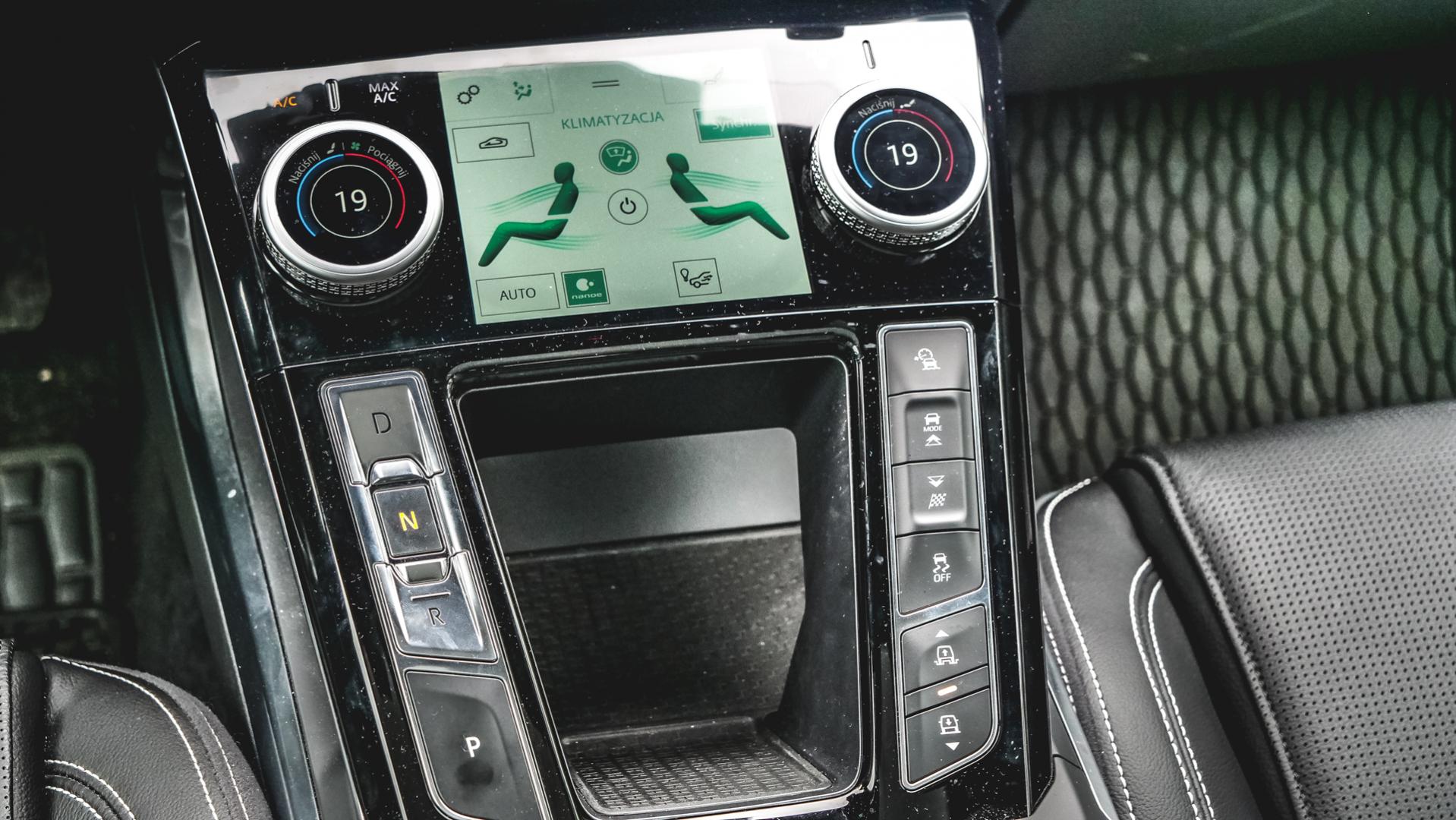Konsola została zaprojektowana dość specyficznie. Mamy dwa ekrany dotykowe, z wyraźnym podziałem funkcji. Górny to typowy system infotainment – ma nawigację, Internet, muzykę, telefon i tak dalej. Dolny służy do obsługi funkcji samochodu. To tu ustawiamy temperaturę, tryb jazdy i podgrzewanie, i wentylację foteli. I-Pace również dostał te wielofunkcyjne pokrętła z ekranami wewnątrz.
