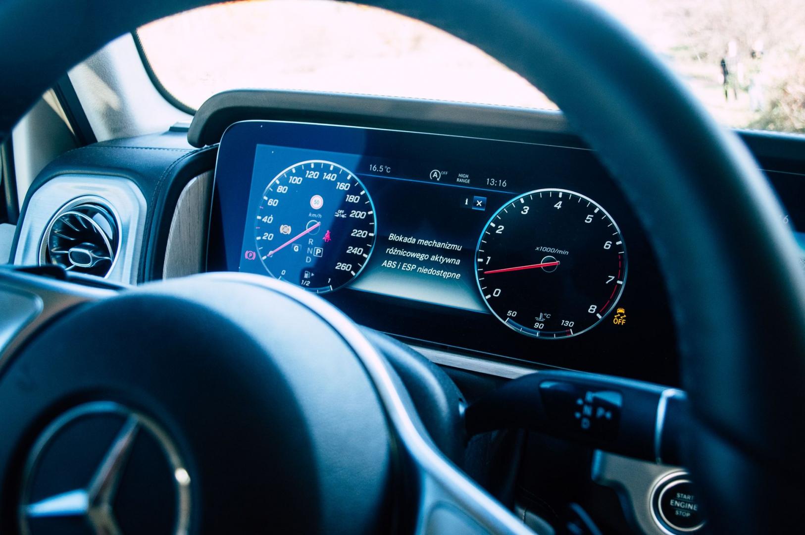 Wiele osób obawiało się, że Mercedes Klasy G może zatracić gdzieś po drodze swój terenowy charakter i w miejsce sprawdzonych, mechanicznych rozwiązań pojawi się więcej elektroniki. Nic bardziej mylnego. Konstrukcja nadal opiera się na ramie. Mamy trzy oddzielnie aktywowane blokady dyferencjałów – przedniego, centralnego i tylnego.