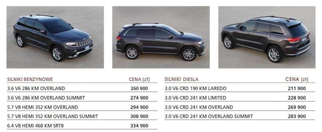 Nieco większa jest oferta silników benzynowych. Cennik modeli z taką jednostką startuje od poziomu 260 900 złotych – za tę kwotę dostaniemy Jeepa Grand Cherokee z silnikiem 3,6-litra V6 o mocy 286 KM z wyposażeniem Overland. Miłośnicy większej mocy wybiorą pewnie model z silnikiem V8 o pojemności 5,7-litra i mocy 352 KM z wyposażeniem Overland – koszt 294 900 złotych. Na samym szczycie znajdziemy prawdziwego potwora za, bagatela, 334 900 złotych – model SRT8 z silnikiem V8 HEMI o pojemności 6,4-litra i mocy 468 KM zadowoli nawet najbardziej wymagających użytkowników. Czy to wysoka cena? Wbrew pozorom – nie.