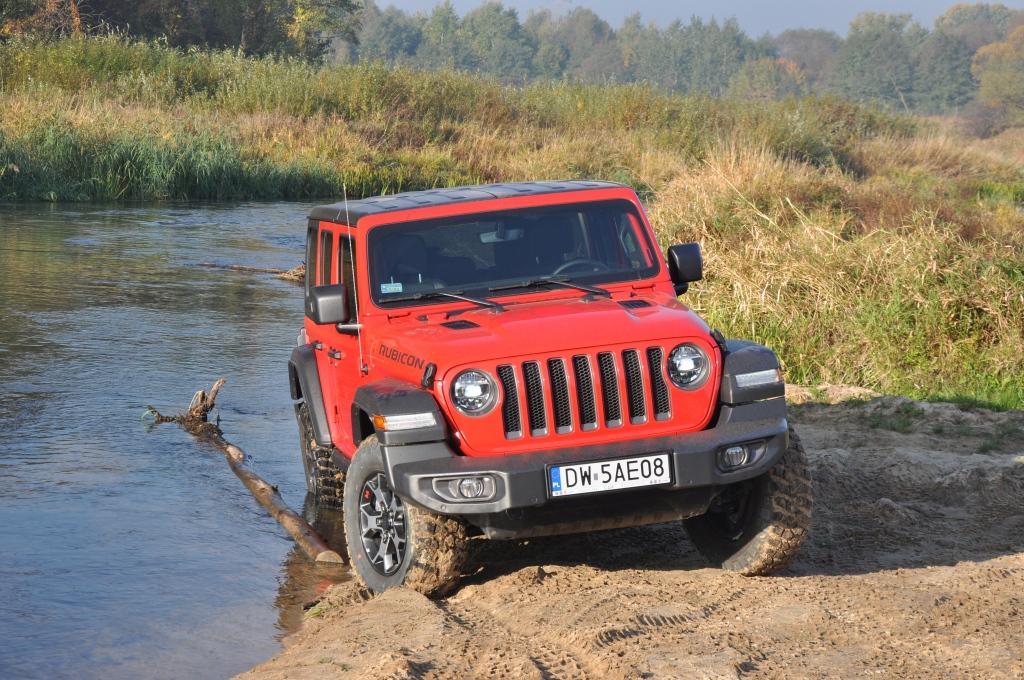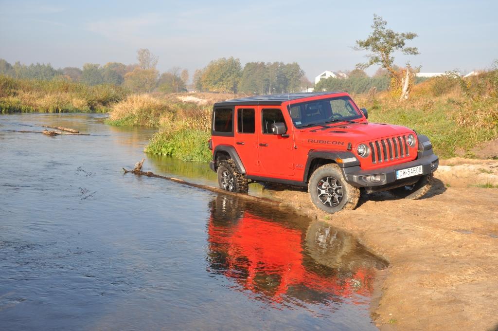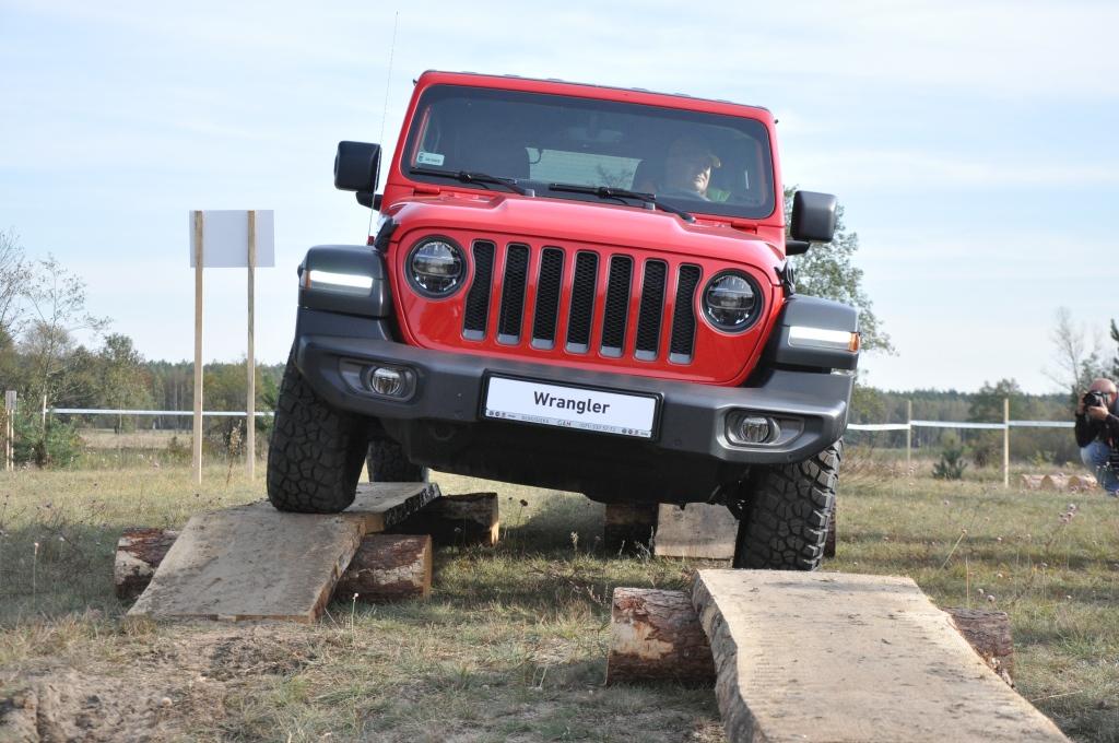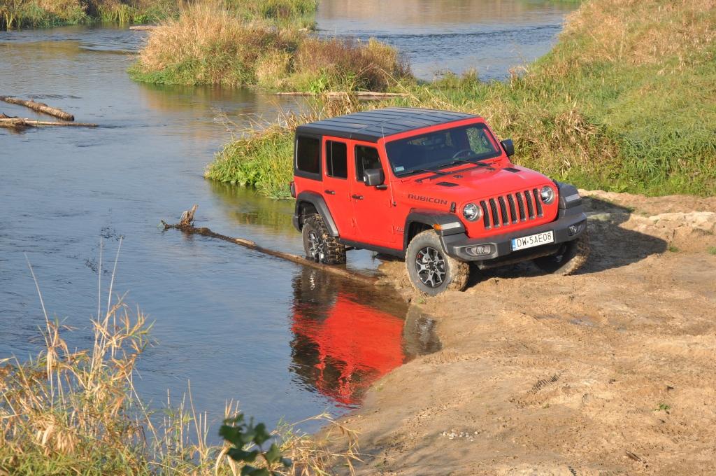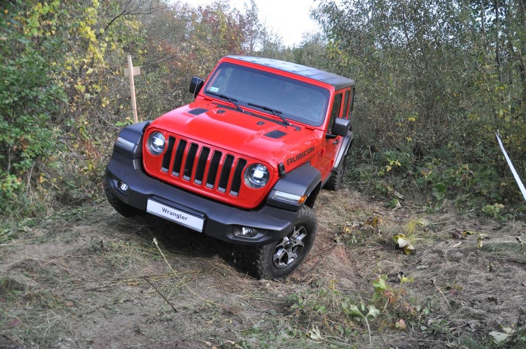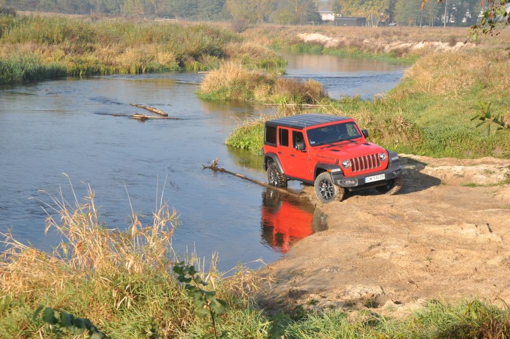 To swego rodzaju „problem” Rubicona, że jego doskonałe podwozie nie miało okazji wykazania swojej przewagi w tym pokazie, ale też wyraźny sygnał, że nie zawsze trzeba ją wybierać, mając zamiar jeździć w terenie. To ostatnie jest banalne też choćby przez wymiary terenowe – prześwit w zależności od wersji waha się między 232 a 260 mm, a kąty natarcia i zejścia są jednymi z najbardziej imponujących wśród aut terenowych (przód: 35-36 stopni; tył: 29-31 stopni). Dodatkowo zderzaki umieszczone są bardzo wysoko, co zwiększa możliwości „najazdowe” na wysokie przeszkody. Trzeba jedynie uważać na dolną osłonę chłodnicy, która seryjnie jest plastikowa i łatwo ją uszkodzić. Z pomocą z pewnością przyjdzie katalog akcesoriów Mopar, który jest już gotowy ze względu na wcześniejszą sprzedaż Wranglera w Stanach Zjednoczonych. Seryjna głębokość brodzenia wynosi 762 mm, a korki spustowe w podłodze ułatwiają spuszczenie nadmiaru wody (lub raczej szlamu) i umycie wnętrza szlauchem – jak za starych dobrych czasów.