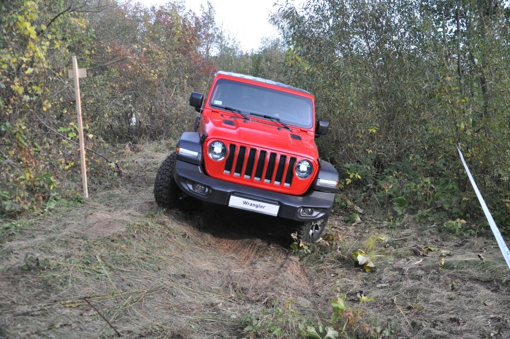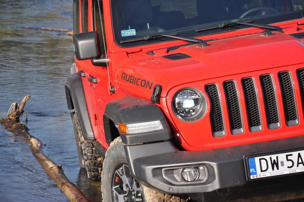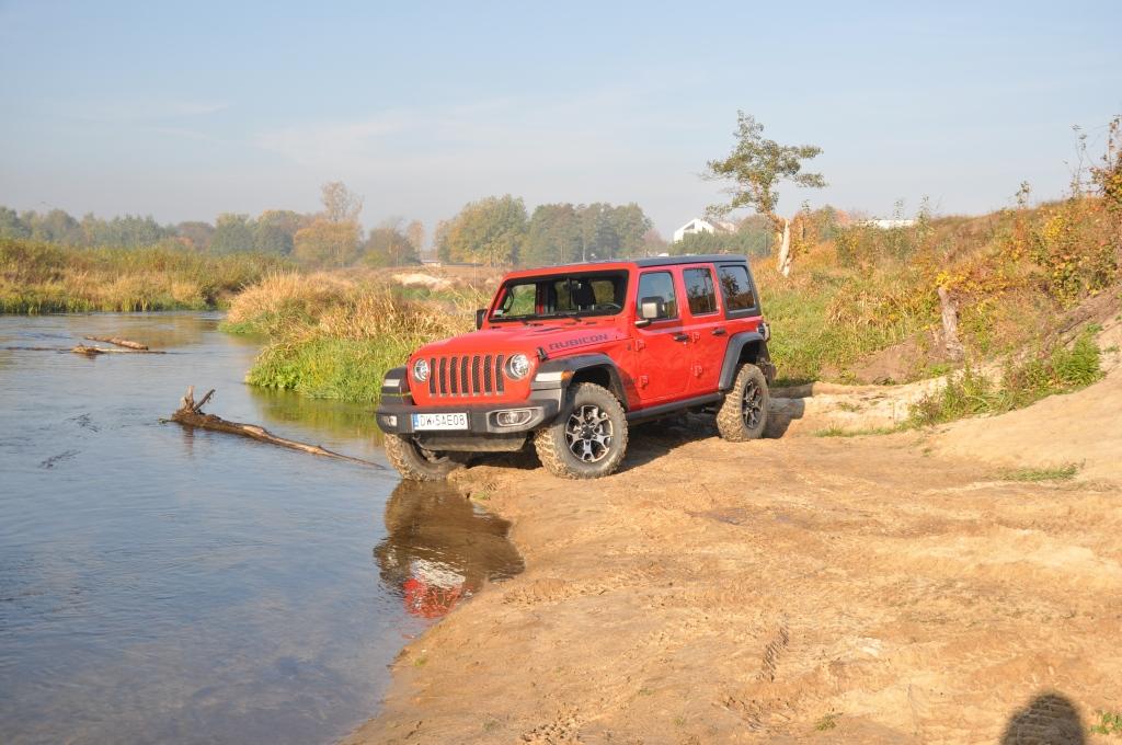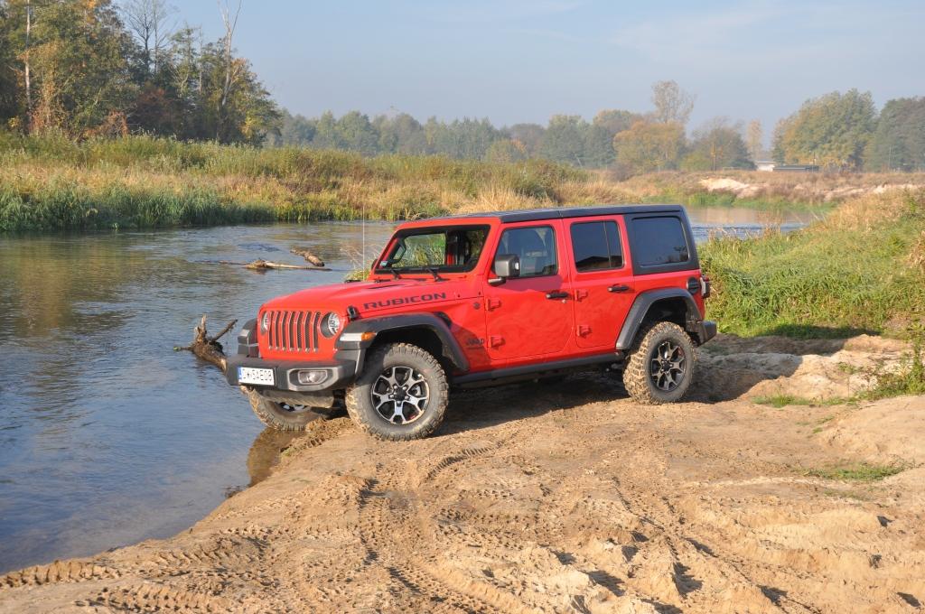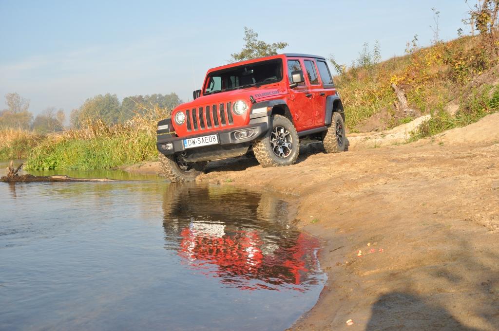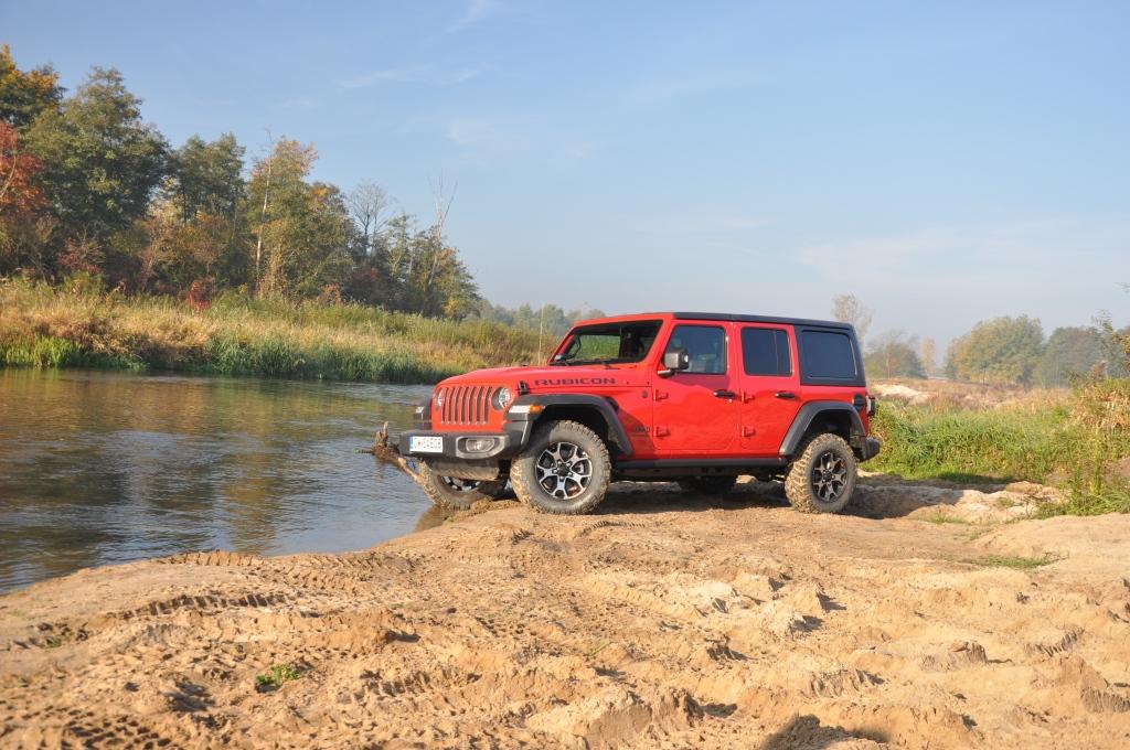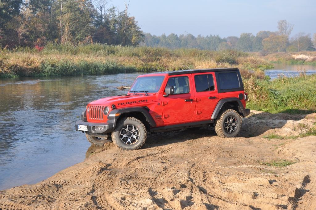 To swego rodzaju „problem” Rubicona, że jego doskonałe podwozie nie miało okazji wykazania swojej przewagi w tym pokazie, ale też wyraźny sygnał, że nie zawsze trzeba ją wybierać, mając zamiar jeździć w terenie. To ostatnie jest banalne też choćby przez wymiary terenowe – prześwit w zależności od wersji waha się między 232 a 260 mm, a kąty natarcia i zejścia są jednymi z najbardziej imponujących wśród aut terenowych (przód: 35-36 stopni; tył: 29-31 stopni). Dodatkowo zderzaki umieszczone są bardzo wysoko, co zwiększa możliwości „najazdowe” na wysokie przeszkody. Trzeba jedynie uważać na dolną osłonę chłodnicy, która seryjnie jest plastikowa i łatwo ją uszkodzić. Z pomocą z pewnością przyjdzie katalog akcesoriów Mopar, który jest już gotowy ze względu na wcześniejszą sprzedaż Wranglera w Stanach Zjednoczonych. Seryjna głębokość brodzenia wynosi 762 mm, a korki spustowe w podłodze ułatwiają spuszczenie nadmiaru wody (lub raczej szlamu) i umycie wnętrza szlauchem – jak za starych dobrych czasów.