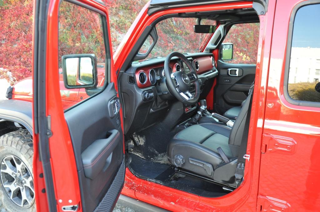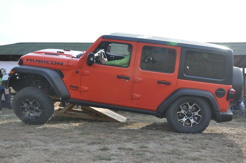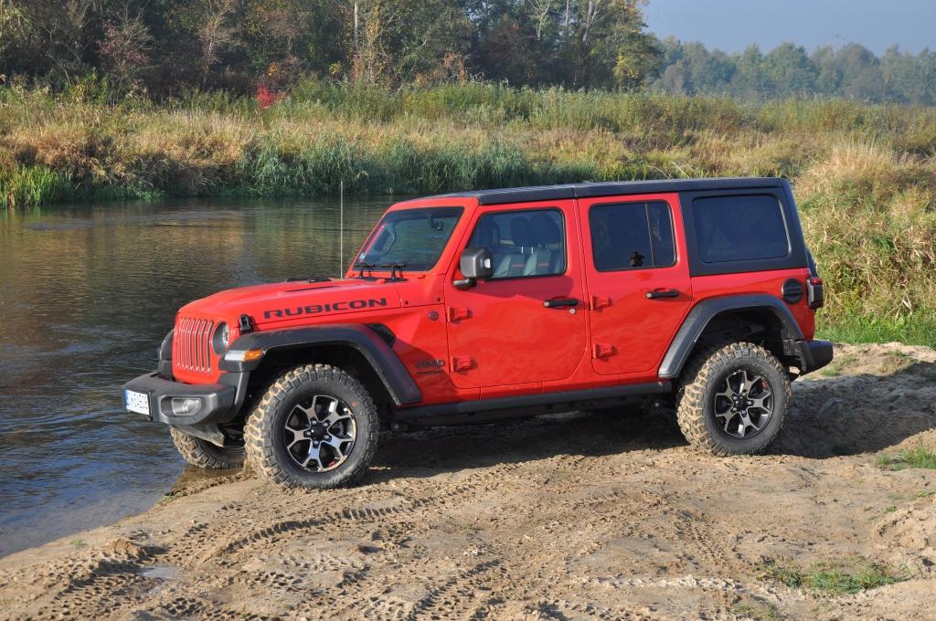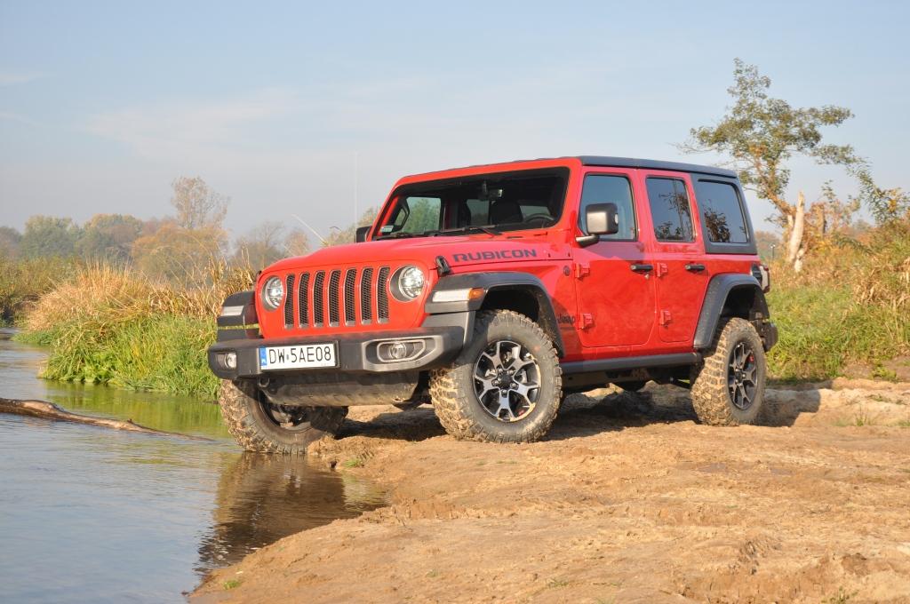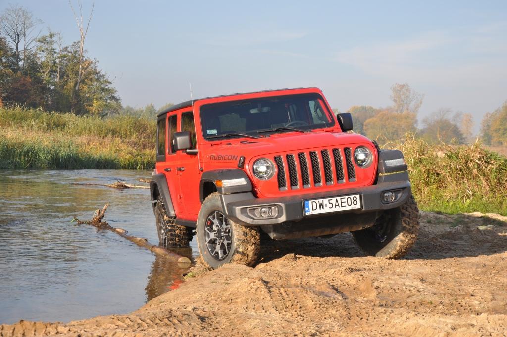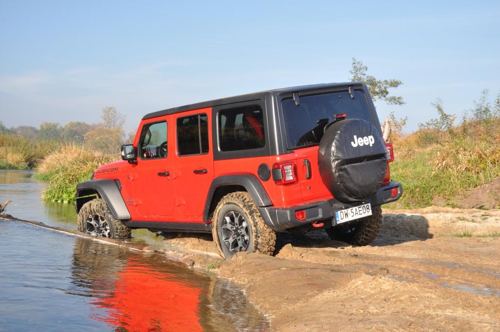 To swego rodzaju „problem” Rubicona, że jego doskonałe podwozie nie miało okazji wykazania swojej przewagi w tym pokazie, ale też wyraźny sygnał, że nie zawsze trzeba ją wybierać, mając zamiar jeździć w terenie. To ostatnie jest banalne też choćby przez wymiary terenowe – prześwit w zależności od wersji waha się między 232 a 260 mm, a kąty natarcia i zejścia są jednymi z najbardziej imponujących wśród aut terenowych (przód: 35-36 stopni; tył: 29-31 stopni). Dodatkowo zderzaki umieszczone są bardzo wysoko, co zwiększa możliwości „najazdowe” na wysokie przeszkody. Trzeba jedynie uważać na dolną osłonę chłodnicy, która seryjnie jest plastikowa i łatwo ją uszkodzić. Z pomocą z pewnością przyjdzie katalog akcesoriów Mopar, który jest już gotowy ze względu na wcześniejszą sprzedaż Wranglera w Stanach Zjednoczonych. Seryjna głębokość brodzenia wynosi 762 mm, a korki spustowe w podłodze ułatwiają spuszczenie nadmiaru wody (lub raczej szlamu) i umycie wnętrza szlauchem – jak za starych dobrych czasów.