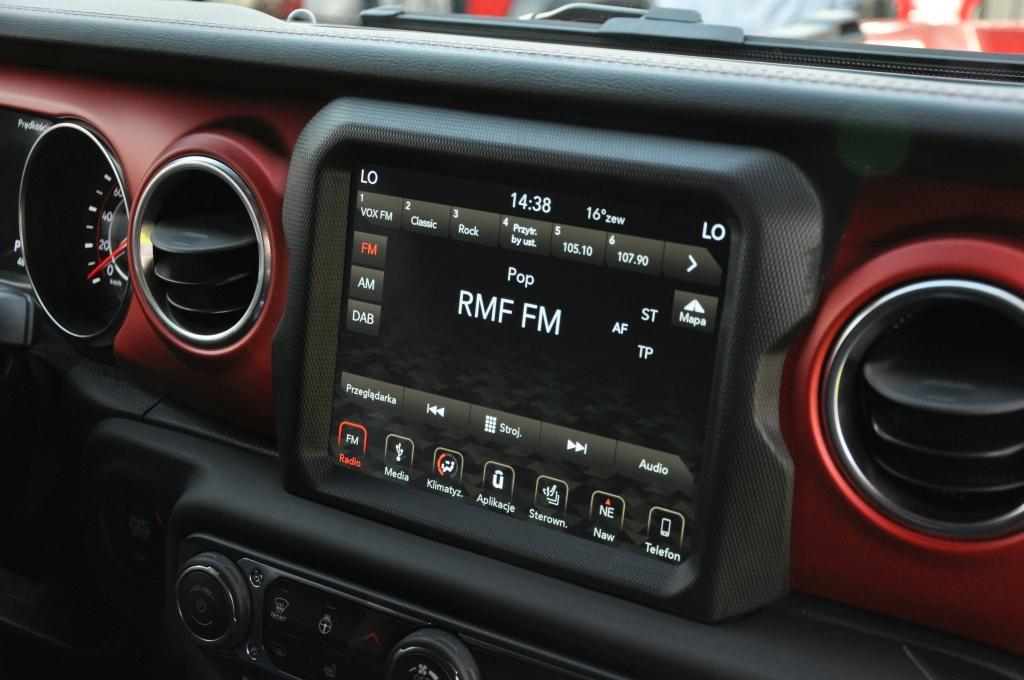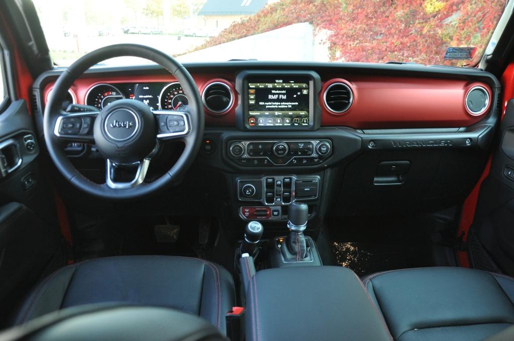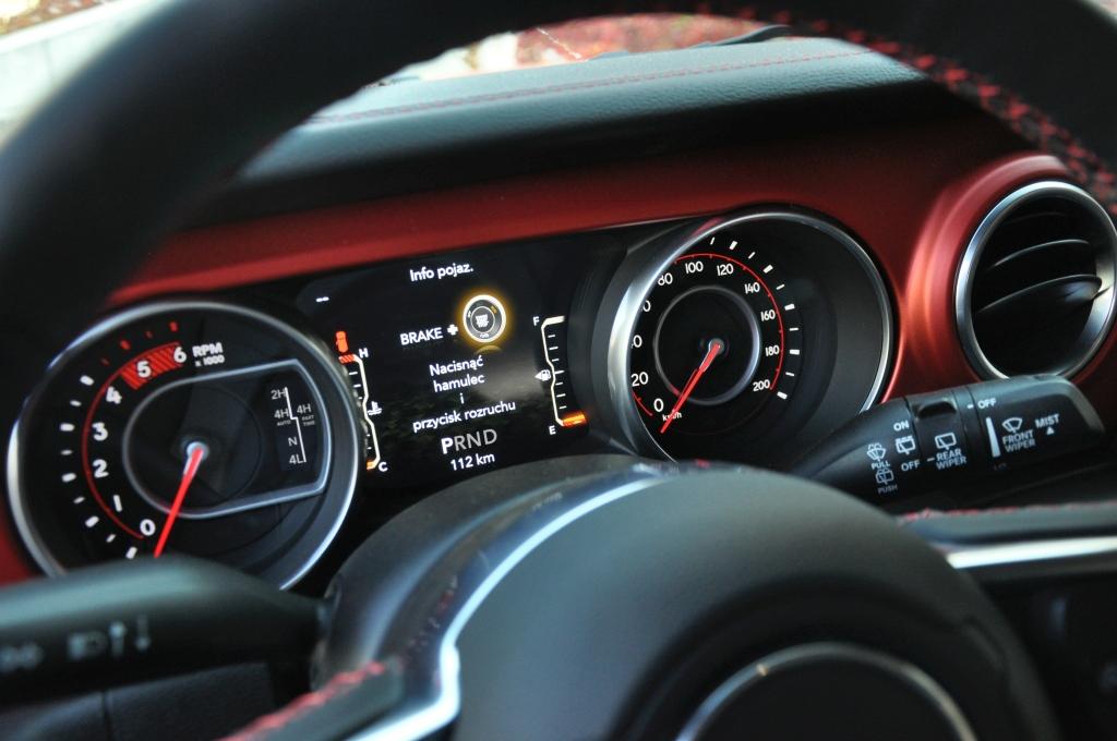 To, co mam do zarzucenia nowemu Wranglerowi, to zdecydowane przeładowanie deski rozdzielczej. Umieszczono na niej ogrom przycisków, w tym także te od sterowania szybami w drzwiach, co początkującemu użytkownikowi może wydać się dość trudne do opanowania. Oczywiście ma to też tę zaletę, że po zapamiętaniu gdzie są używane przez nas przyciski, łatwiej jest dotrzeć do często używanych funkcji i systemów. Nie trzeba w tym celu zgłębiać mrocznych zakamarków komputera pokładowego. Sterowanie napędami, odłączenie ESP, układu start-stop, czy znieczulenie czujników parkowania zajmuje dosłownie chwilę. W wolnej chwili, np. podczas oczekiwania na zielone światło, można zawiesić oko na jednym z wielu pociesznych detali, jak wizerunki Jeepa Willysa czy charakterystycznego grilla o siedmiu szczelinach, umieszczonych w różnych miejscach kabiny.