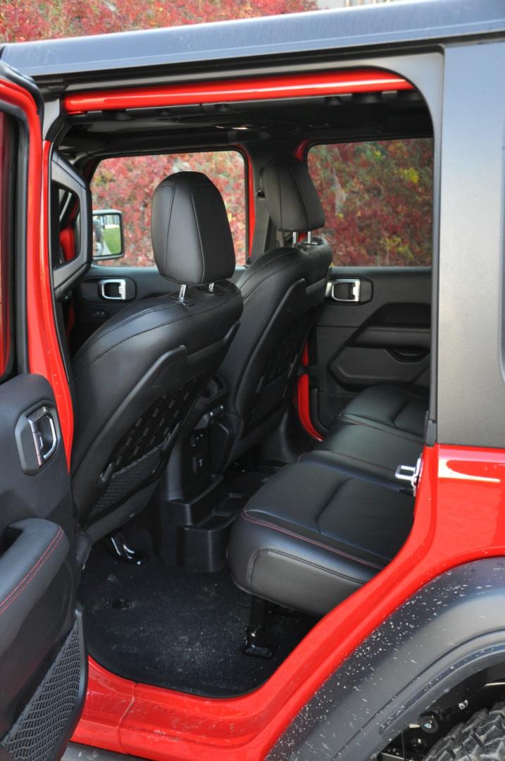 Przestronność wnętrza Jeepa Wranglera nie uległa znaczącej zmianie. Z przodu jest „przyjemnie” ciasno, a fotel ustawiony jest w idealnej odległości od drzwi, co z jednej strony pozwala na wygodne podróżowanie, z drugiej daje możliwość wyjrzenia przez okno, by kontrolować obrany tor jazdy w terenie. Zdejmowane drzwi mają podwójny system ograniczników, standardowe spotykane we wszystkich współczesnych autach oraz dodatkowe wykonane z materiałowych pasków. Te drugie pełnią oczywiście rolę dekoracyjną, ale też mogą przeszkadzać niektórym pasażerom, bo „wchodzą” do kabiny. Z tyłu w wersji pięciodrzwiowej jest ogromna ilość miejsca nad głowami – pochylając się do przodu, trzeba jedynie uważać na głośniki zamontowane na pałąku środkowym. Można w nie boleśnie trafić. Na stopy jest full miejsca, więc pasażerowie w obuwiu trekingowym nie powinni narzekać, w okolicy kolan nie ma już szału, ale wciąż jest luz.