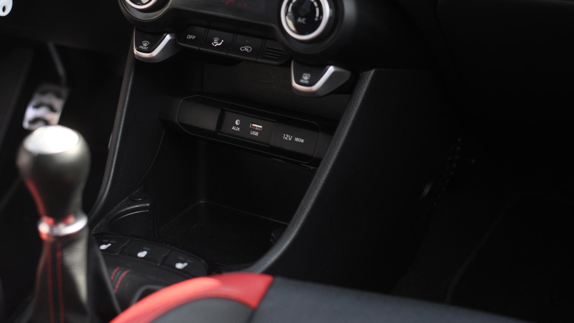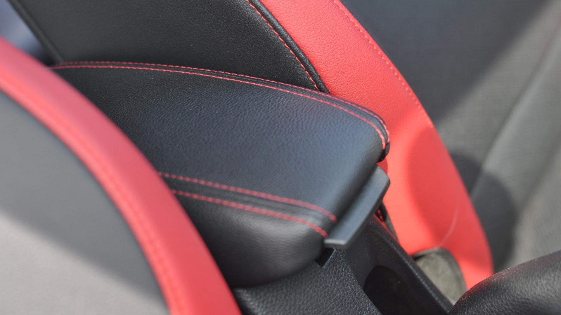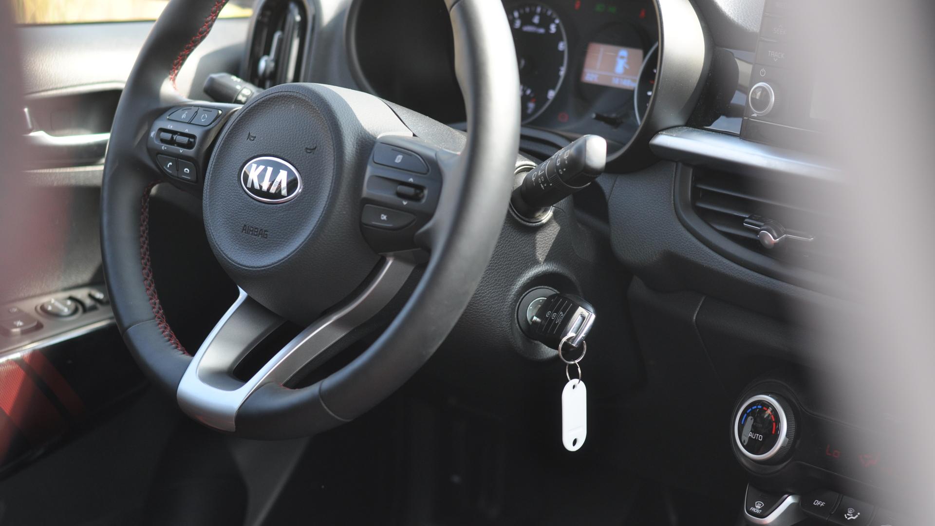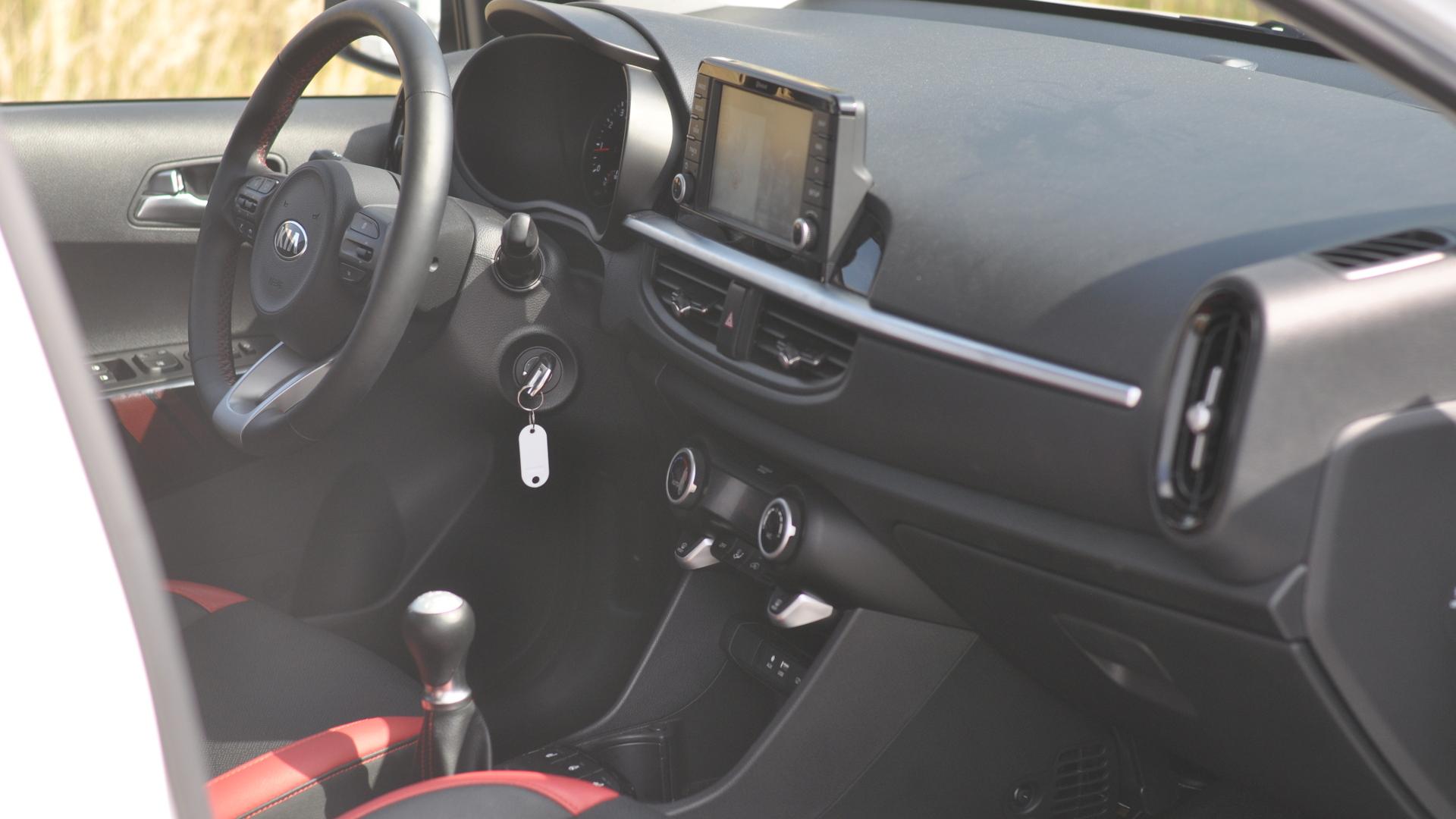Na szczęście w przypadku nowej Kii Picanto smaczki stylistyczne sportowego pakietu nie kończą się wraz z zajęciem miejsca za kierownicą. W tak niewielkim kokpicie naprawdę sporo się dzieje. Choć tonacja wnętrza jest ciemna, podsufitka jasna, to czerwone elementy wybijają się na pierwszy plan. Nić w tym kolorze posłużyła do wykończenia obicia kierownicy z gładkiej skóry, bardzo małego, ale wygodnego podłokietnika czy też przeszyć w fotelach. Te zasługują na szczególną pochwałę. Nie należą do najbardziej masywnych, co pozwala zaoszczędzić miejsca, jednak są wygodne i spełniają swoją rolę nawet podczas dalszych podróży. Trzymanie boczne jakością dorównuje skórzanemu obiciu w dwóch kolorach – czarnym z czerwonymi elementami. To w aucie klasy miejskiej robi wrażenie! Jeszcze więcej barwnych kontrastów znajdziemy w obiciach drzwi. Pewnym jest, że w przypadku Kii Picanto nikt nie pominie pakietu GT Line.