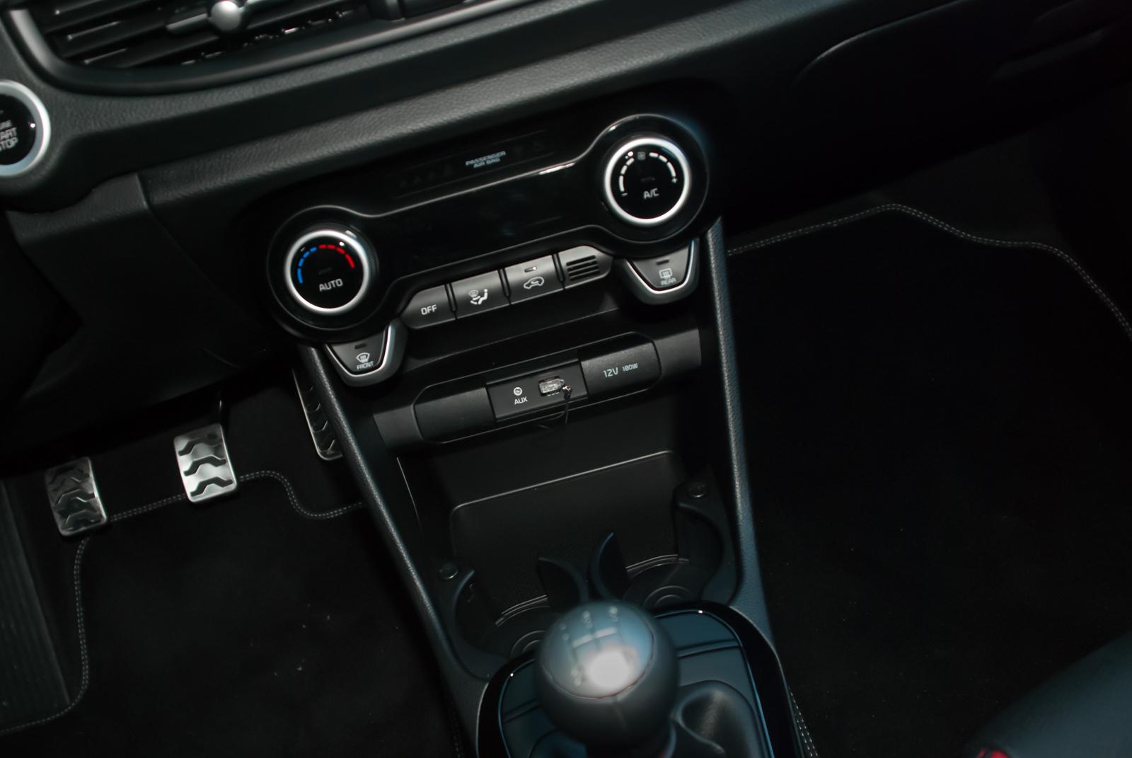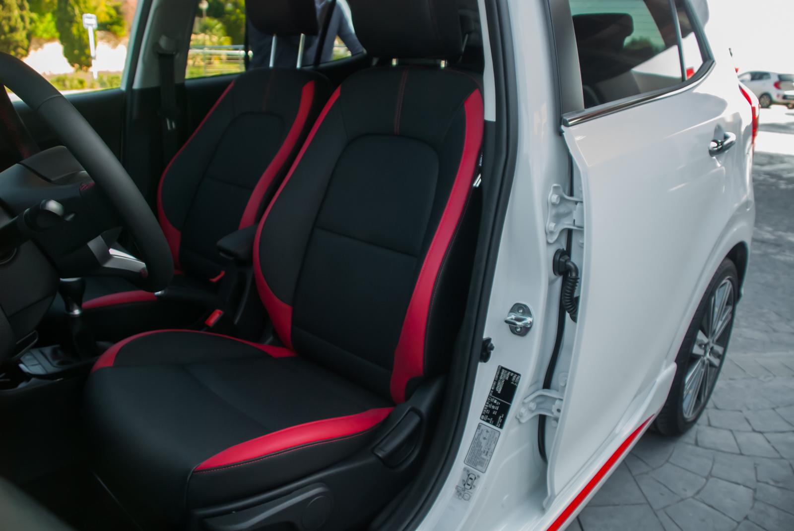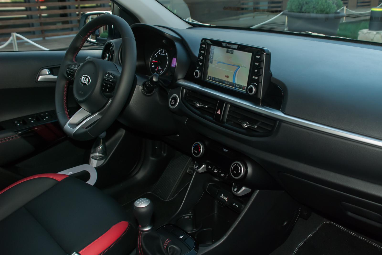 W wersji GT Line fotele zostały obszyte ekologiczną skórzaną tapicerką z czerwonymi wstawkami. Co ważne, są bardzo wygodne i nie przyprawiają o ból kręgosłupa, nawet po dłuższej jeździe. Ciekawostką jest fakt, że fotele są takie same dla wszystkich wersji wyposażenia (poza obszyciem). Nie ma więc ryzyka, że w podstawowej wersji zastaniemy niewygodne, obszyte materiałem taborety. Motyw czerwonego przeszycia w wersji GT Line przewija się przez całe wnętrze – od kierownicy, przez podłokietnik i boczki drzwi, aż po mieszek dźwigni zmiany biegów. Jakby sportowego pazura było mało, Kia Picanto GT Line otrzymała także aluminiowe nakładki na pedały.