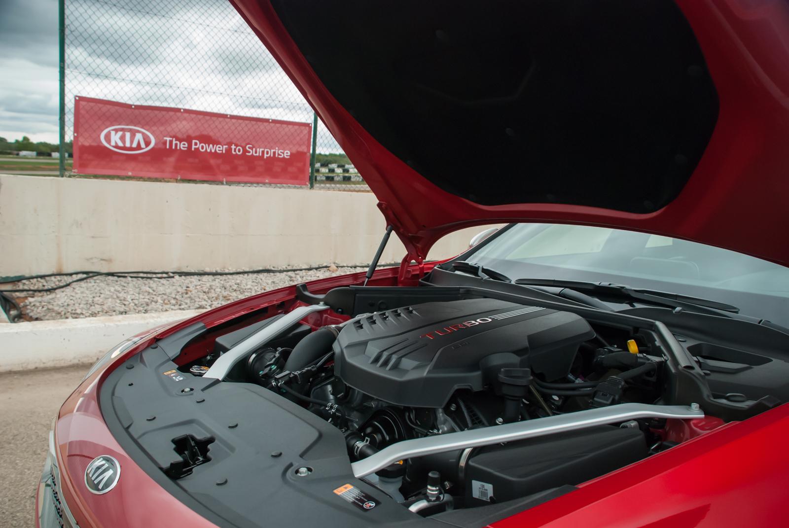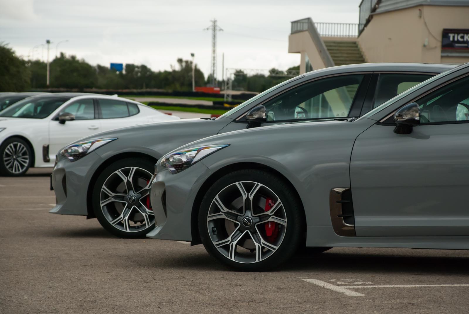 Podczas testów sprawdziliśmy dwie zupełnie różne konfiguracje Kii Stinger. Na pierwsze kilka okrążeń po torze wybraliśmy 2.2-litrowego diesla z napędem na tylną oś. W aucie czuć lekkość prowadzenia, choć na ostrych zakrętach opony drą się jak koty na wiosnę. ESP trzyma auto w ryzach i trudno o jakiekolwiek nieprzewidywalne zachowania. Niestety ośmiobiegowy automat w trybie Sport ma tendencje do zbytniego przeciągania biegów. Robi to o tyle bez sensu, że czasami słychać, że silnik pracuje już na maksymalnych obrotach, a mimo to skrzynia ani myśli wrzucić kolejne przełożenie. Silnik "wyje", skrzynia śpi, korzyści z tego żadnej, a cenne sekundy na torze uciekają.