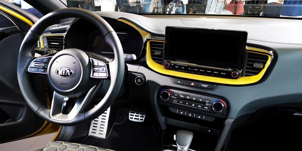 Żółty egzemplarz wyposażony w automatyczną skrzynię oferował równie ciekawe miejsce pracy kierowcy rozjaśnione żółtymi wstawkami i przeszyciami tapicerki. Po wnętrzu wciąż widać pozytywne skutki zatrudnienia najlepszych stylistów, choć oczywiście idealnie nie jest. Panel sterowania klimatyzacją mógłby wyglądać lepiej, zaś nie wszyscy przepadają za centralnymi ekranami wyglądającymi jak postawione w tym miejscu tablety. Czy to wada? Każdy sam musi sobie odpowiedzieć. Kii zaś należy się pochwała za fizyczne przyciski umieszczone pod ekranem ułatwiające szybką nawigację po menu.