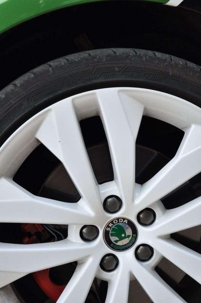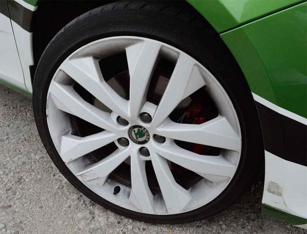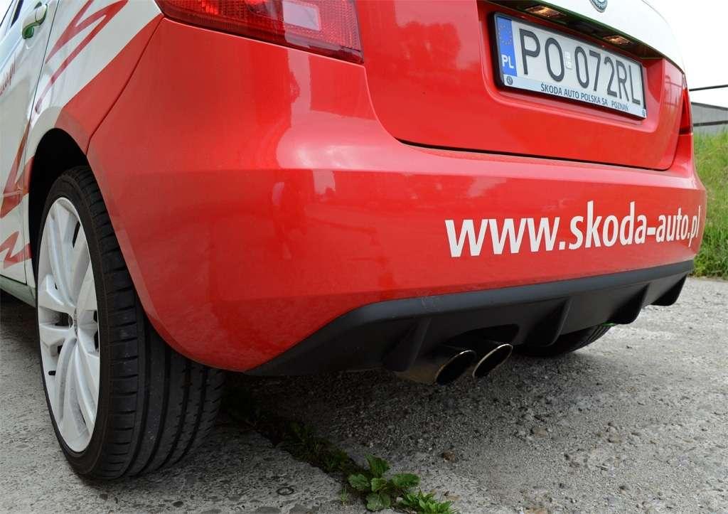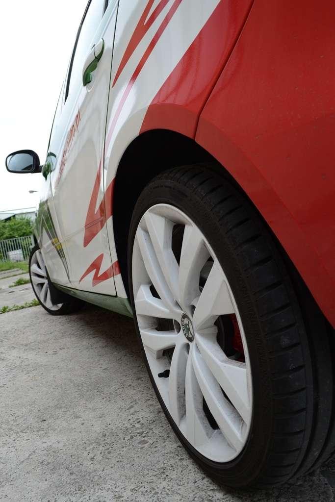 Testowe auto mocno wyróżnia się z tłumu za sprawą oklejenia, przypominającego rajdowe odmiany S2000. Jest to limitowana wersja i samochodów w takiej kolorystyce będzie wyprodukowanych tylko 200, a szkoda, bo auto na drodze zwraca uwagę zarówno innych kierowców, jak i przechodniów. Ta odmiana posiada dodatkowo białe felgi, maskę i dach, przy czym na dachu i masce dumnie widnieje logotyp Skody. Nie martw się jednak, jeśli nie zdążysz kupić jednej z tych 200 Fabii - już zwykła Fabia RS ma bowiem 17-calowe alufelgi z oponami o profilu 40, czerwone zaciski na hamulcach, podwójną końcówkę układu wydechowego i dyfuzor z tyłu. Te elementy wraz z emblematem RS na atrapie chłodnicy i klapie bagażnika jednoznacznie mówią, że mamy do czynienia z czymś więcej, niż ze zwykłym miejskim samochodem.