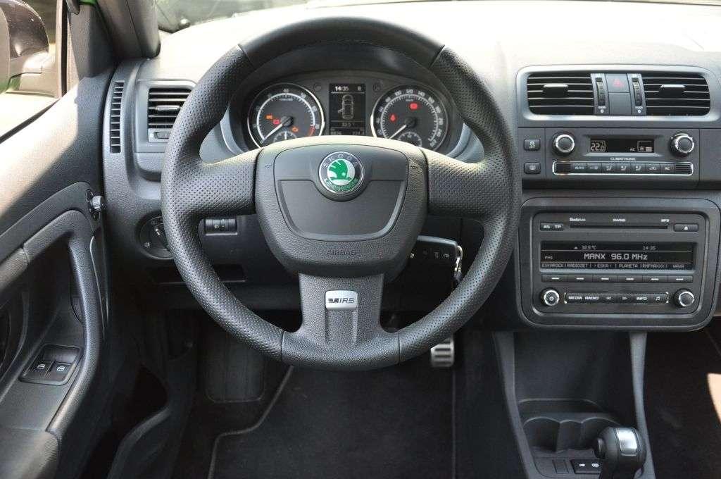 Siedząc w środku łatwo jest zapomnieć, dlaczego wszyscy oglądają się za tym autem. Wnętrze wyróżnia się tylko fotelami o zwiększonym trzymaniu bocznym oraz trójramienną kierownicą ze znaczkiem RS - zdecydowanie za mało jak na tak zjawiskowo wyglądające z zewnątrz auto, a przy okazji najdroższą w ofercie odmianę. Nie ma nawet ciekawie zaprojektowanych zegarów – oczywiście drobiazg, ale spogląda się na nie często i kilka sportowych detali mogło by cieszyć oko kierowcy także w trakcie podróży. Jeśli już auto ma być sportowe, to niech również wnętrze coś w tym kierunku prezentuje. Tymczasem jest tak, jak w każdej innej Fabii, czyli bez szaleństw. Z dodatków, które podnoszą komfort użytkowania, jest jednostrefowa automatyczna klimatyzacja i skrętne reflektory ze spryskiwaczami.