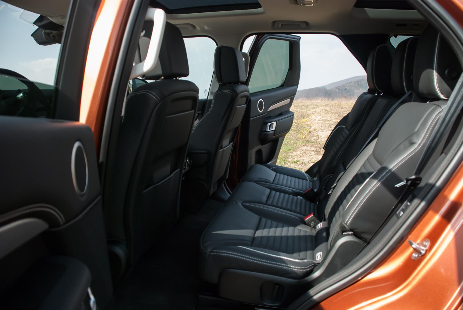 Jak łatwo się domyślić, wnętrze Land Rovera Discovery przypomina nieduży pokój. Pierwszy rząd siedzeń oferuje aż nadto przestrzeni dla kierowcy i pasażera. Dość wysoko poprowadzony tunel środkowy sprawia, że siedzimy nieco niżej, otuleni elementami wnętrza. W drugim rzędzie siedzeń także nikt nie powinien narzekać na brak miejsca, nawet jeśli posadzimy obok siebie trzy dorosłe osoby. Niezadowolony może być jedynie pasażer siedzący pośrodku, ale nie z powodu braku przestrzeni, a dość twardego siedziska.