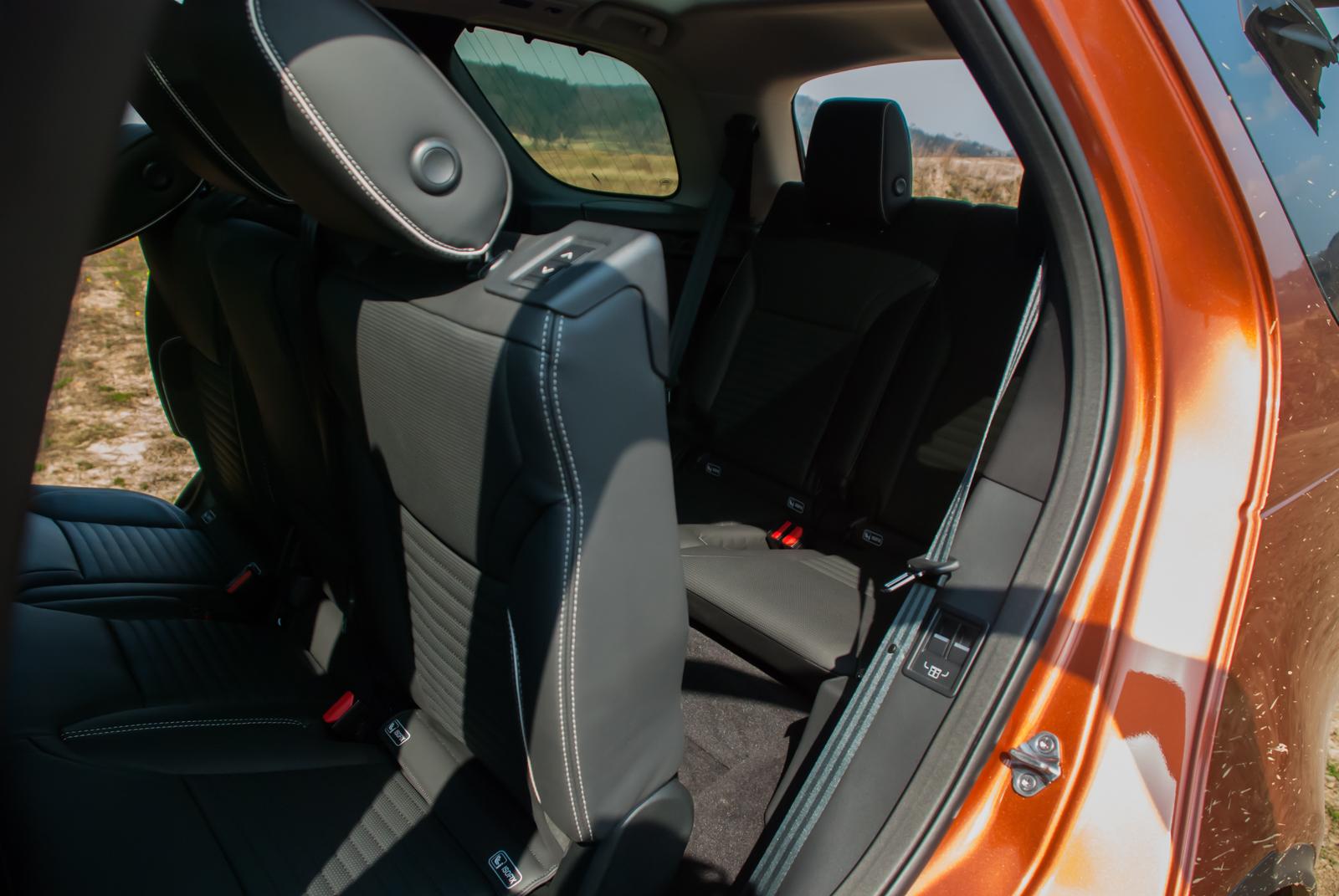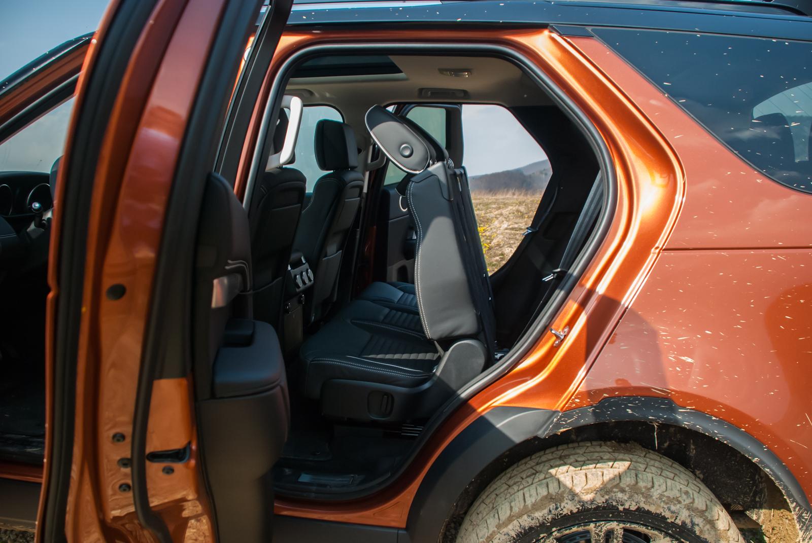 Nowy Land Rover Discovery występuje w wariancie siedmioosobowym. I faktycznie „w bagażniku” znajdziemy dwa pełnowymiarowe fotele. I nie mam tu na myśli małych krzesełek, albo fotelików dla dzieci, ale bardzo wygodne fotele normalnych rozmiarów. O dziwo jest tam też całkiem sporo miejsca na kolana, a mężczyzna o wzroście 186 centymetrów bez problemu zajął tam wygodną pozycję. Jedynym problemem jest dostanie się do tych miejsc. Oparcia drugiego rzędu siedzeń składają się elektrycznie, dając dostęp do tylnej części auta. Siedzisko tylnej kanapy musimy jednak przesunąć do przodu manualnie. Nawet po takim przemeblowaniu, otwór zapraszający pasażerów do trzeciego rzędu siedzeń przypomina rozmiarami dziurkę od klucza. W praktyce musimy wykonać długi krok pomiędzy oparciem kanapy a słupkiem C, które układają się w kształt litery V. Nijak nie da się tego zrobić szybko, a tym bardziej z gracją.