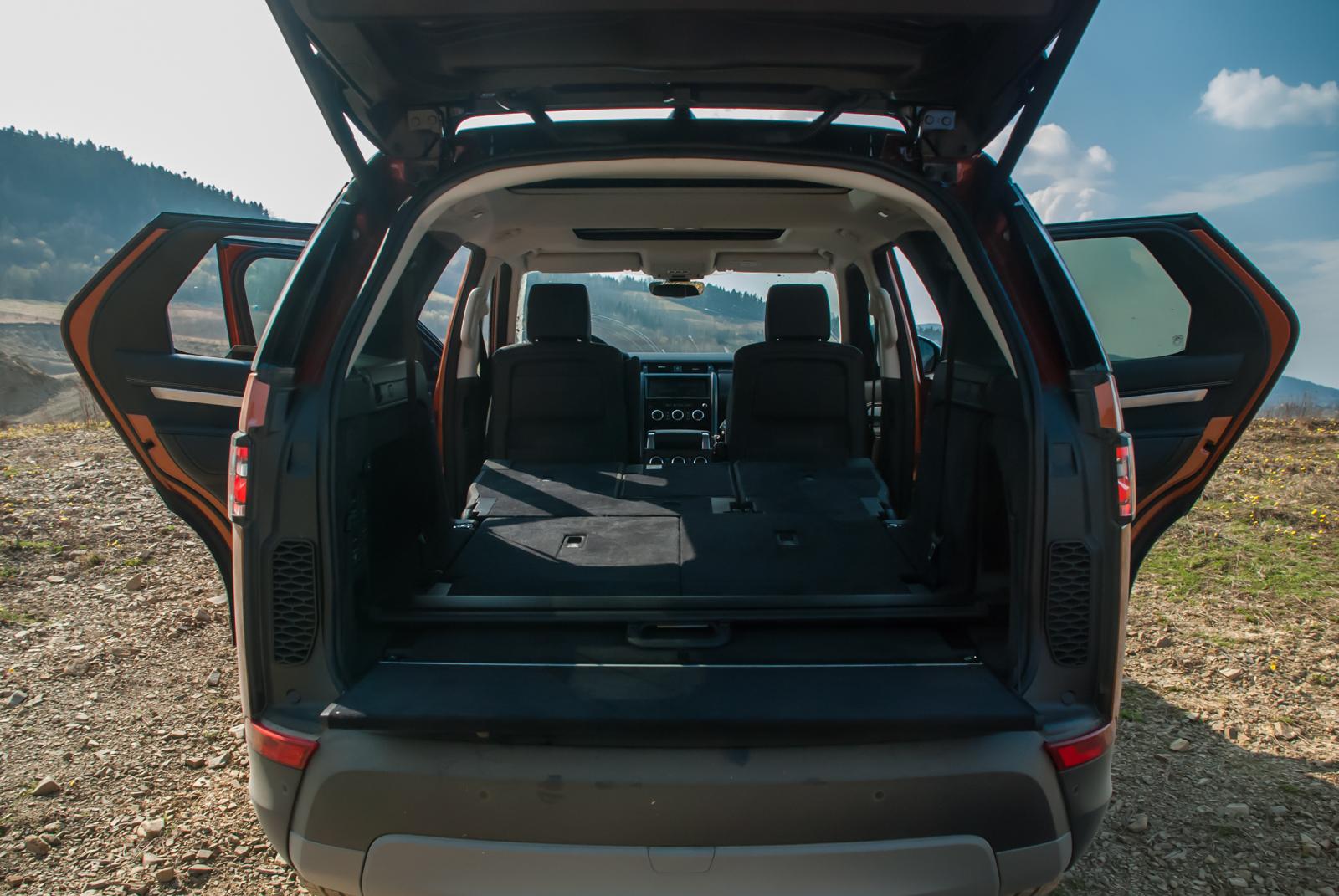 Decydując się na podróżowanie w siedem osób, niemal całkowicie pozbawiamy się przestrzeni bagażowej. Do dyspozycji zostaje nam bowiem jedynie 258 litrów. Chcąc jednak przetransformować Discovery z luksusowego SUV’a w auto o niemałej przestrzeni ładunkowej, wystarczy złożyć wszystkie fotele. Składają się elektrycznie i łącznie zajmuje im to 14 sekund. Wówczas otrzymujemy aż 2500 litrów przestrzeni bagażowej! Na dodatek, dzięki odpowiedniej aplikacji, możemy składać fotele zdalnie przy użyciu smartfona. Jeszcze będąc w sklepie czy w domu, możemy „kazać” Land Roverowi złożyć fotele, by po powrocie do auta od razu zająć się pakowaniem bagaży.