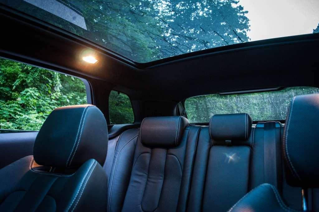 Wewnątrz jest co najmniej ciekawie. Wygodne, podgrzewane fotele ze skóry perforowanej można regulować elektrycznie, podczas gdy koło kierownicy dostosujemy ręcznie w dwóch płaszczyznach. Skóra na fotelach ma efektowne wzory z kilku paneli, w dodatku możemy wybrać jedno z kilku połączeń kolorystycznych. Do wykończenia deski rozdzielczej użyto ciekawego, piankowego materiału, którego praktycznym aspektem jest pochłanianie światła – nie musicie obawiać się o rażące światło odbite od deski rozdzielczej. Spasowanie elementów stoi na bardzo wysokim poziomie, dokładnie takim, jakiego oczekiwalibyśmy od samochodu z segmentu Premium. Wszystkie przyciski są w zasięgu ręki i w zasadzie nie ma większych problemów z odnalezieniem pojedynczych funkcji. Na środku konsoli znajduje się ekran systemu multimedialnego, który może nie jest rewelacyjny, ale znajdziemy w nim większość potrzebnych opcji. Łatwo sparujemy telefon przez Bluetooth, podejrzymy aktualny rozkład momentu między osie czy sprawdzimy ocenę ekonomiki jazdy z podziałem na m.in. hamowanie i przyspieszanie. Styliści postarali się też o takie detale, jak choćby wysuwające się po uruchomieniu silnika pokrętło zmiany biegów. Mała rzecz, a cieszy za każdym razem, kiedy wsiadamy do samochodu.