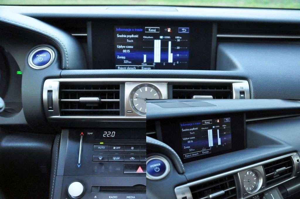 Po zmianie trybu na Sport (Plus) nasza biała owieczka dwoi się i troi, aby choć trochę przypominać wilka, ale nie wszystko da się zatuszować. Jest to nadal auto hybrydowe, które hamuje charakterystycznym oporem generatorów odzyskujących energię, a przyspiesza, odpalając silnik dopiero na trzecim metrze od startu. Gdzieś pomiędzy kierowcą a drogą siedzi rozsądny duch ekologa, który mi w ogóle nie przeszkadzał w Priusie, ale w drapieżnym nadwoziu IS 300h F-Sport Pan Ekolog mi zwyczajnie nie pasuje. Miłośnicy wyrazistego dźwięku spod maski nie będą również zadowoleni ze skrzyni CVT, która podczas przyspieszania wydobywa z silnika jednostajny dźwięk – w takich chwilach przydaje się dobrej jakości system audio i ulubiona rozgłośnia radiowa. Nie jest to oczywiście wina IS-a, tylko specyfika skrzyń CVT, ale ponownie - w Priusie czy nawet RX450h mi to nie przeszkadza, ale tu...