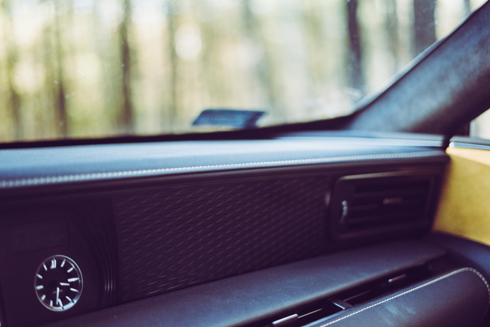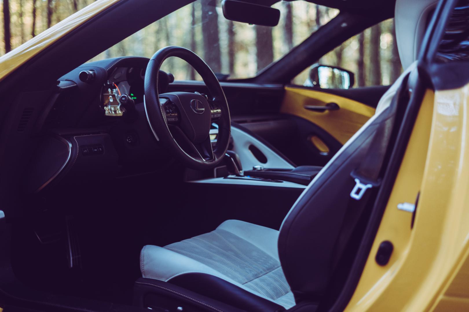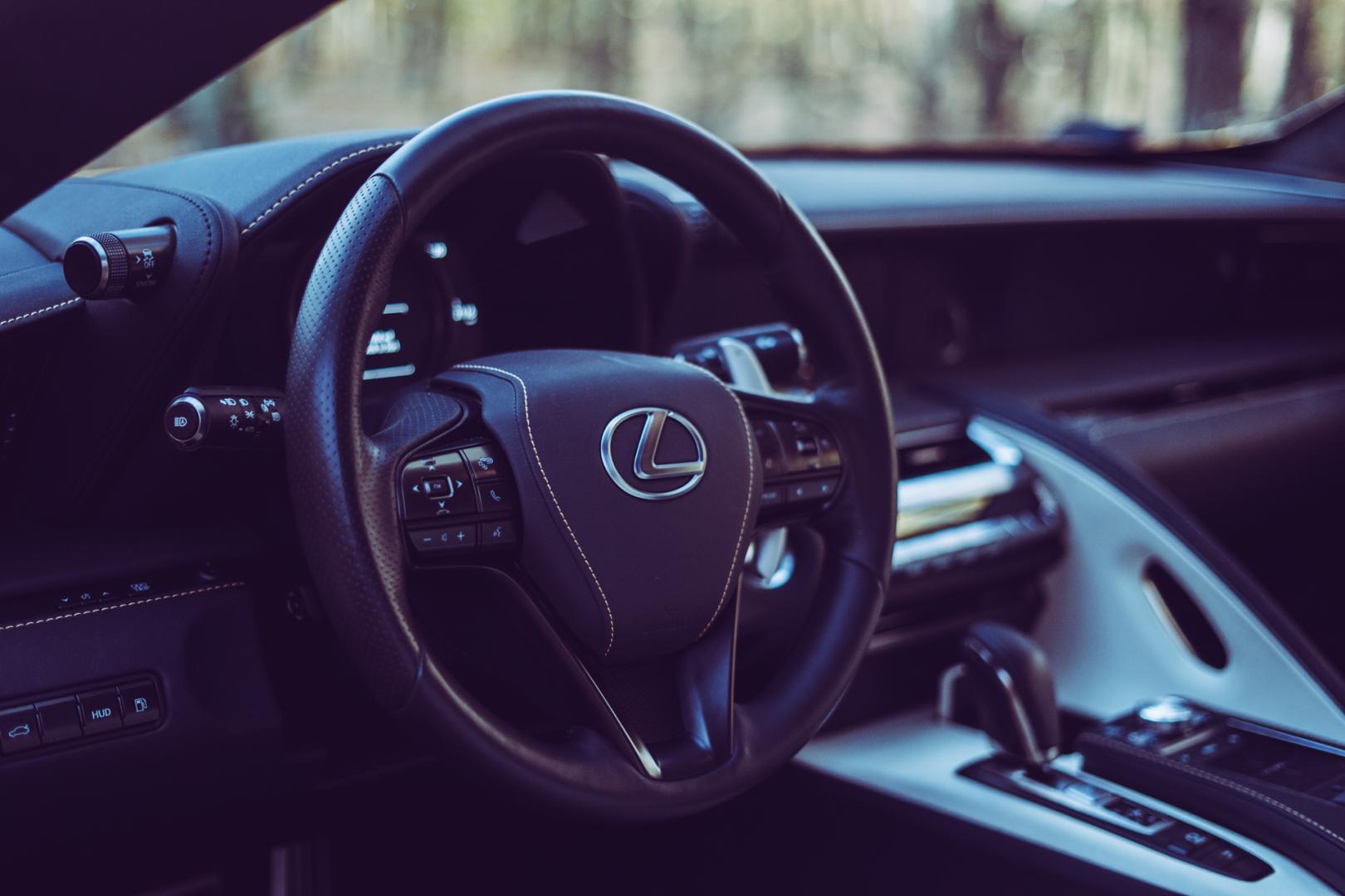 Lexusa LC doprowadzano do takiej perfekcji, że nawet nad kierownicą jeden mistrz siedział i zastanawiał się, jaki kształt jest idealny. Wyszedł kształt lekkiej elipsy, który podobno ma zapewnić największą kontrolę. Wskaźniki są zaraz na linii oczu. Piękne są także detale, jak na przykład żółte przeszycia na kierownicy i desce rozdzielczej.