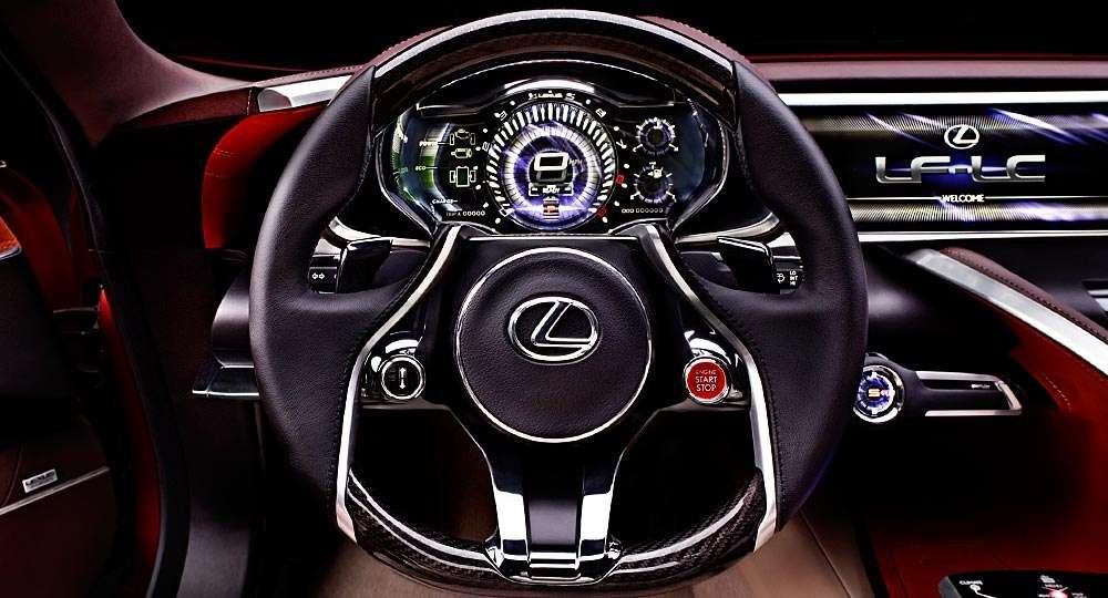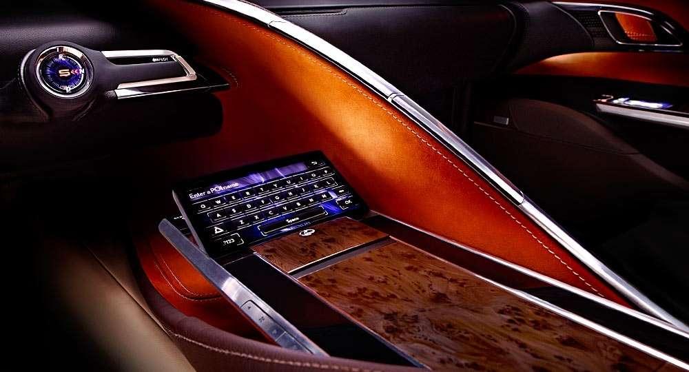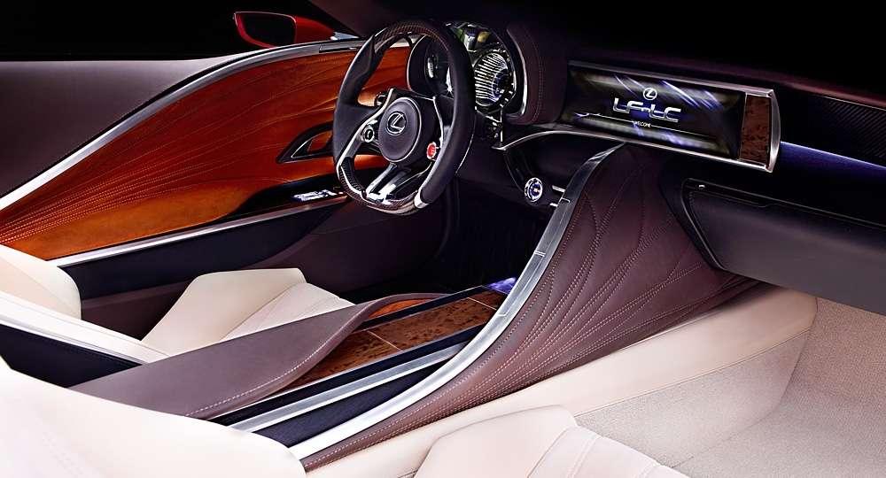 A co czeka nas we wnętrzu Lexusa LF-LC? Oczywiście luksus i przepych, a wszystko to zapakowane w futurystyczną, choć dość przyjazną i nieprzytłaczającą otoczkę. Rzecz jasna materiały wykorzystane do wykończenia wnętrza to najwyższej jakości skóra, drewno oraz metal, prawdopodobnie w postaci aluminium. Nie zabrakło również najnowocześniejszych rozwiązań elektronicznych. Auto wyposażone jest w wyświetlacz ze zdalnym sterownikiem dotykowym. Takie rozwiązanie umożliwia wygodne i intuicyjne sterowanie poszczególnymi funkcjami auta. Jakby tego było mało, na konsoli centralnej znajdują się dwa ciekłokrystaliczne ekrany o przekątnej 12,3 cala, które przekazują niezbędne informacje i wskazówki nawigacyjne.