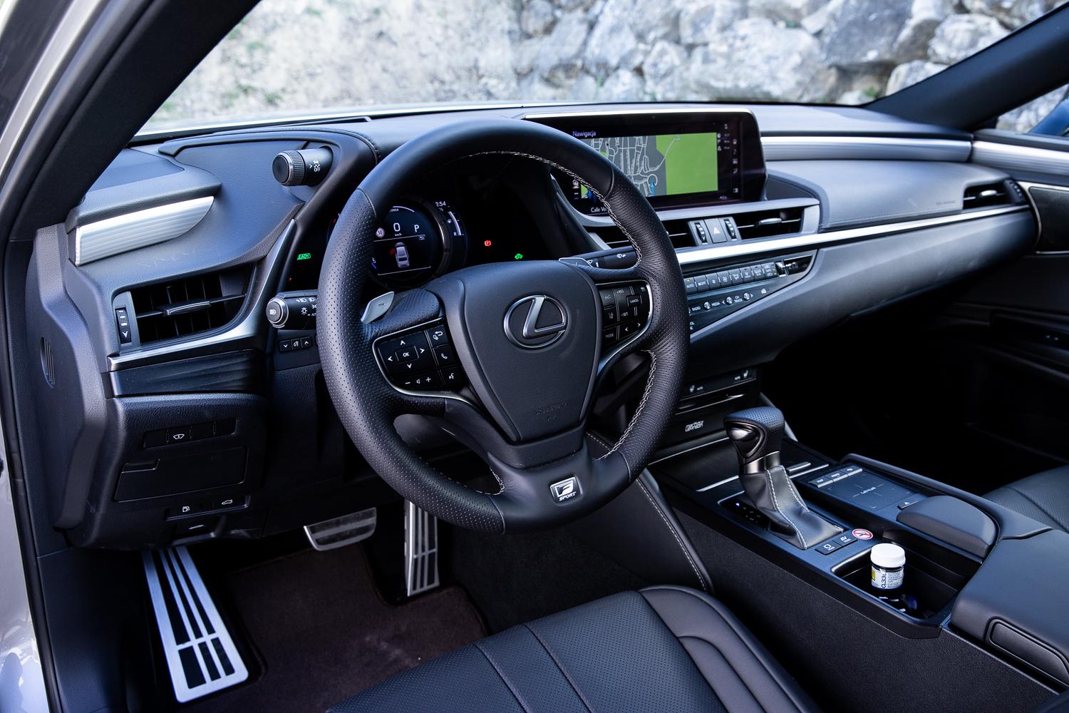 Po pierwsze, jakość materiałów wykończeniowych, która jest naprawdę bardzo wysoka. Spasowanie elementów deski rozdzielczej to kwestia, co do której nie należy mieć zastrzeżeń. Wnętrze Lexusa ES ma wiele wspólnego z flagowym modelem LS, na przykład: kształt kierownicy, manetki w daszku deski rozdzielczej do sterowania trybami jazdy i kontrolą trakcji (wymagają chwili przyzwyczajenia) czy ekran systemu multimedialnego z wbudowanym analogowym zegarem.