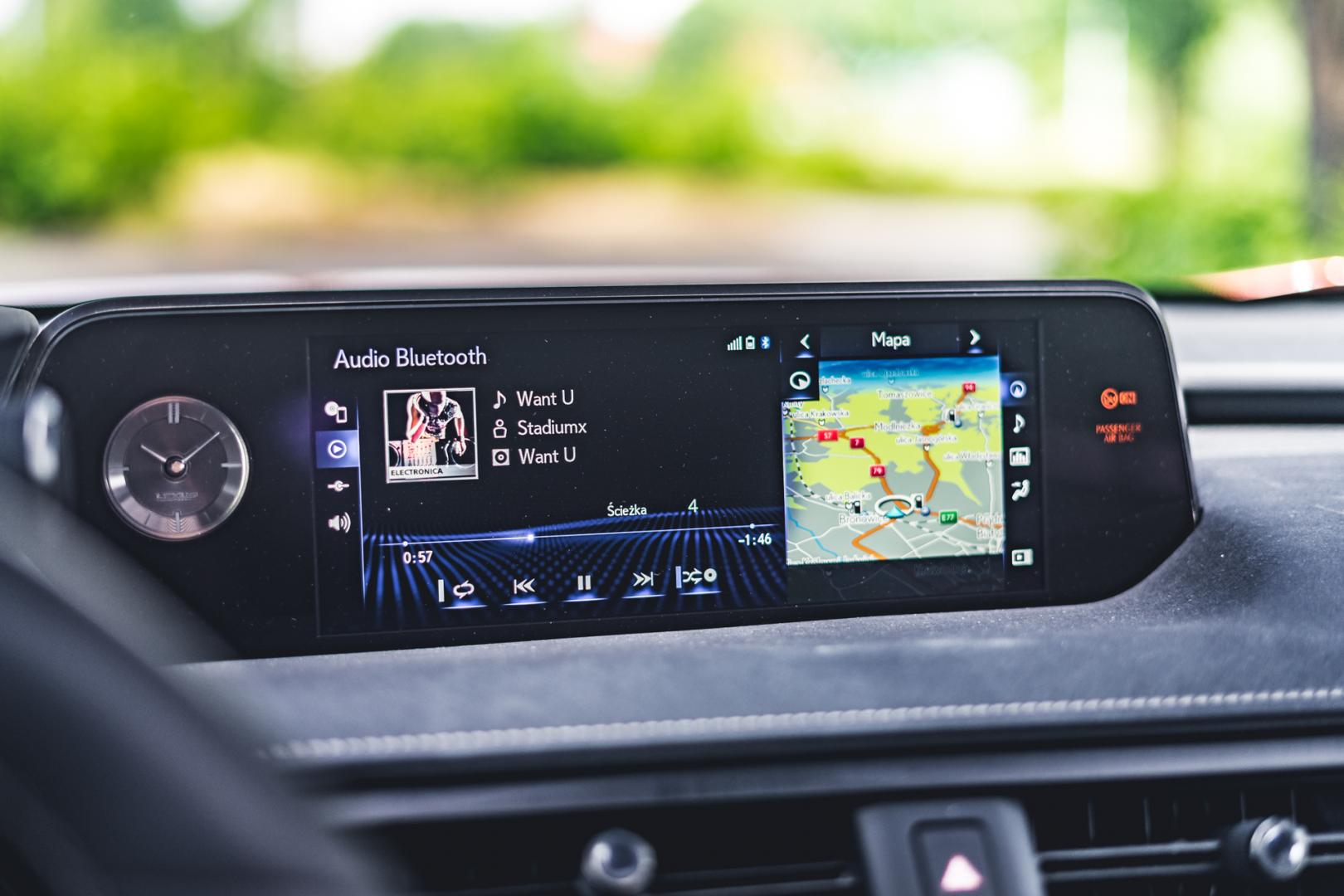 Nowy system multimedialny Lexus Premium Navigation występuje podstawowo z 7-calowym wyświetlaczem, ale możemy też wybrać wyższą wersję z wyświetlaczem o przekątnej 10,3 cala. Jak to w Lexusie, w opcji jest też system audio Mark Levinson dla audiofilów – odtwarza bezstratne formaty dźwięku, ma odtwarzacz CD i tak dalej. System Lexusa w końcu dostał też obsługę Apple CarPlay. Niestety, nadal obsługujemy go tym touchpadem, który nie był i nie jest wybitnie wygodny.