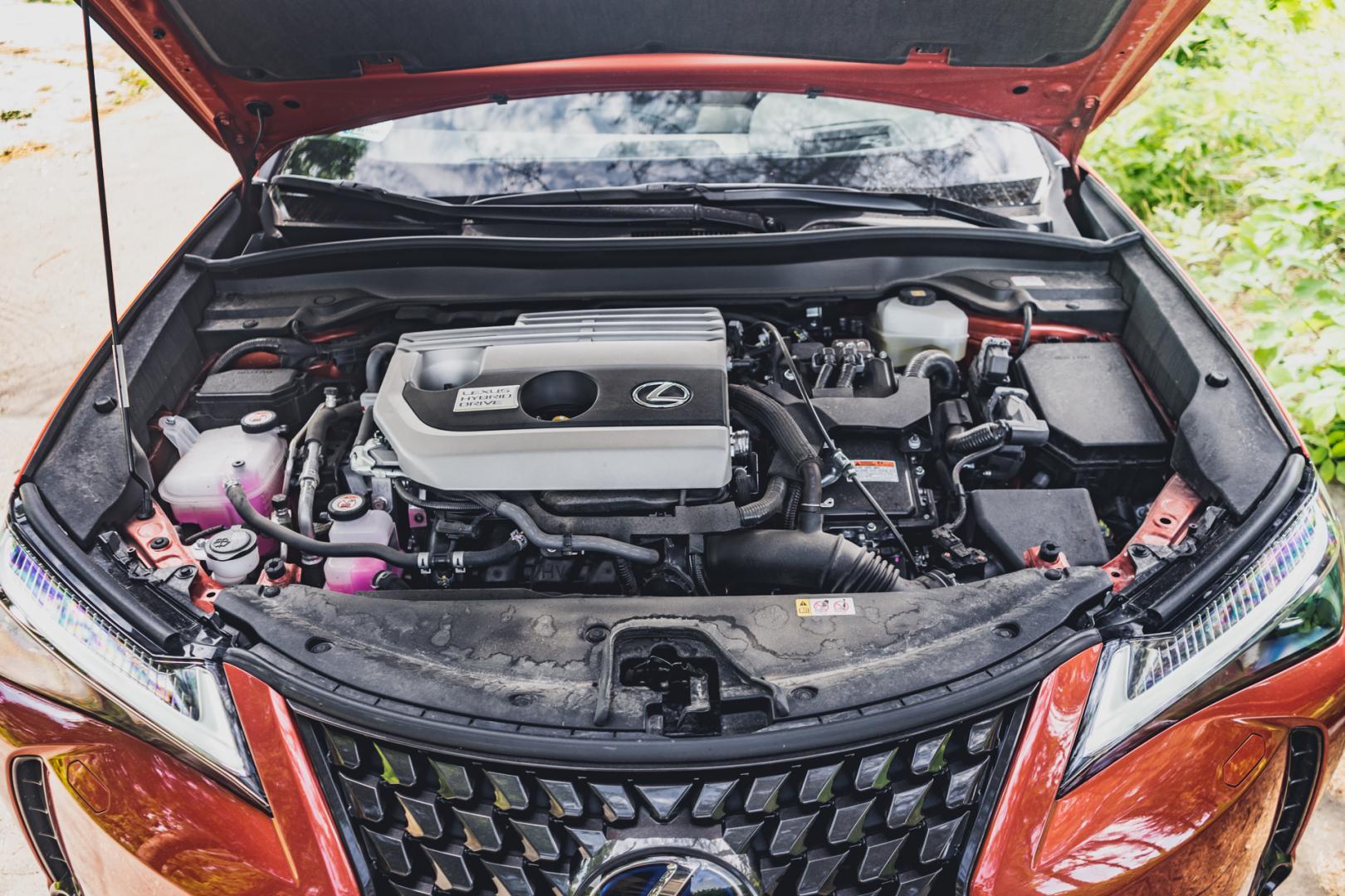 Lexus UX występuje w dwóch wersjach silnikowych – 200 i 250h. 200 to 2-litrowa benzyna o mocy 171 KM, a 250h to hybryda o łącznej mocy 184 KM. W wersji hybrydowej znajdziemy pod maską 2-litrowy silnik wolnossący o mocy 152 KM, do tego dochodzi silnik elektryczny o mocy 109 KM i jeśli wybierzemy wersję z napędem E-Four, czyli na cztery koła, to dostajemy jeszcze przy tylnej osi kolejny silnik o mocy 7 KM. W wersji, którą testujemy, czyli z napędem na przednią oś, Lexus UX do 100 km/h samochód rozpędza się w 8,5 sekundy, ale maksymalnie pomknie jedynie 177 km/h.