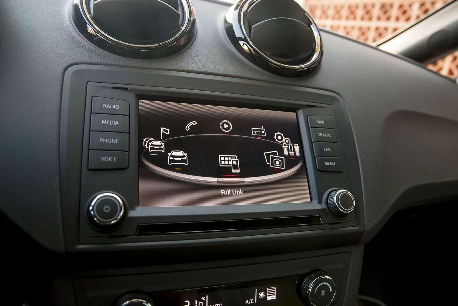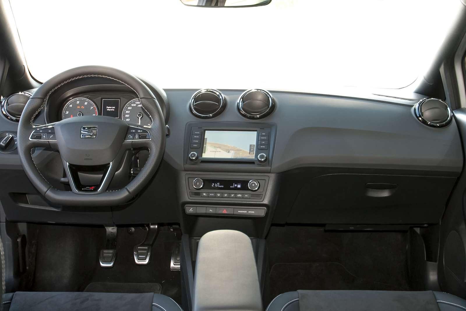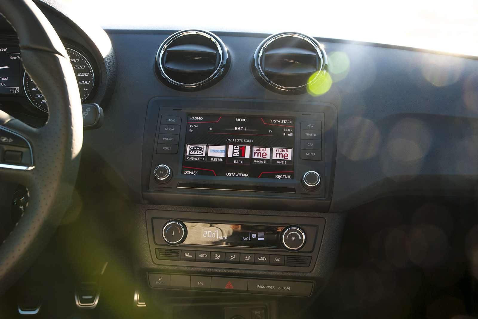 Choć pod względem silnikowym Seat stawił czoła obowiązującym trendom, wnętrze na szczęście idzie z duchem czasu. Ibiza Cupra wreszcie doczekała się swojego centrum multimedialnego. Nie jest to może najważniejszy element wyposażenia auta, jednak archaiczne radio poprzedniczki budziło pewien niedosyt. Tradycyjny system operacyjny Seata został wzbogacony o funkcję Mirror Link. Po zsynchronizowaniu smartfona z samochodem, możemy dyktować mu maile i smsy.
