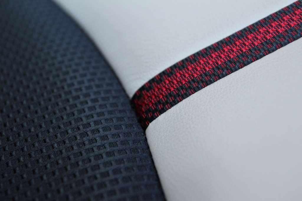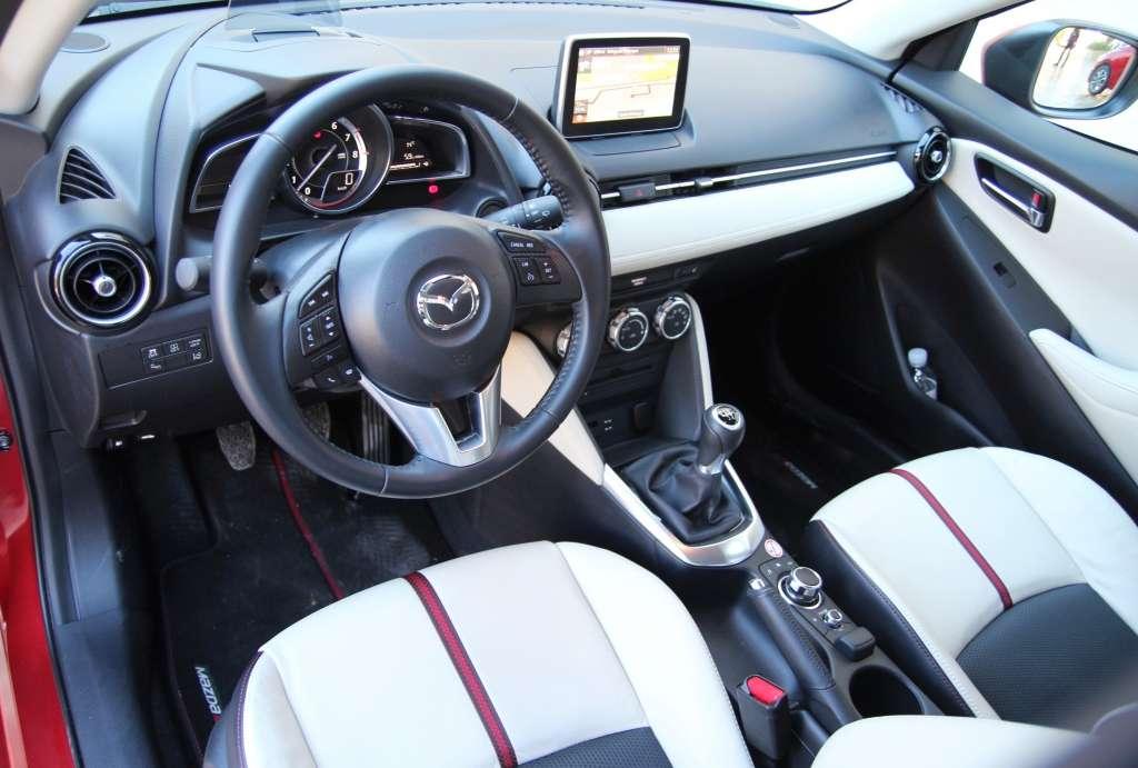 Po spartańskiej kabinie poprzedniej Mazdy 2 ślad nie pozostał. Wnętrze nowego samochodu urzeka wysmakowaniem. Najlepsze wrażenie robi flagowa wersja SkyPassion z opcjonalnym pakietem Off White, czyli skórzanym wykończeniem foteli, boczków drzwiowych i deski rozdzielczej. Ale również w tańszych wariantach jest na czym oko zawiesić. Wystarczy wspomnieć o okrągłych dyszach nawiewu, metalizowanych wstawkach, plastikach o strukturze włókna węglowego czy 7-calowym ekranie systemu multimedialnego. Wizualnie Mazda 2 nie blednie nawet w konfrontacji z dobrze skompletowanym Audi A1. Estetyka wnętrza ułatwia pogodzenie się z przeciętną jakością tworzyw – z miękkiego materiału wykonano podłokietniki i fragmenty tapicerki drzwi.