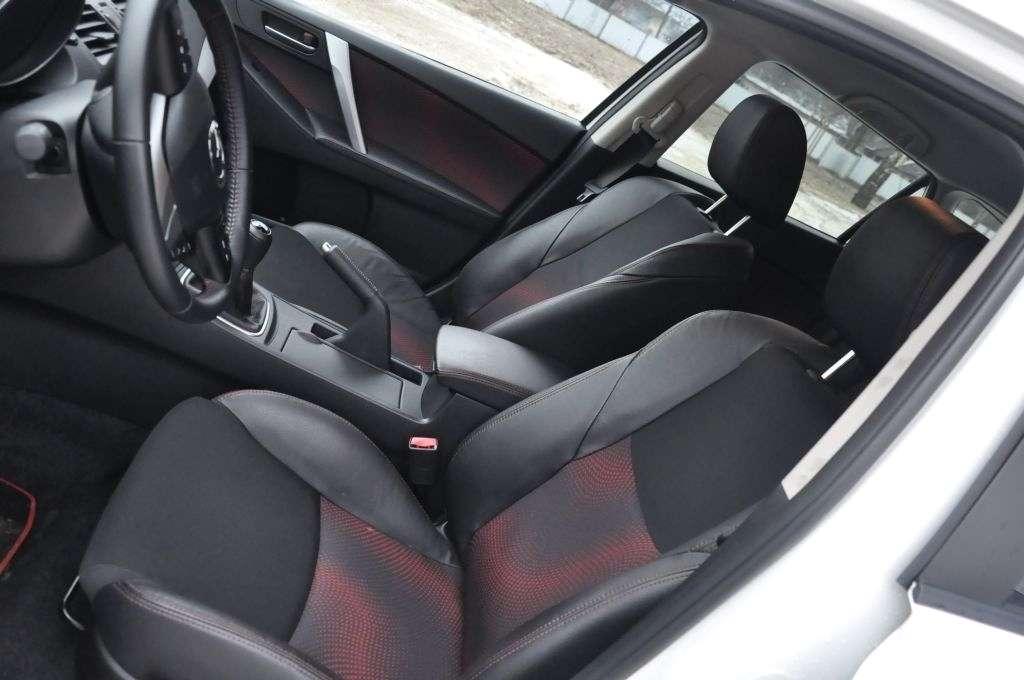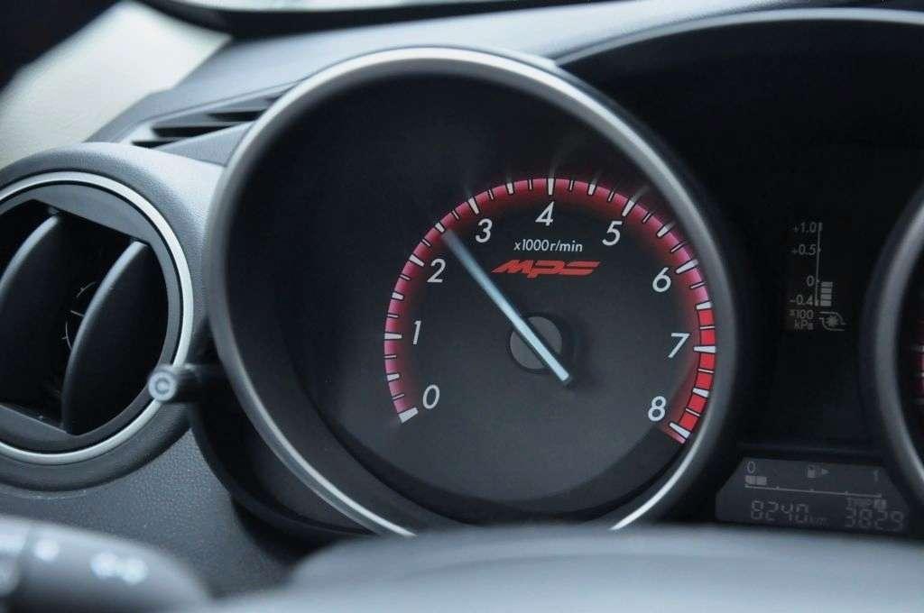 By trochę siebie usprawiedliwić dodam, że wygląd zewnętrzny, a wewnętrzny w Mazdzie to również duży kontrast. Tak jakby ktoś przyglądał się swojemu odbiciu w rozbitym lustrze. Smutne plastiki oraz fotele z symbolicznym trzymaniem bocznym dają raczej obraz niedokończonego tuningu, niż adekwatnie sportowego charakteru wnętrza. Projektant zalecił umieścić logo MPS w tubie obrotomierza, wskaźnik ciśnienia na turbinie pomiędzy zegarami, a nawet kazał przeszyć tapicerkę foteli czerwoną nitką, ale w tym momencie ktoś go zawołał na przerwę śniadaniową, a po niej musiał zająć się czymś innym i… tak już zostało.