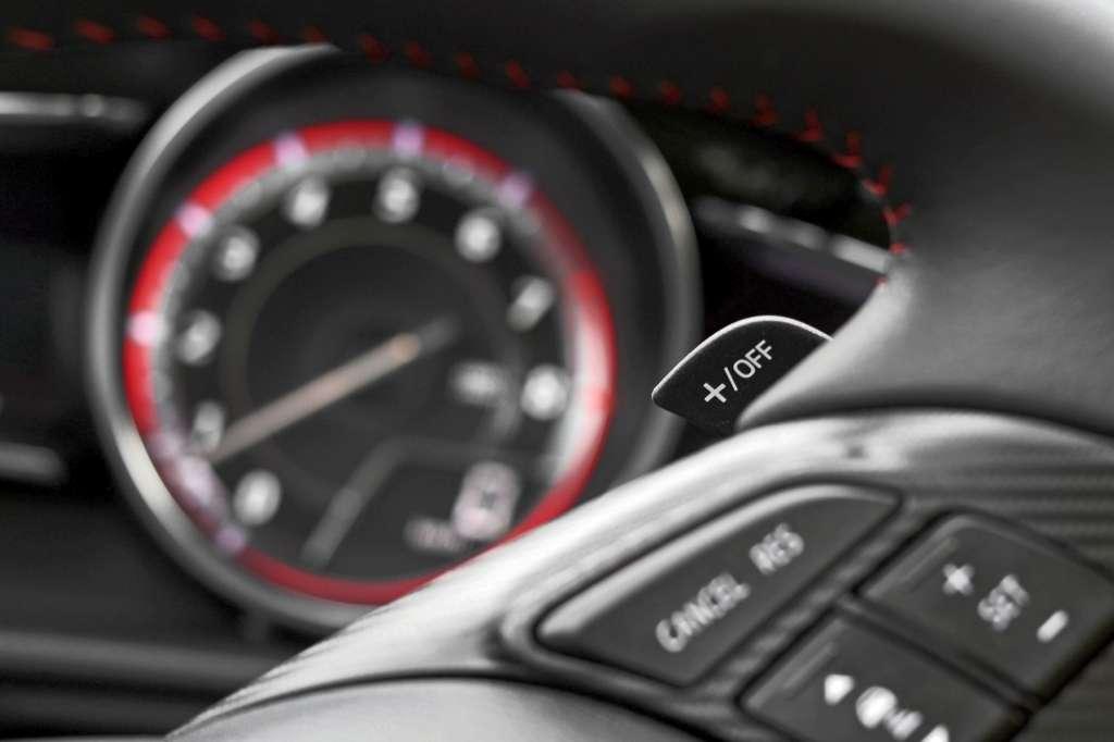 Przed oczyma kierowcy znajdują się czytelne zegary, z których tylko centralny obrotomierz (niczym w Porsche) jest analogowy. Wskaźnik poziomu paliwa oraz niewielki prędkościomierz są cyfrowe. Dodatkowo prędkość, ustawienia tempomatu oraz asystenta pasa ruchu mogą być wyświetlane na wysokości oczu kierowcy na szybie. HUD w aucie kompaktowym nienależącym do segmentu Premium? Jeszcze kilka lat temu była to rzecz nie do pomyślenia, ale jak widać świat i Mazda idą do przodu.