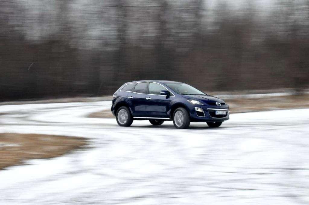 Nowe amortyzatory i zwiększona sztywność nadwozia sprawiają, że kierowanie CX-7 przypomina jazdę zwykłym autem osobowym ze sportowymi ambicjami – płynnie i pewnie sunie po drodze i tak chętnie reaguje na polecenia kierownicy, że prowokuje do sprawdzania swoich możliwości. Nie warto jednak zapominać o znacznie wyższym od osobówek środku ciężkości. Jeden z manewrów z szybką zmianą pasa z pełnym gazem skończył się wyraźną nadsterownością, którą zawieszenie zdołało opanować, zanim opony zaczęły piszczeć a systemy stabilizujące tor jazdy migać diodami na zegarach - nie musiałem nawet kontrować. Egzamin zdany na piątkę. Także i na gorszej drodze auto spisuje się dobrze – mimo szerokich walców-opon, koleiny nie wyrywają kierownicy z rąk. Mazda wspaniale trzyma się drogi i nie wymaga zbyt wiele od kierowcy - jedynie na śniegu i lodzie daje o sobie znać ciężki silnik wysokoprężny, który w zakręcie wyraźnie ściąga przód auta na zewnątrz zakrętu.